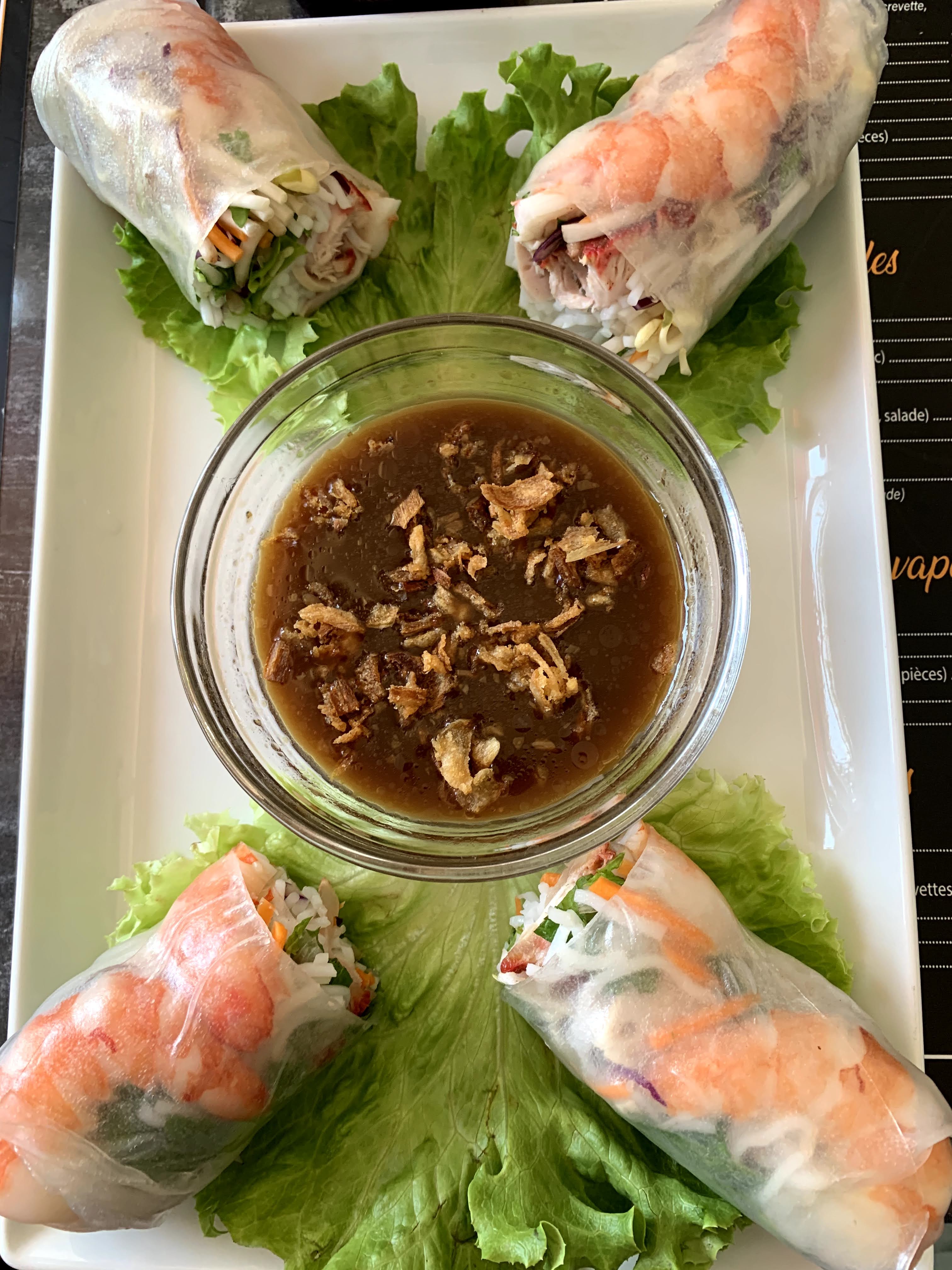 Toutes les soupes sont superbes 🤩 Elles sont souvent accompagné d’herbes asiatiques 👌🏻 Les rouleaux de printemps ont plusieurs viandes contrairement à bcp d’autre restaurant.. ici crevette 🍤 porc 5 parfums et mortadelle, sauce Hoisin maison. Le serveur est un peu froid mais efficace pas de fioritures ➰ droit au but 🥅 ☑️ Je vous conseille de choisir le grand format pour les soupes 🍜 Repas de qualité,frais et consistant 💯
