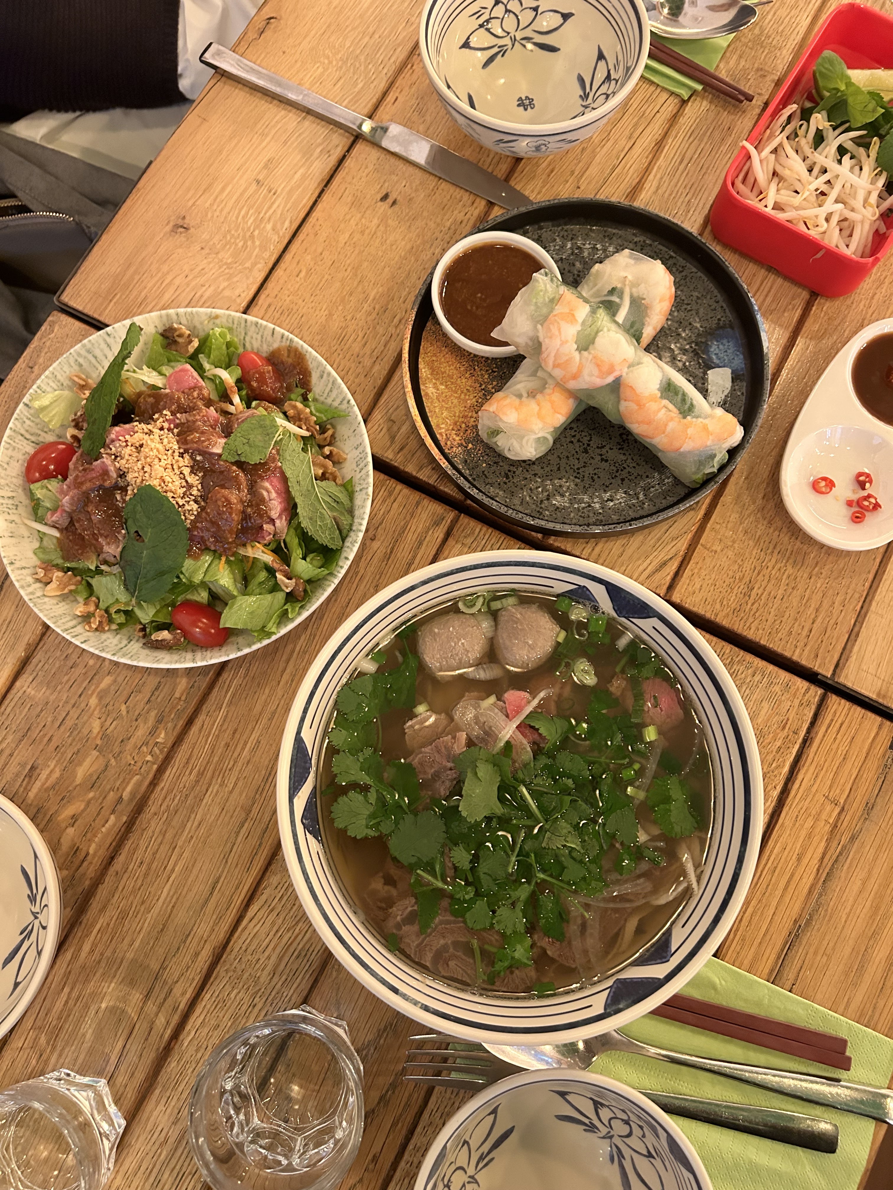 Très bon restaurant vietnamien ! (validé par mon petit copain vietnamien haha). On est arrivés là-bas vers 15h30/16h et ils servaient encore ! Les gyozas et les nems étaient super bons, et le plat de nouilles sautées encore plus ! On a été servi super vite vu qu'il était tard mais tant mieux. Mis à part le serveur pas forcément très enthousiaste ni très souriant l'ambiance était bonne, les plats bons, le restaurant bien décoré et surtout des prix très raisonnables !!! On a payé 50€ pour deux entrées, deux plats et deux desserts ! Un très bon rapport qualité prix. Je recommande.