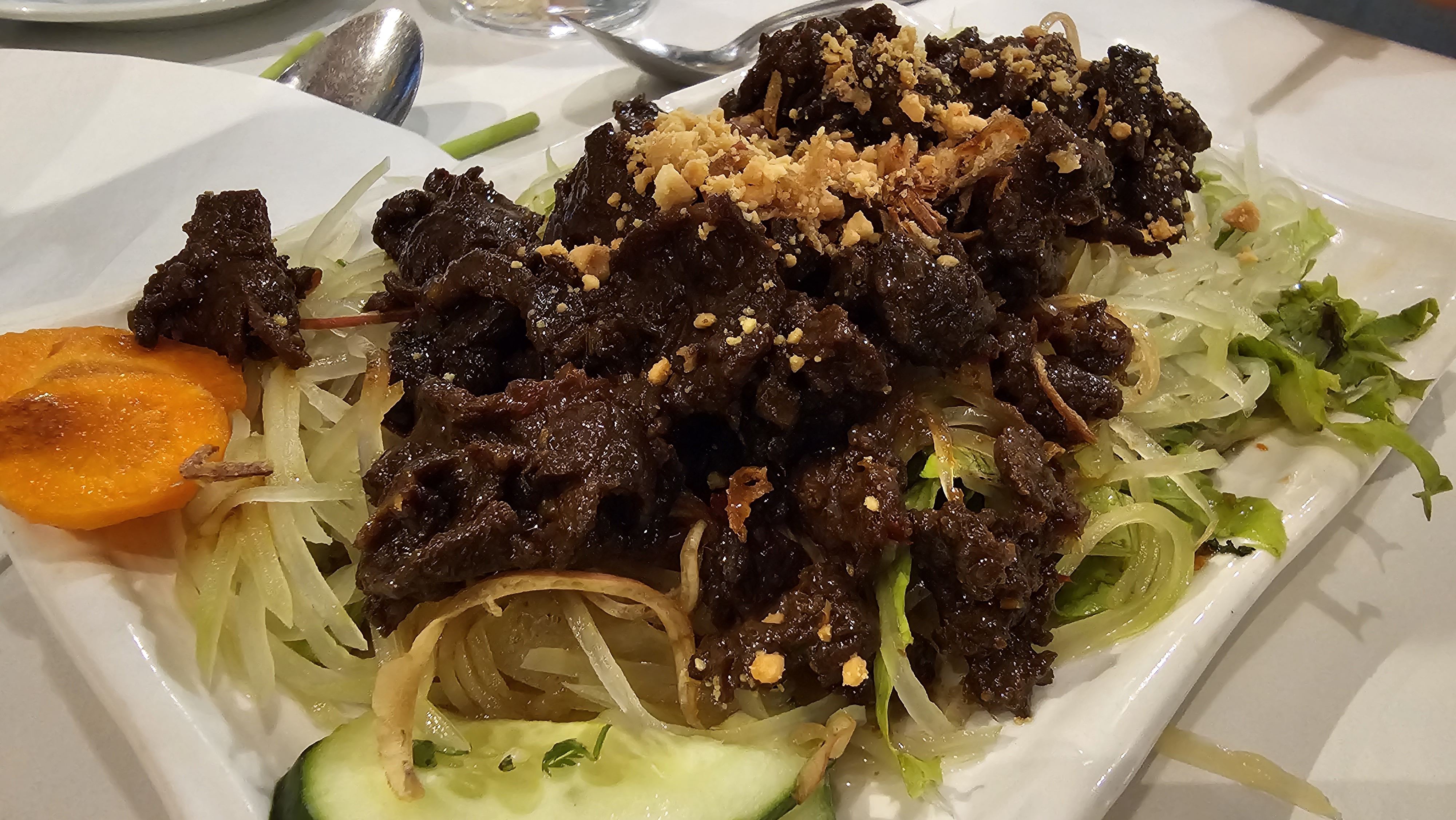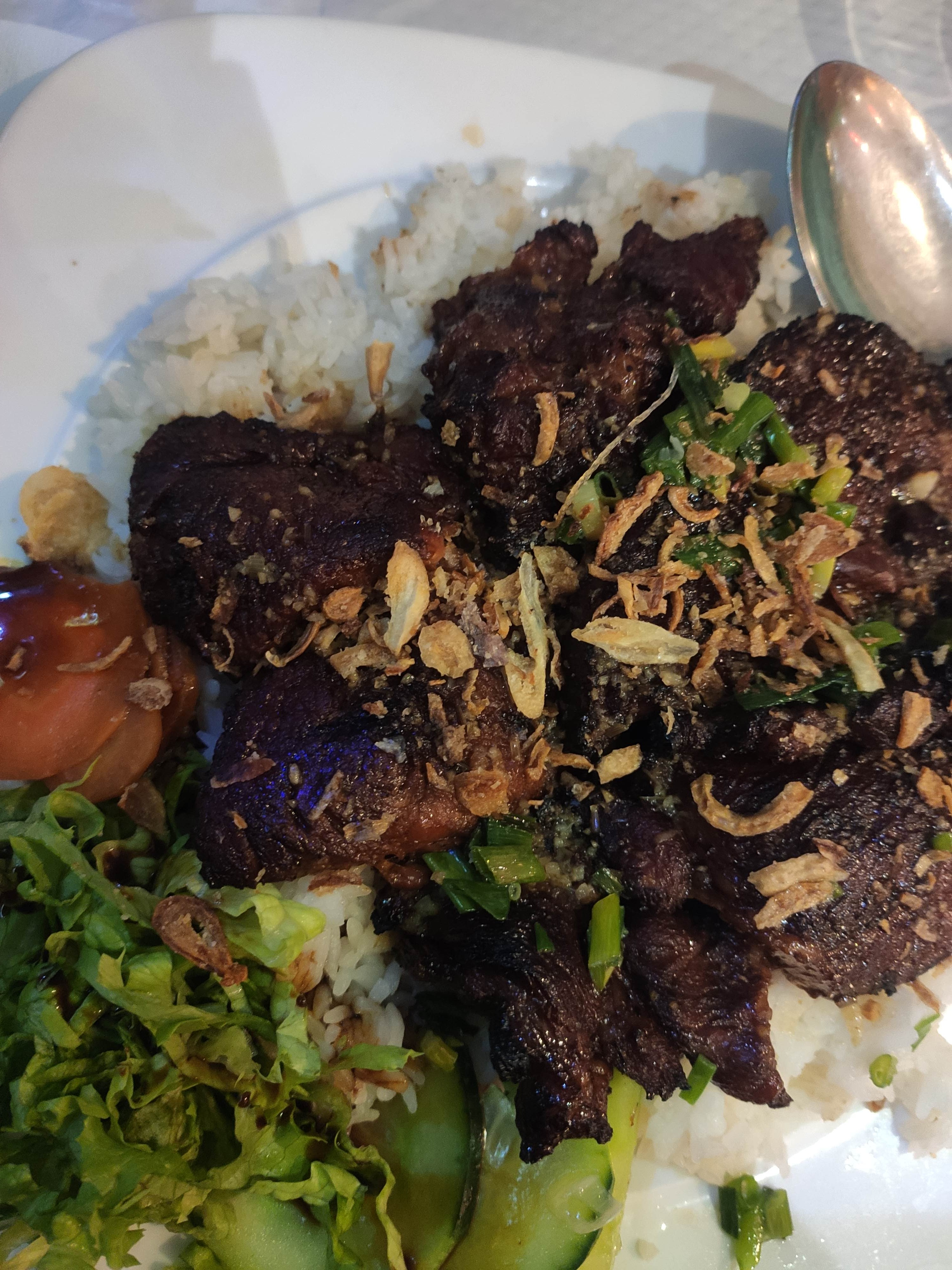 Un peu déçu par mon expérience, j’ai choisi ce restaurant car il était bien noté mais malheureusement niveau goût ce n’était pas trop ça.. J’ai mangé un loc lac mais la viande était très très sucrée.. C’est dommage ! Le personnel était sympa.