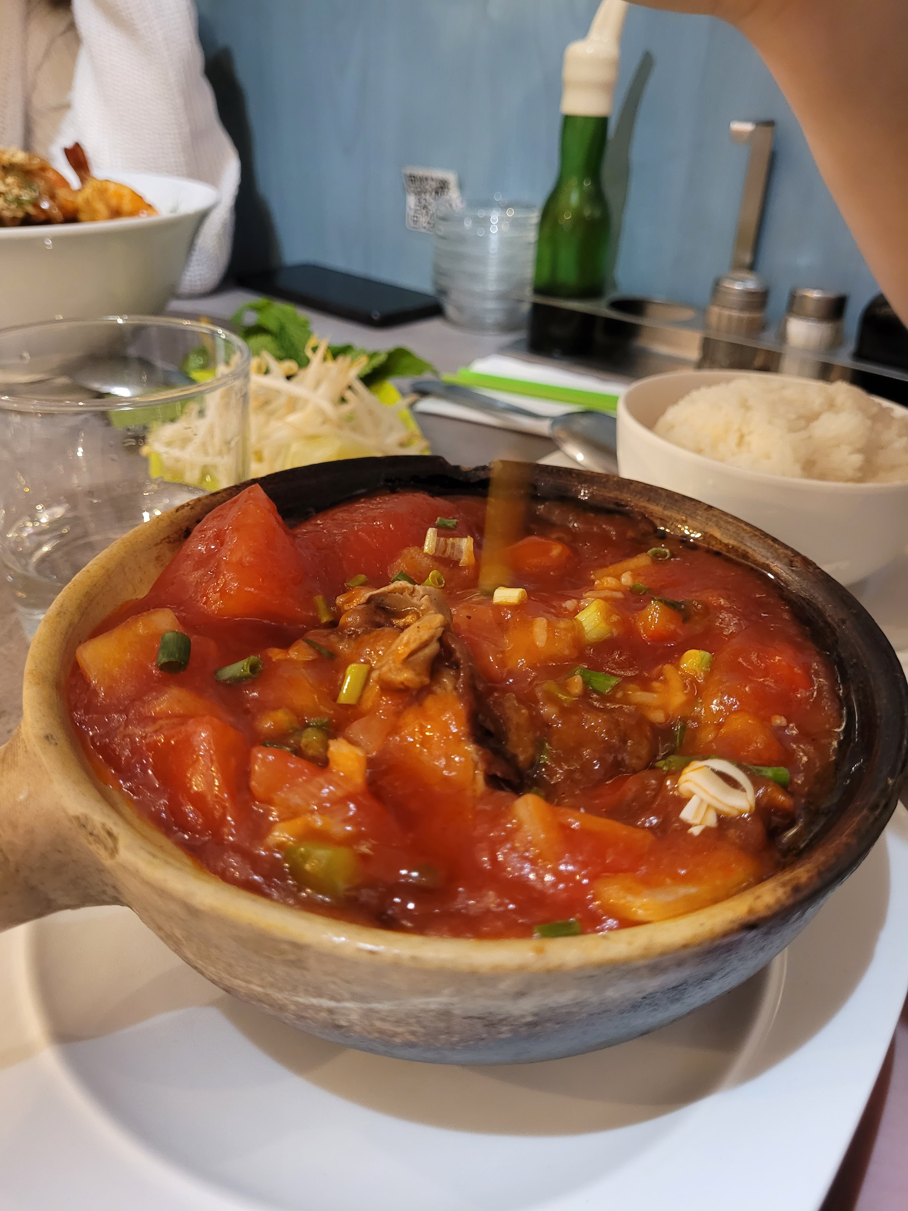 J'amairais bien mon plat (marmite au canard du mangue), mais le service c'était pas parfait. Les plats n'ont pas arrivé à la même temps, donc nous avons pu manger aux temps différents, ou le première personne à pu attendre pour tout le monde et mange un plat un peu froid. Dommage, parce que mon plat était vraiment délicieux.
