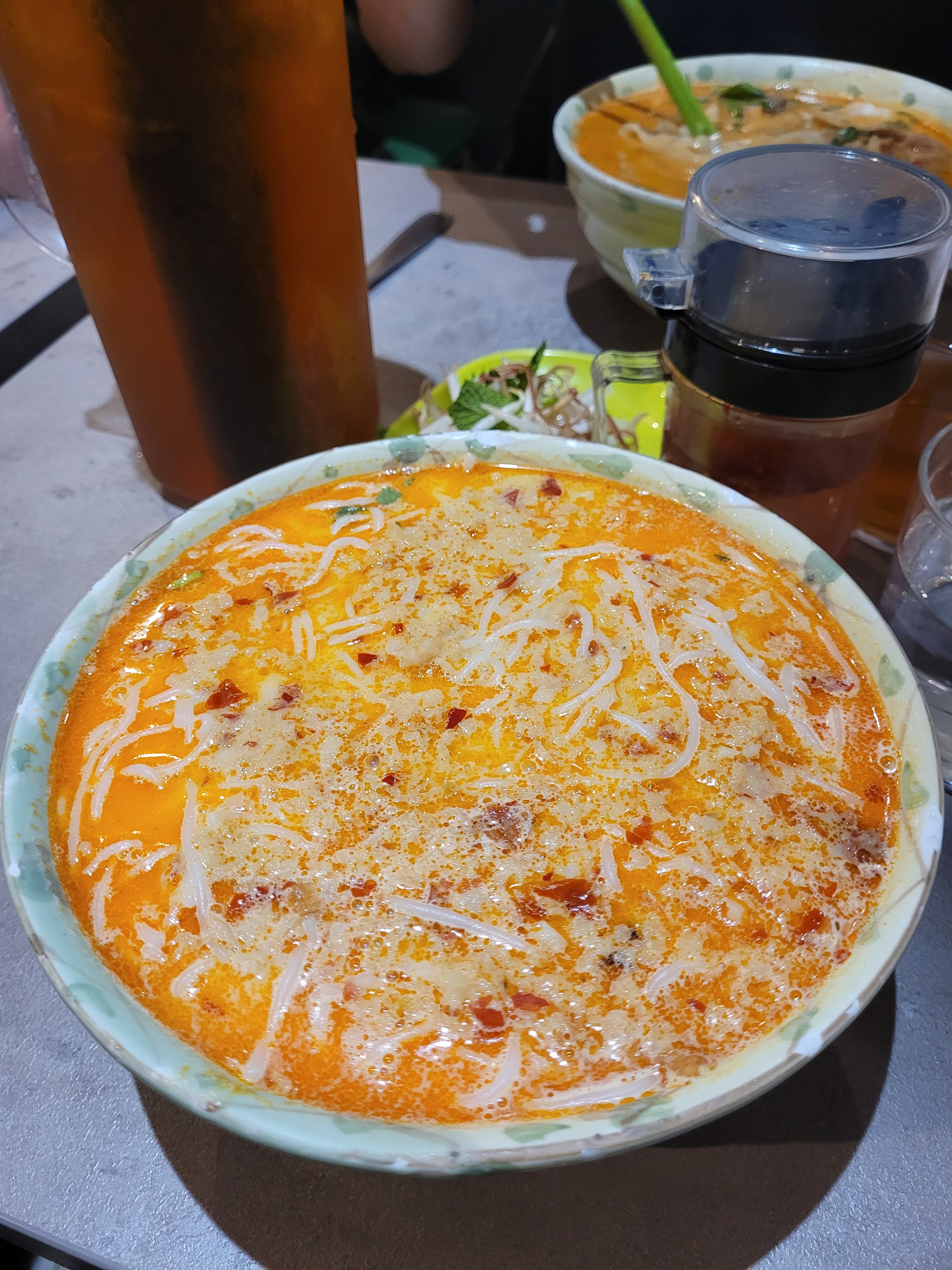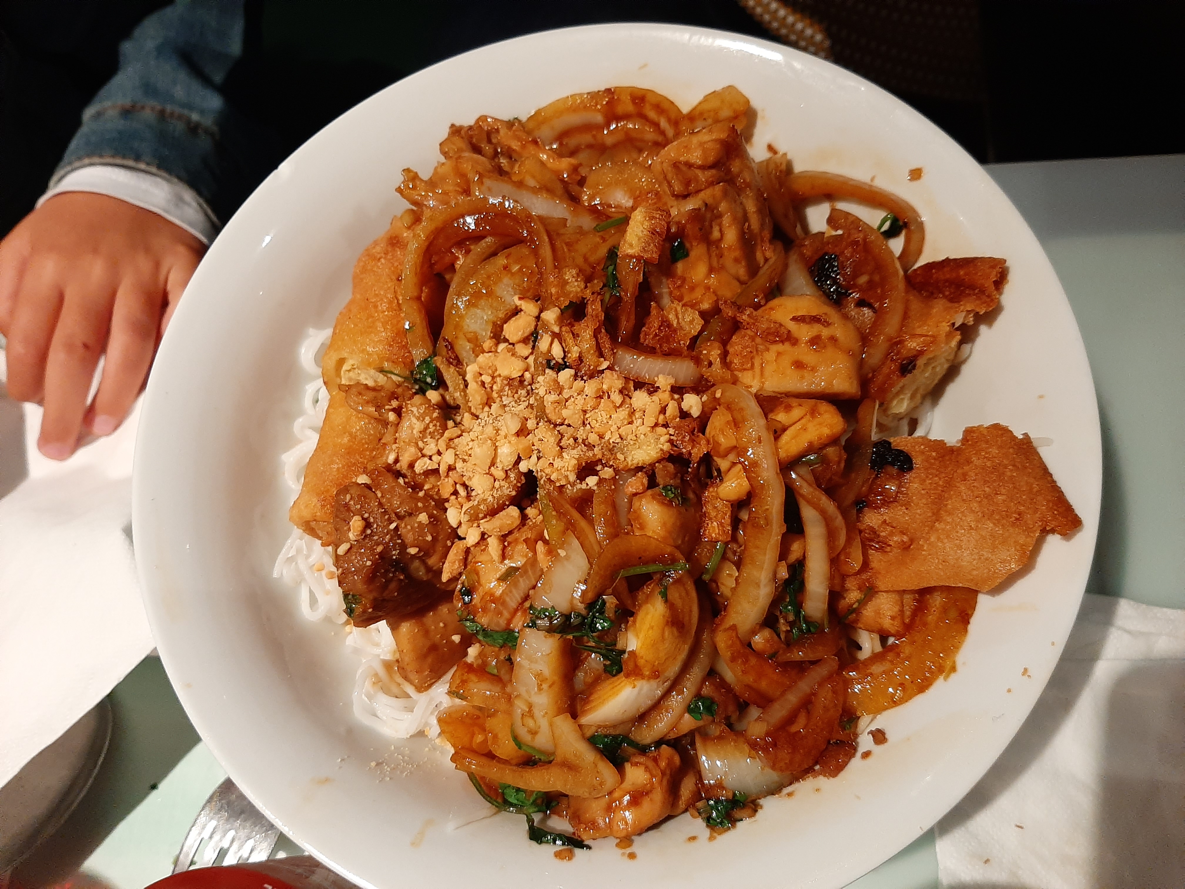 J'ai pris le bobun poulet. J'ai été surpris car, contrairement à beaucoup d'avis qui m'avaient amenés à choisir ce restaurant, je n'y ai pas trouvé de saveur particulièrement marquante. Même, j'ai trouvé le plat fade à mon goût: il manquait des herbes aromatiques, c'était un peu trop gras, les pâtes épaisses prenaient trop de place, les nems étaient compacts. Le tout était servi un peu trop chaud selon moi. Néanmoins, il y avait de la quantité pour 2 même pour un gros appétit, et les plats des tables adjacentes avaient l'air bons ! Autre point positif : les serveurs gentils ! Merci :)