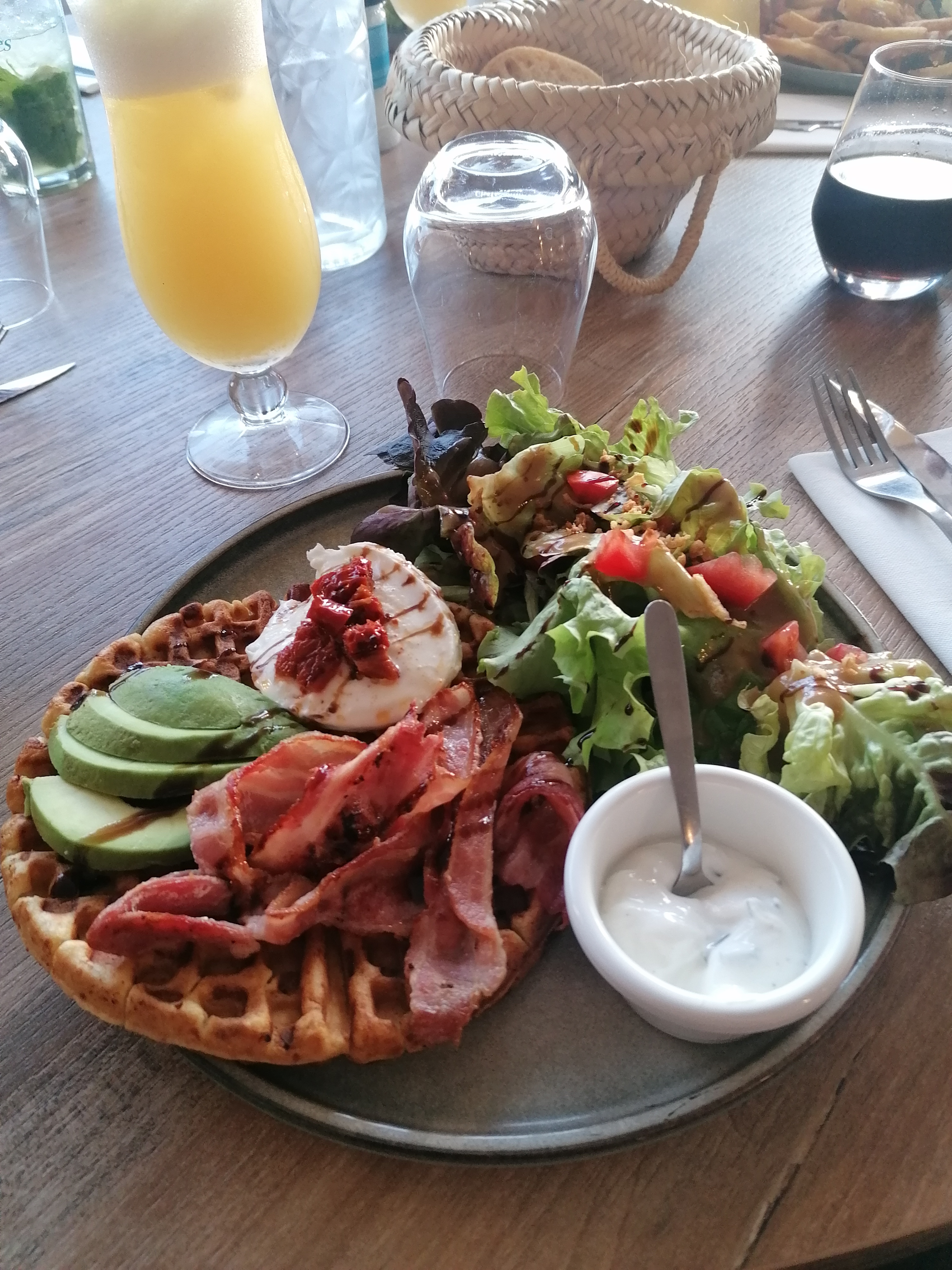 Nous avons été manger cherchant un repas pas trop copieux après un gros petit déjeuner le matin et avons trouvé des plats dans ce restaurant mais pas d'entrée ou dessert car ça l'était tout de même 😛. La gaufre salée est clairement faite maison avec un très bon goût elle était malheureusement un peu sèche, probablement un peu de surcuisson je n'ai pas dû avoir de chance, l'avocat n'étant pas mûr je retenterai une autre fois afin de voir si mon avis se confirme car ça paraissait une très bonne idée. Le lieu est bien situé mais avec tout ouvert impossible d'échapper aux fumées des fumeurs même s'ils étaient en extérieur et nous loin, le vent ramène toutes les odeurs pendant le repas, on tentera en période plus creuse !