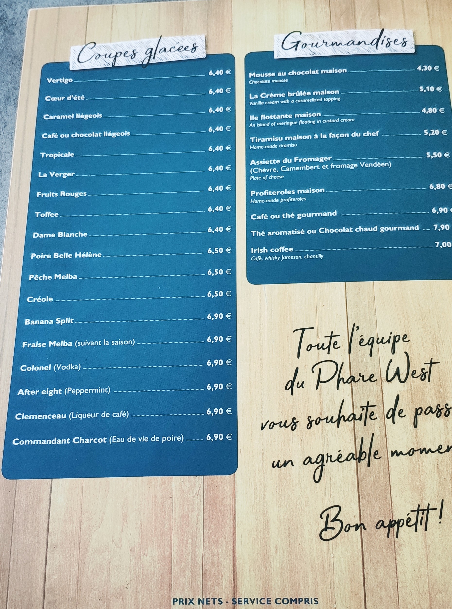 Terrasse agréable et ensoleillée. Menu enfant simple et efficace. Une salade phare west copieuse et gourmande. Le personnel est sympathique. Nous avons passé un super déjeuné avant de profiter de la plage qui se trouve à deux pas !