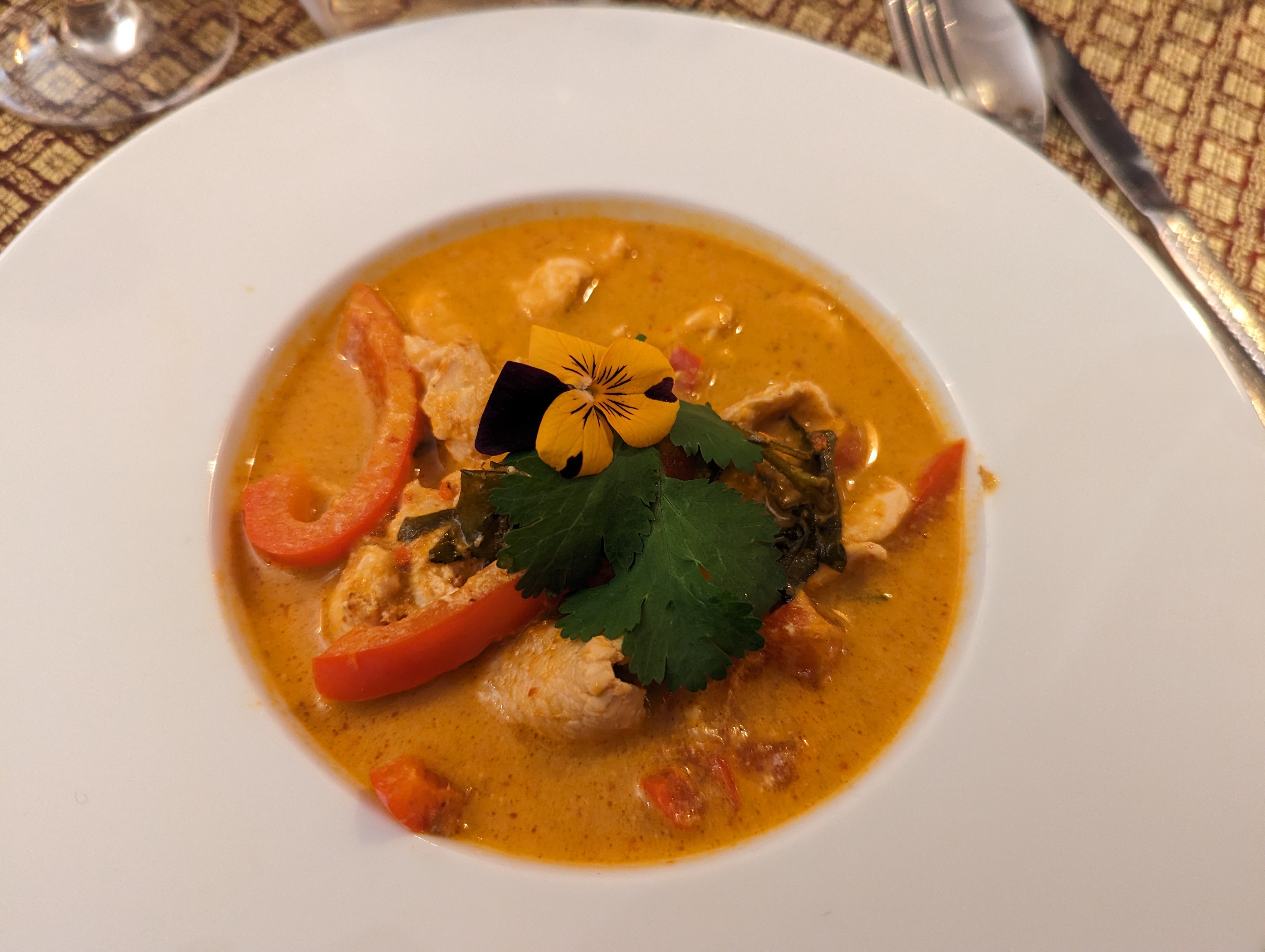 Cocktail délicieux (pinacolada revisitée avec des épices thaï). Jolie carte de plats préparés au moment-même de la commande ce qui garantit la fraîcheur même si forcément cela rend le service plus lent. Un samedi soir à 19h30, comptez 2h30 pour dîner. Les saveurs sont au rdv. Le degré d’épices est évalué à la commande et pour ma part c’était juste parfait. Les plats sont joliment présentés. Les prix sont raisonnables (125€ pour 2 adultes et 1 ado). Le patron est au service. Sympathique, courtois et attentionné. Seul bémol : passées les 21h, une fois la salle remplie, cela devient bruyant…
