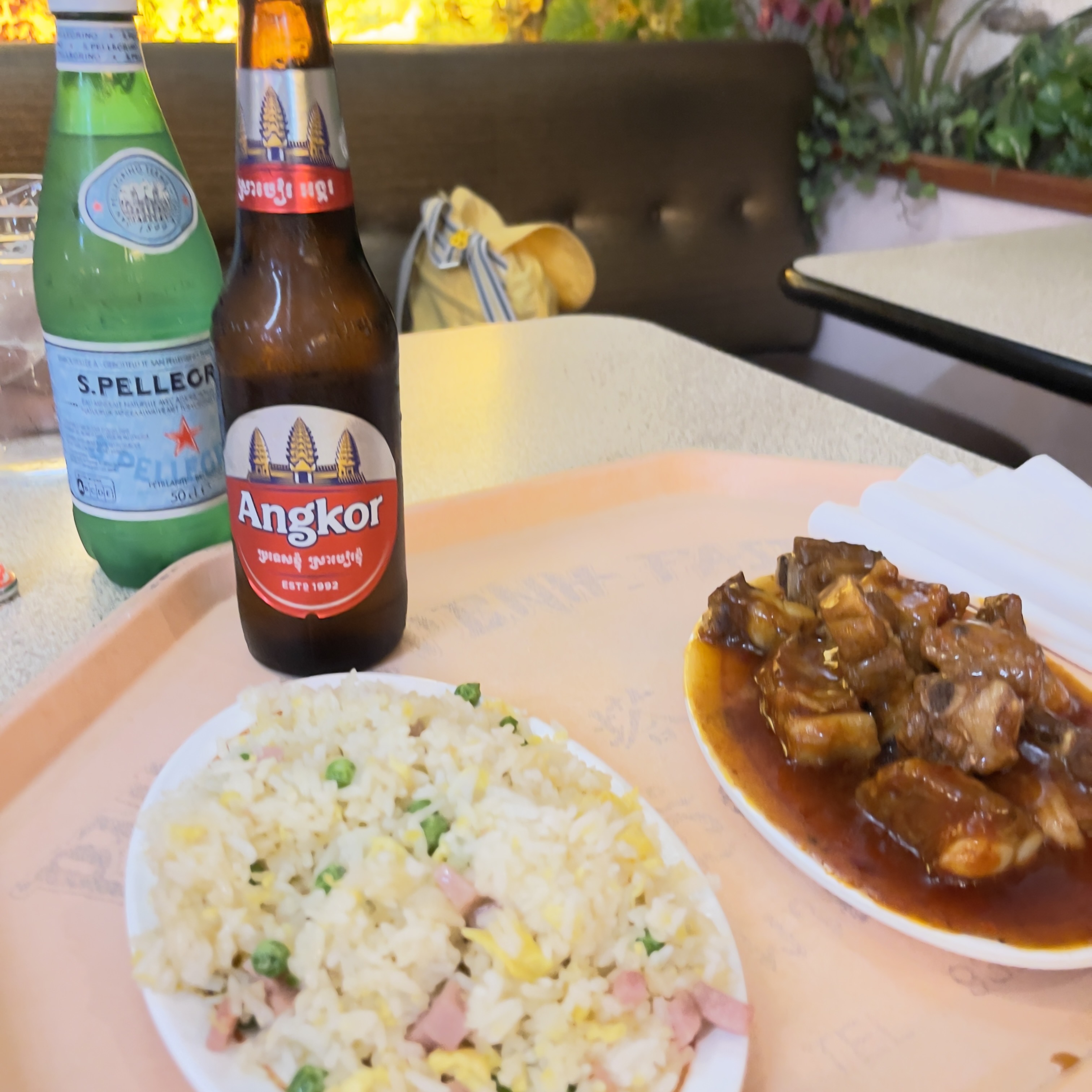 Ce n'est certainement pas un restaurant, mais plutôt une cantine. La soupe de Phnom Penh, en grande portion, a le goût d'une soupe de vermicelles à la coriandre. Les crevettes aux légumes se sont retrouvées dans une sauce très poivrée, j'ai dû les arroser avec de l'eau (heureusement il y a un robinet d'eau au mur)
