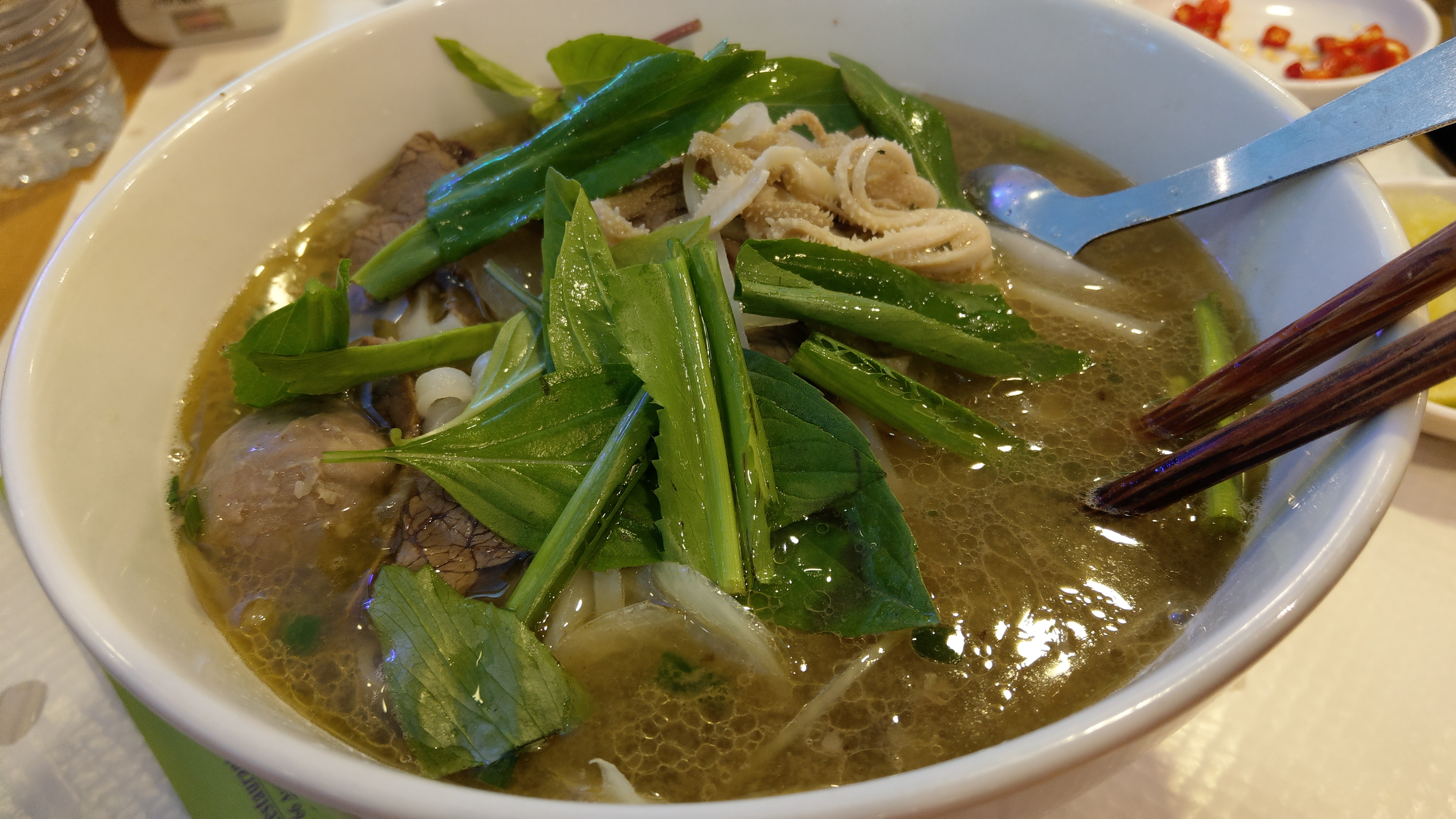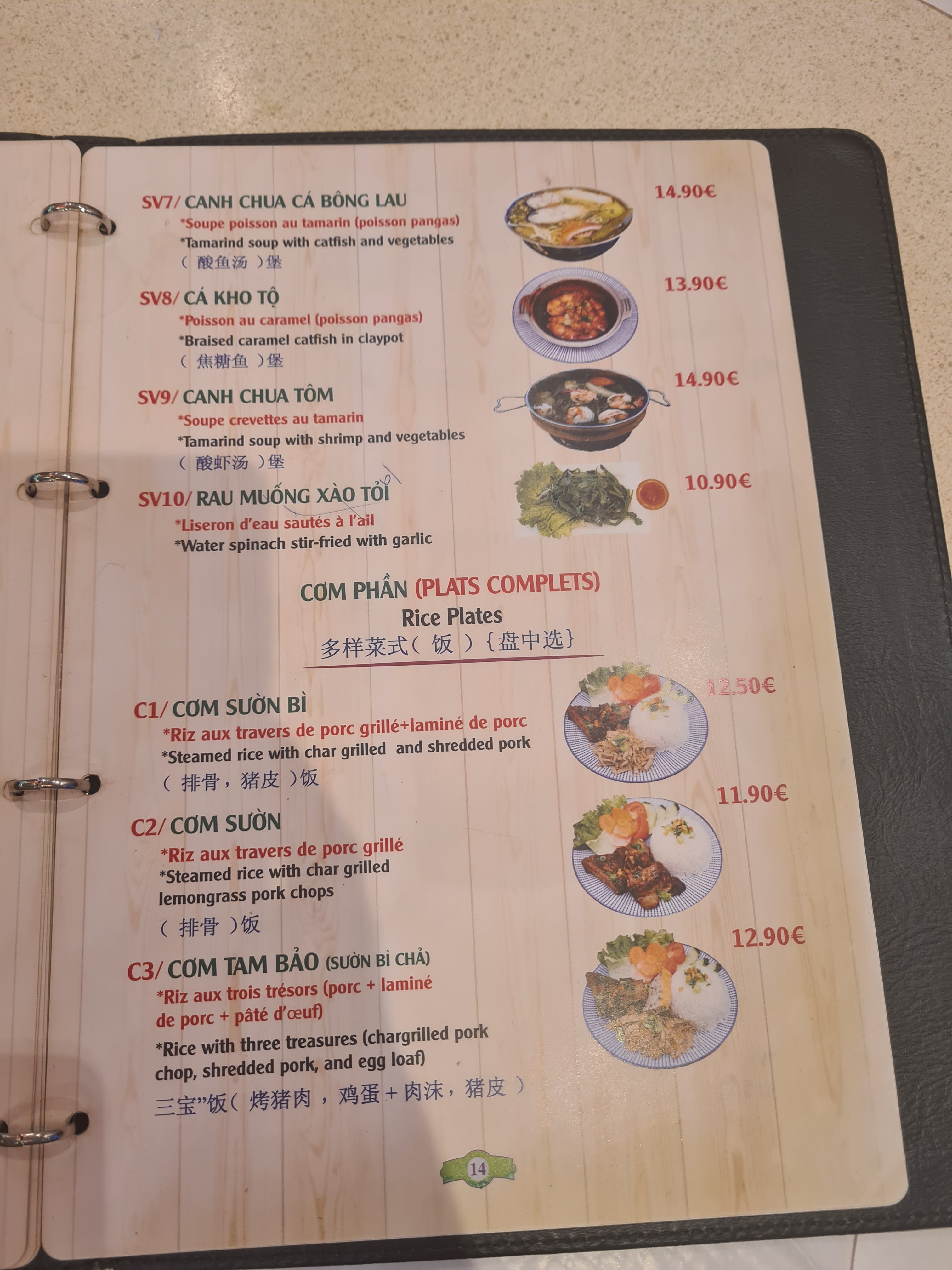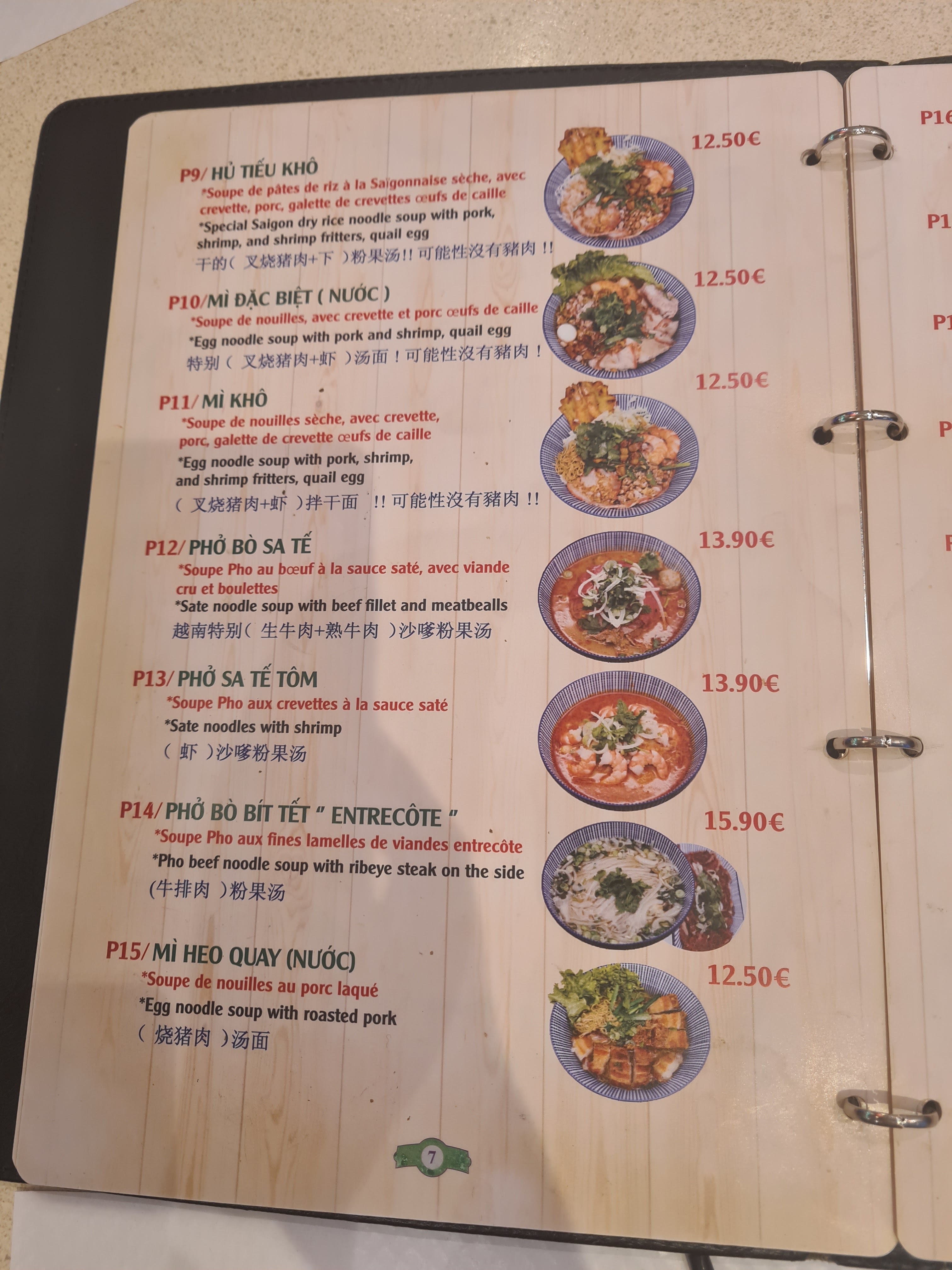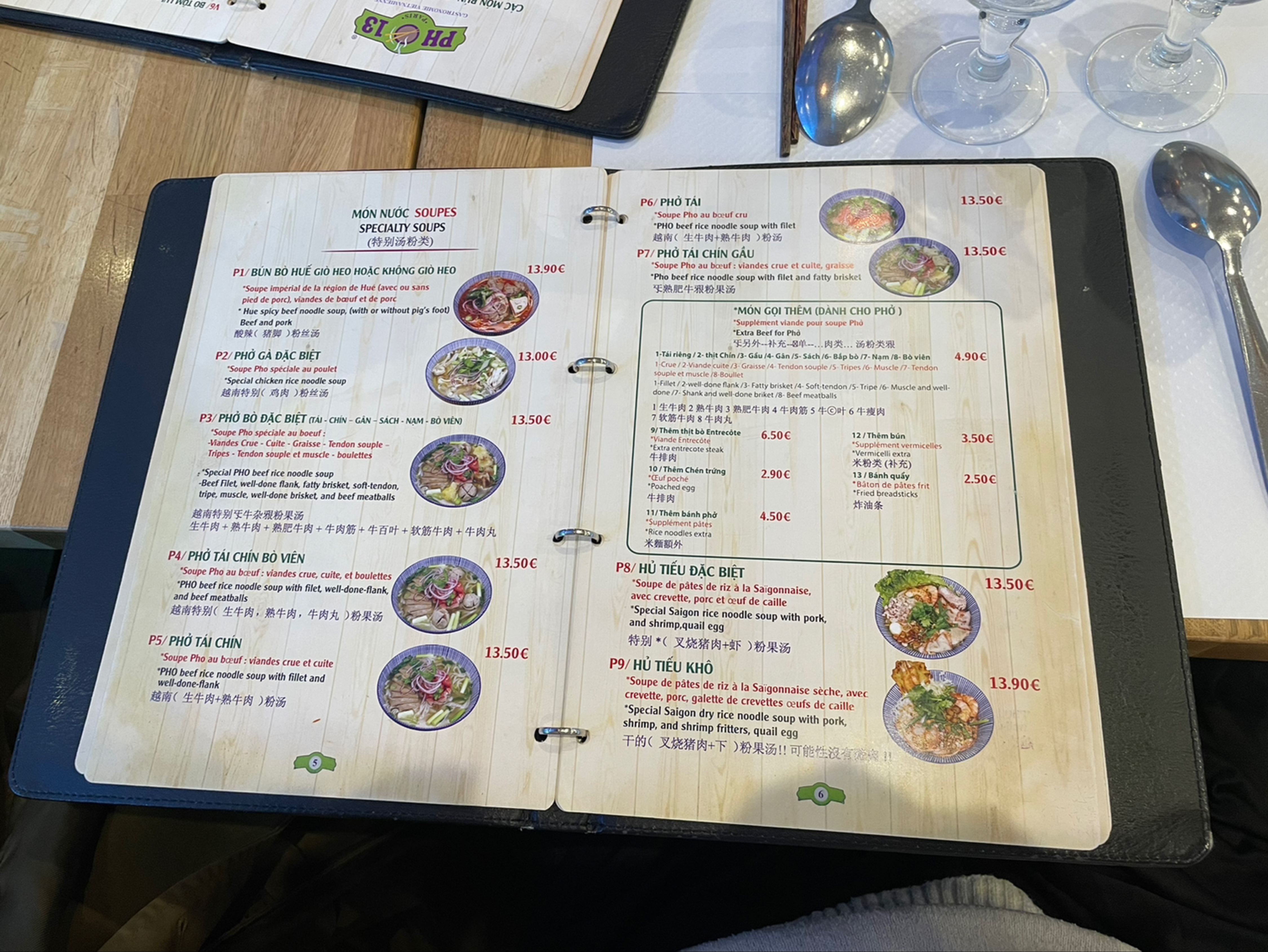 Un restaurant de spécialités vietnamiennes. Une carte avec un. Choix monstrueux de plats, mais rassurez vous, il y a une photo. Mon plat préféré : la soupe de Pho spéciale. Un régal. C'est frais et c'est trop bon