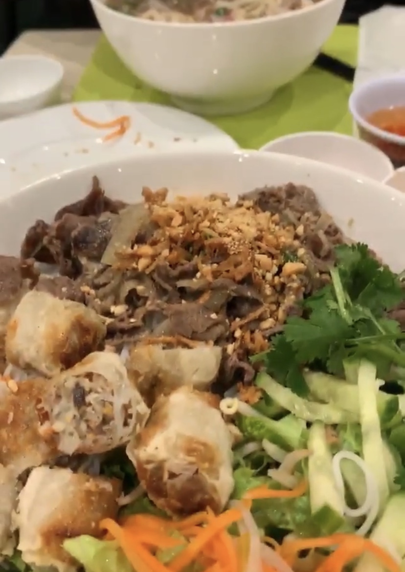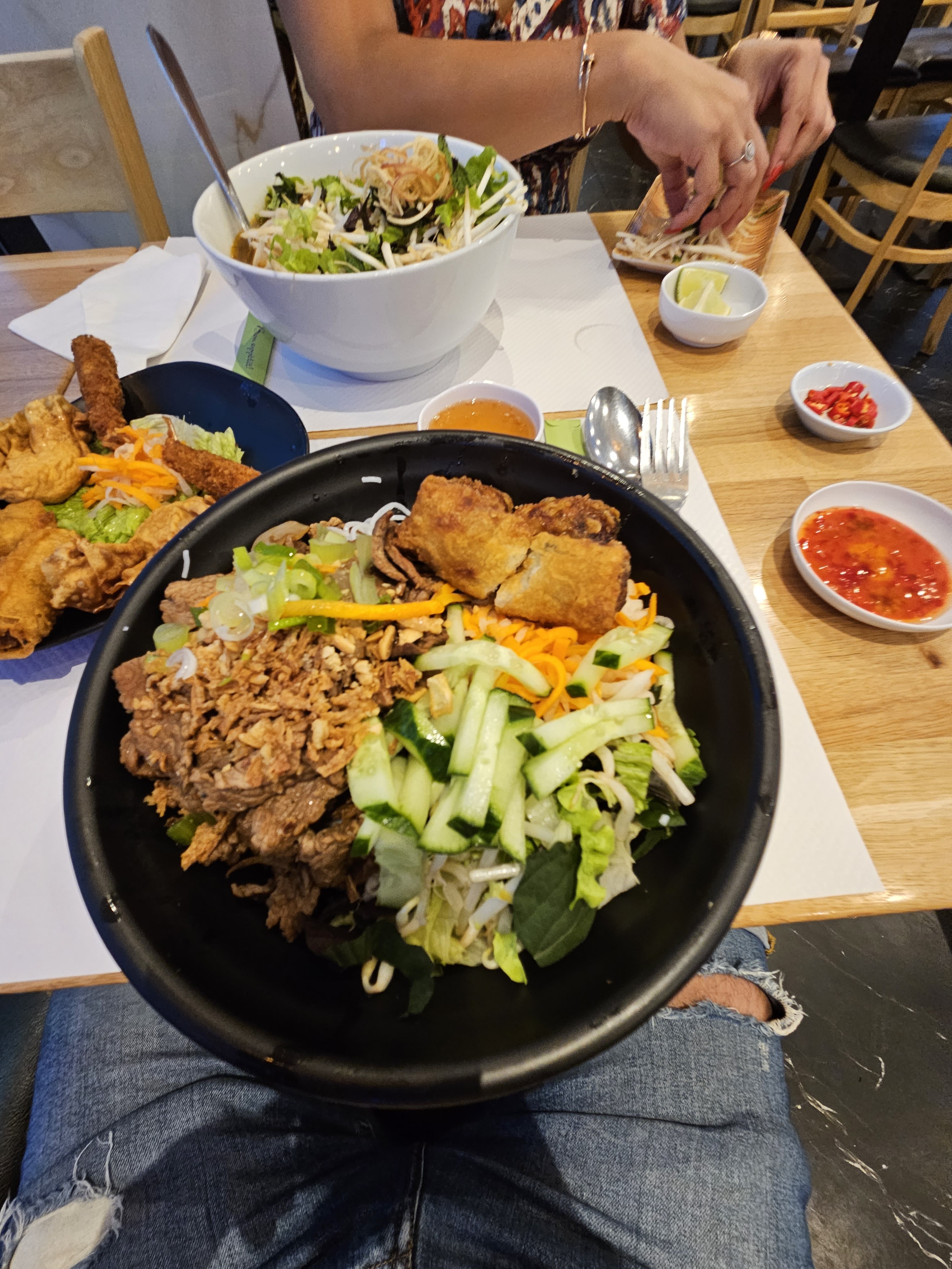 Bun Bo Hue 7/10, les portions généreuses et les nouilles étaient bien cuites et conservaient leur mastication. J'avais l'impression que ce bouillon aurait besoin d'une saveur plus intense, mais il a peut-être été ajusté pour s'adapter à la palette locale. Bun bo 8/10, très bonne saveur dans le bœuf et l'ensemble du plat était cohérent. Rouleaux de printemps au porc 9/10, vraiment très bons. Le service était très vietnamien, alors ne vous attendez à rien de différent. La nourriture a été servie exceptionnellement rapidement et je ne peux vraiment pas me plaindre.