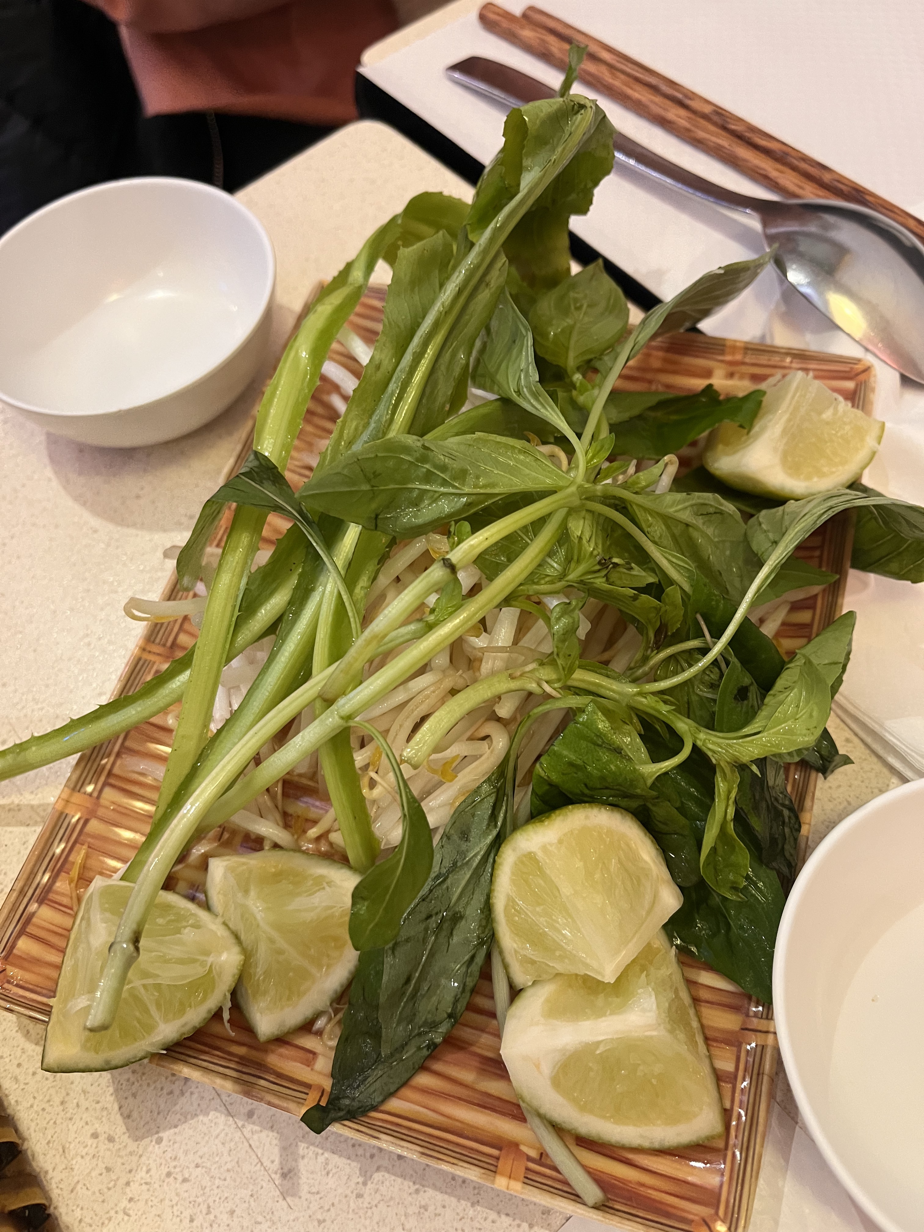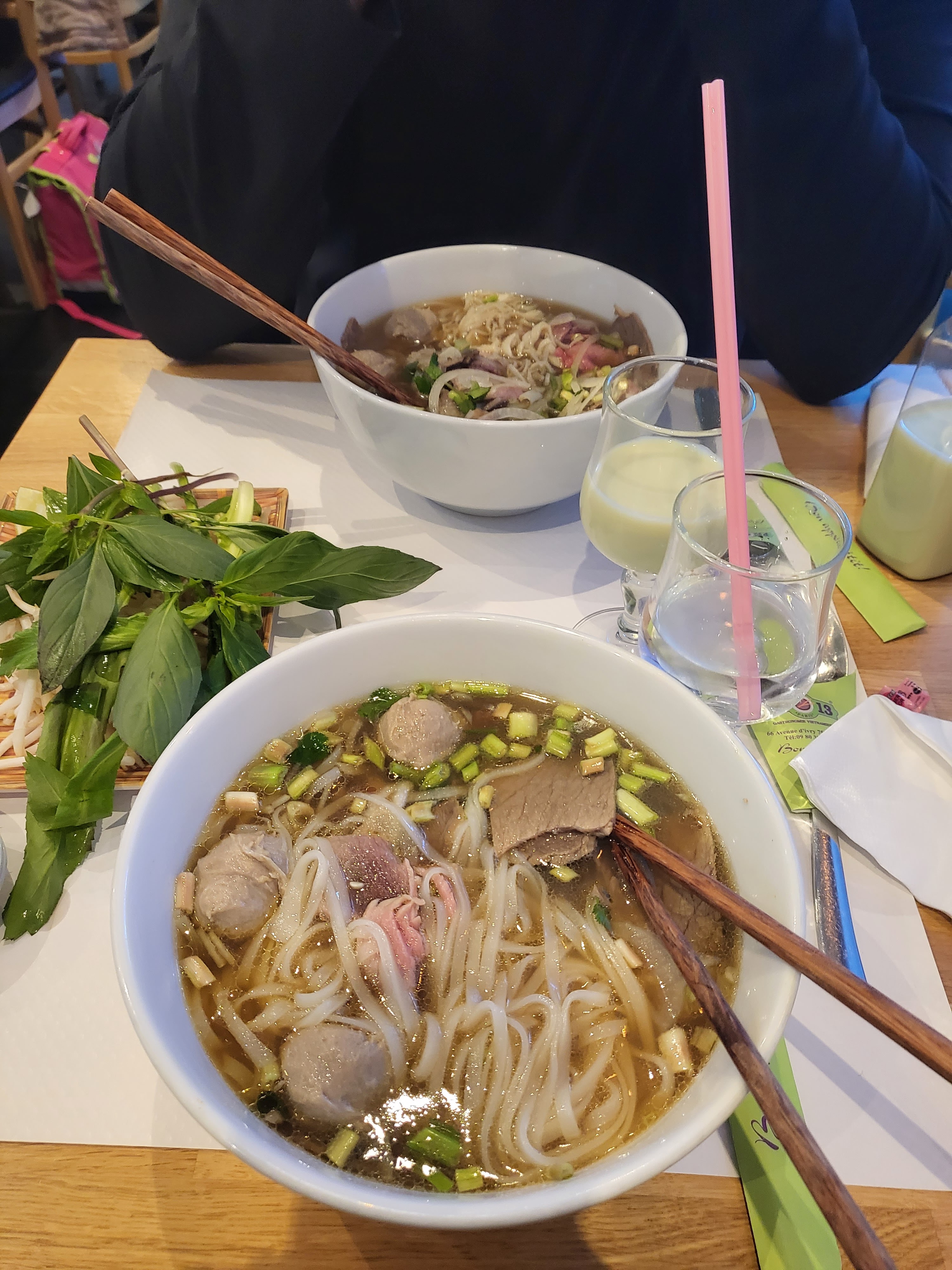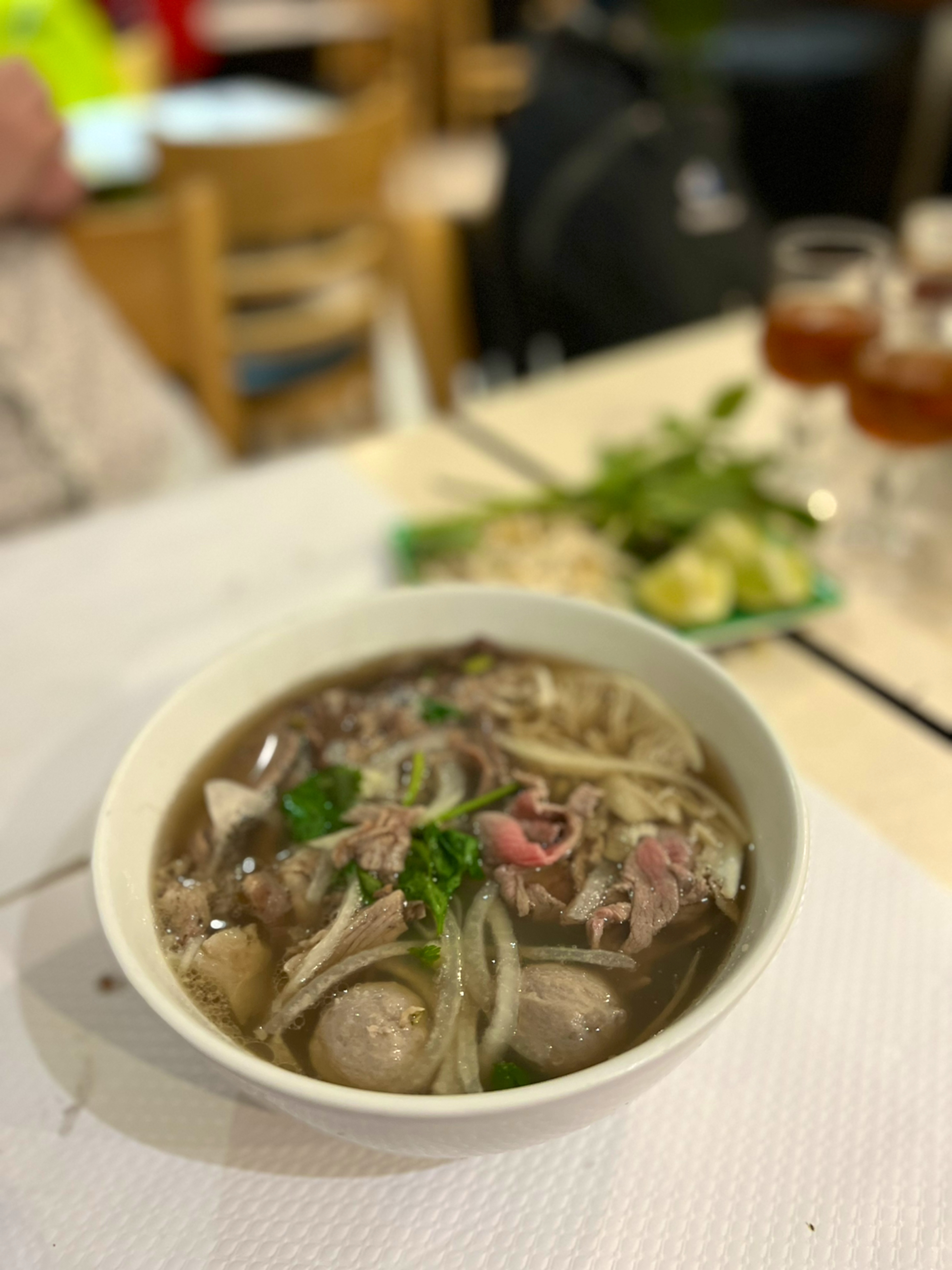 Les personnels est sympa mais le service est désastreux au point où j’ai rarement vu ça : 20min pour commander alors que nos voisins ont pue le faire dès leurs arrivées et qu’ils soient servis avant nous, j’ai bien conscience que on est pas tout seul et que le restaurant était assez plein mais le nombre de serveurs était clairement insuffisant pour la salle. La nourriture est… moyenne, les nouilles de mon pho étaient beaucoup trop cuites donc cela manquait de consistance et c’était assez fade même si le bouillon était pas trop mal malgré qu’il était tiède. Certe c’était pas mauvais mais on ne peut pas non plus dire que la nourriture était bonne