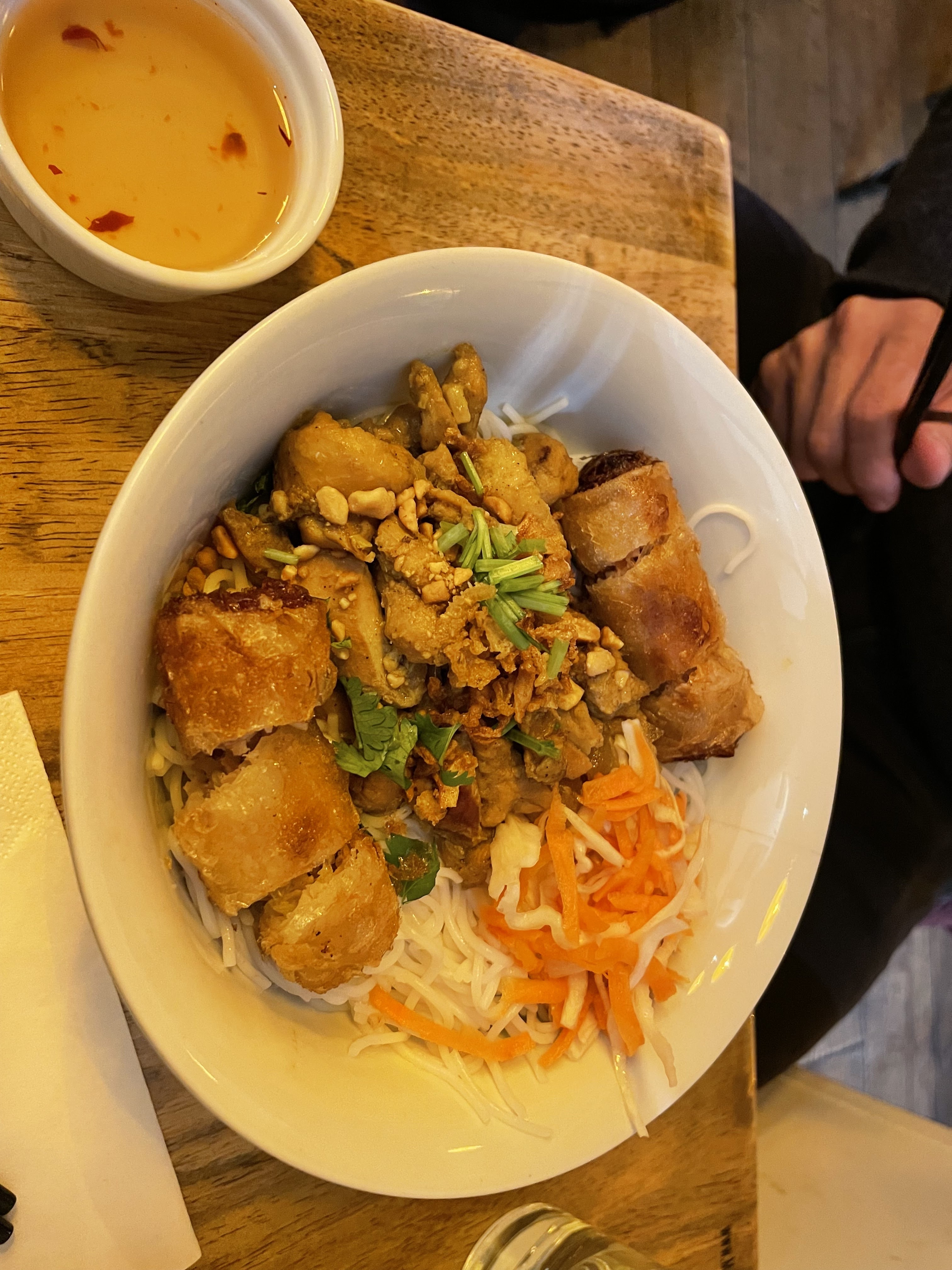 Je voulais quelque chose de rapide et bon pour le midi, c'est plutôt réussi. En 40/45 minutes c'était plié. 12,70 € pour le menu du midi (entré, plat et dessert) ça me semble convenable. Même si c'était bon j'ai trouvé que les portions devaient être un peu plus généreuses, si bien que j'avais encore un peu faim en sortant Le rouleau de printemps était petit et ne comportait qu'une seule crevette découpée en fine lamelle. Rien à dire pour le bobun et la perle coco 🥥. C'est bon. Le restaurant est très petit et par conséquent vite rempli et bruyant. Donc à éviter si vous cherchez un endroit au calme Pour résumer, c'est parfait quand on a peu de temps le midi.
