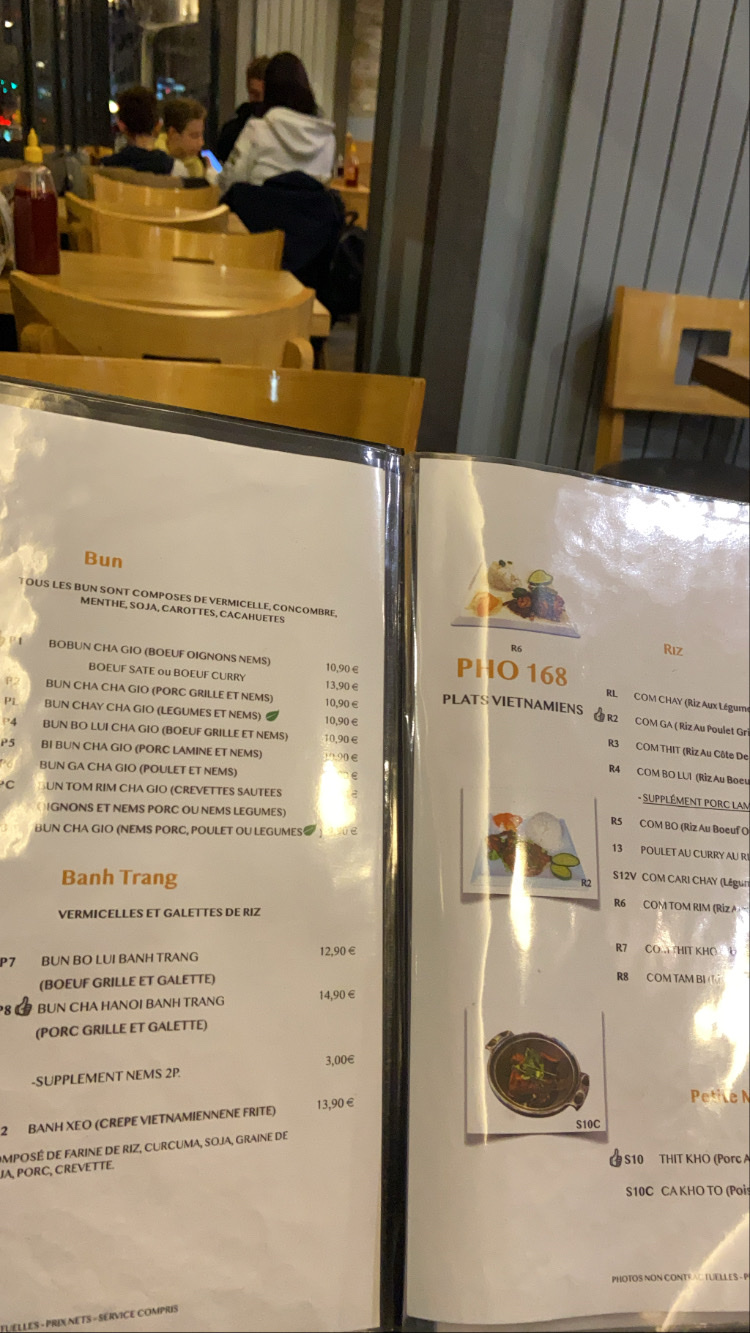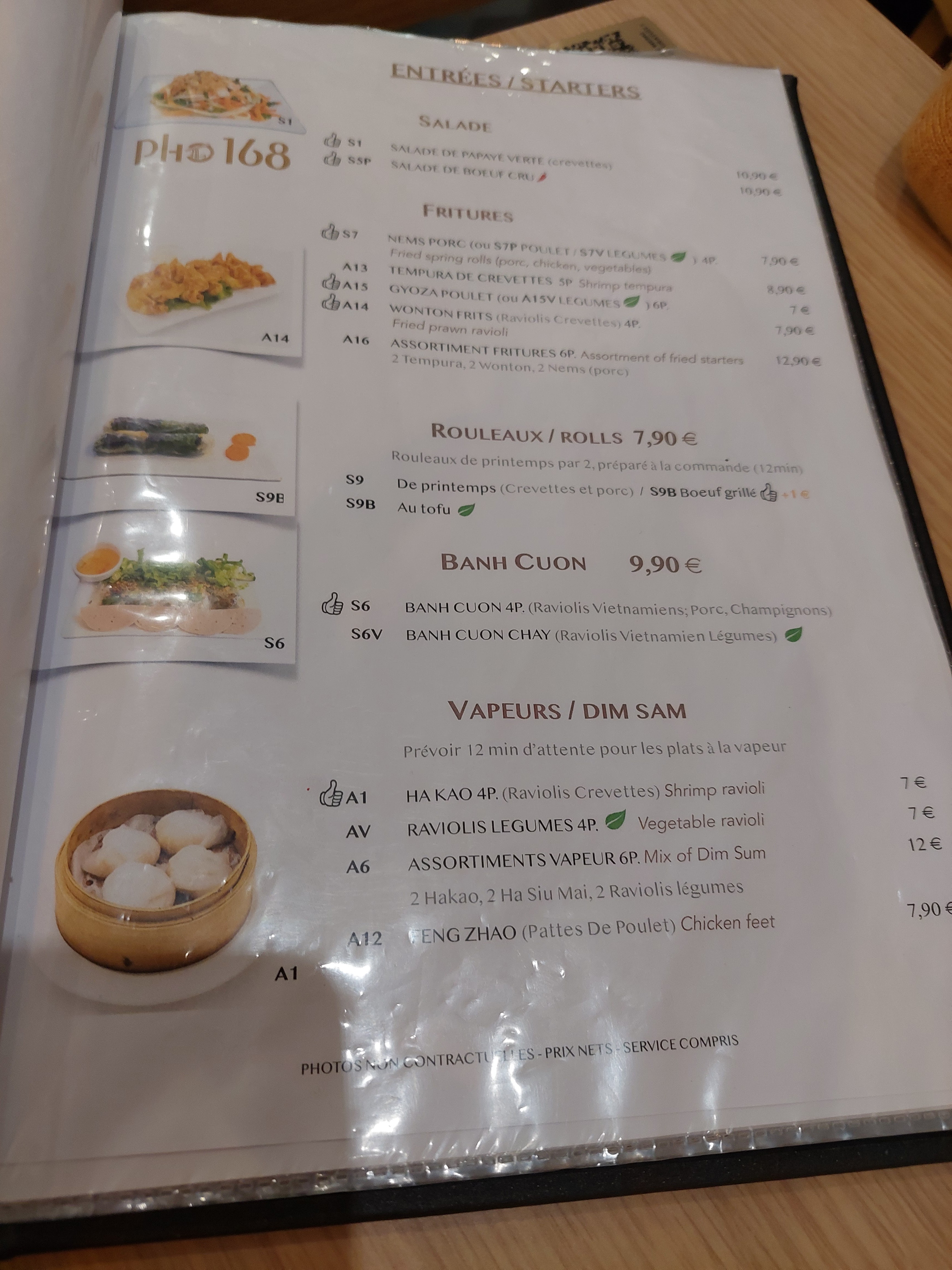 Update 23/05 / 2022 I could not make new review since I already kept review before . So I am modifying my review. Today every starter and main course was served perfect. I had the same dish like before . And it was perfect than before. Before I had complained regarding the egg of Lok lak but today it was perfect. Even the nem was so crunchy. I must say, I enjoy meal everytime I am here. Good meal . Next time I would love to try pho . Since it's name is pho 168. I would love to try their pho. Finger crossed. Pho 168 La première impression que je suis entré dans le restaurant. C'était bon. Bien preety bon accueil. Bon pour commencer j'ai commandé du Ricard, qui a été bien servi mais je pense qu'ils ont manqué de servir l'accompagnement avec. Mais globalement sympa. Après avoir commandé nem pour mon entrée et loc lac pour mon principal. Nem s'en est bien sorti. Je vois de nombreux restaurants asiatiques à Paris qui ne servent que du nem sans salade mais ils m'ont aussi servi avec de la salade, ce qui était bien, mais après m'avoir servi du nem, je dois attendre près de 5 minutes pour obtenir ma serviette et ma cuillère. Mais ça va, je vois à quel point ils étaient occupés. J'ai juste attendu. Après l'arrivée du plat principal, j'ai commandé du loc lac. C'est un plat français vietnamien. Normalement, le jaune d'oeuf n'est pas bien cuit. Mais ils m'ont servi du jaune d'œuf bien cuit. C'est le problème. J'aurais pu ordonner de le changer mais je ne le voulais pas car ils auraient dû bien me servir au début. Et je pense que le buff de loc lac n'est pas avec de la sauce normalement il est servi sauté sec. Mais ils m'ont servi avec de la sauce. Mais c'était délicieux quand même. Dans l'ensemble, le classement est bon. Pas le meilleur mais bon pour ce que vous payez. Ils servent une bonne cuisine délicieuse. Pas le meilleur authentique mais bon et délicieux. Le prix est correct. Juste ils manquent un peu de relation client. Sinon ils sont bons. Je recommanderai cet endroit à coup sûr. Entretenez simplement votre relation client. Bon travail