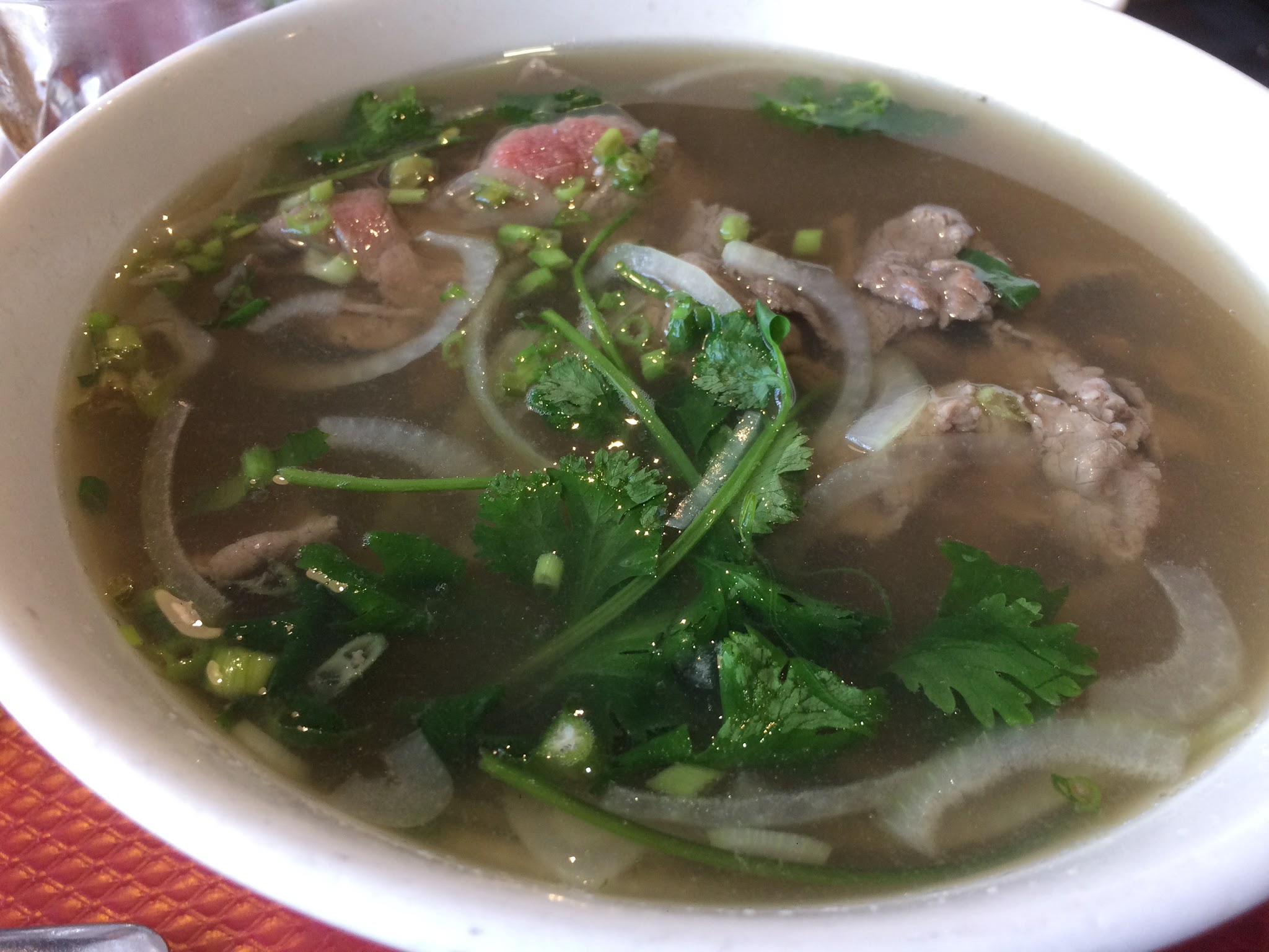 C'est un point de chute lorsqu'il fait froid. Une bonne soupe vietnamienne accompagnée de bœuf, de tripes, de boulettes et de nouilles. Servi avec des pousses de soja, menthe, piment ainsi qu'une petite sauce. C'est un plat copieux