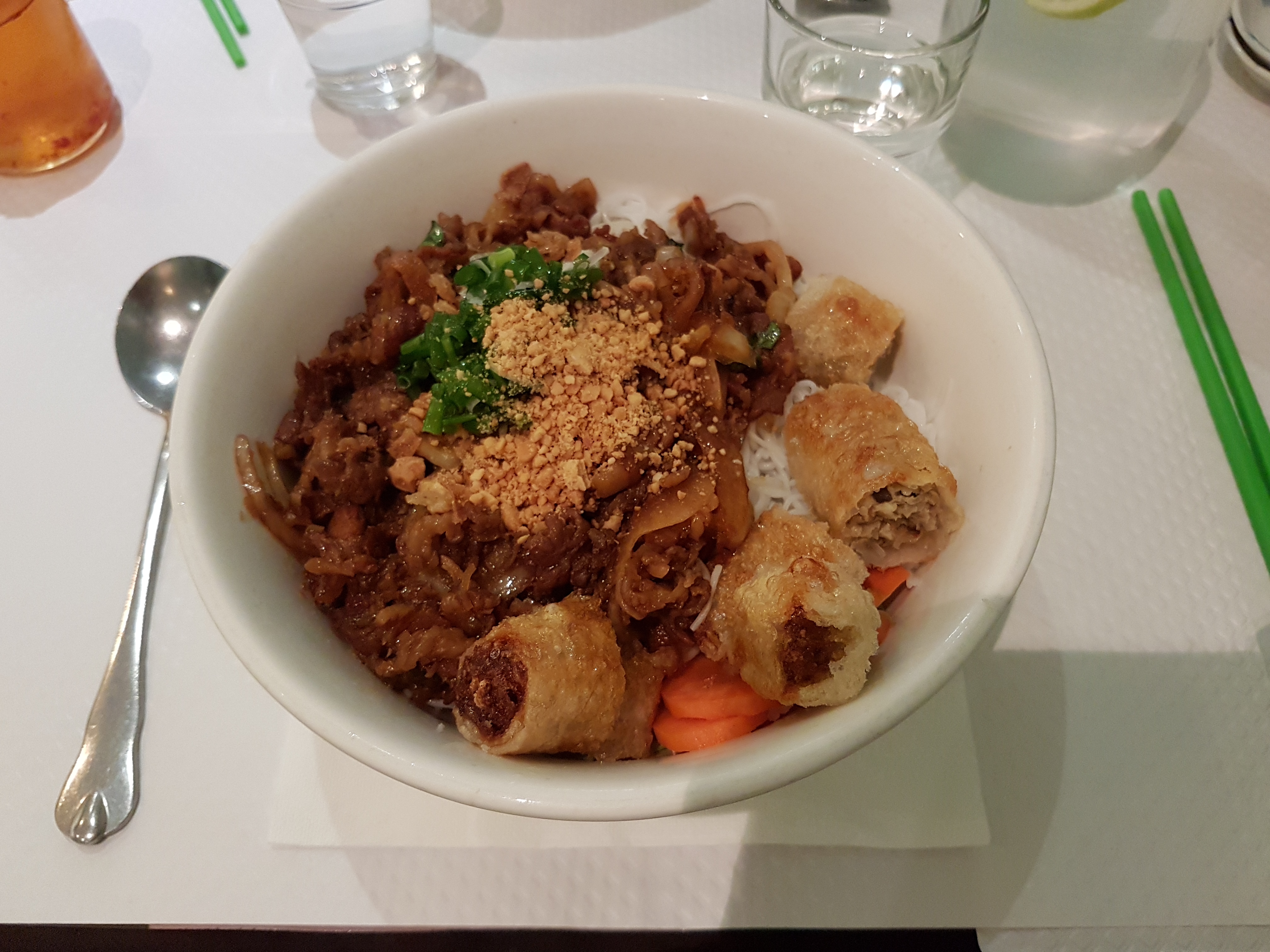 J'ai lu un article sur un blog qui m'a donné envie d'aller dans ce restaurant. Le décor est entre cantine et restaurant, l'accueil est bon, les serveuses donnent des conseils judicieux sur les plats au moment de choisir. J'ai pris un bobun, il était bon, mais ne sortant pas de l'ordinaire, j'y retournerai pour goûter autre chose.