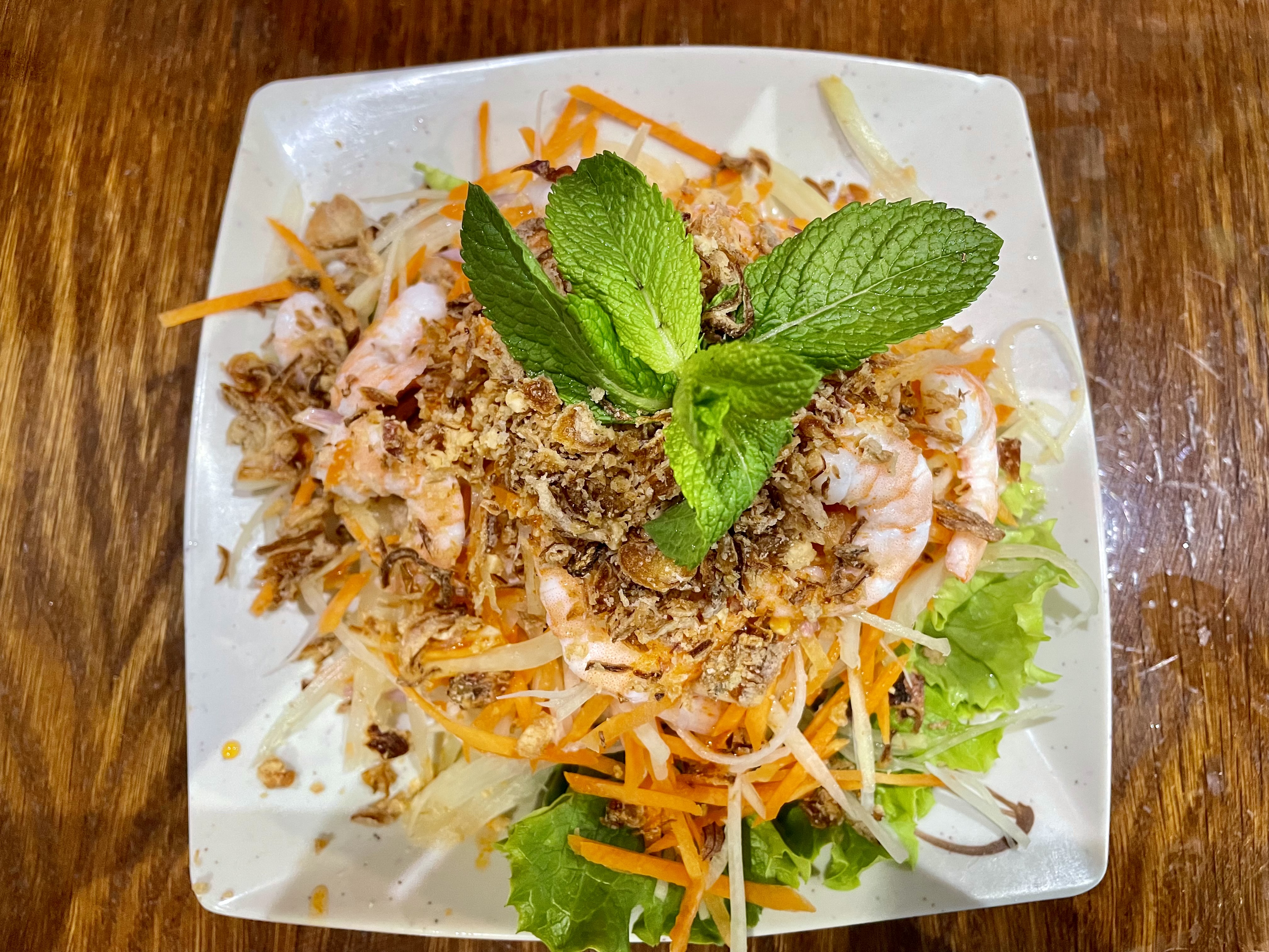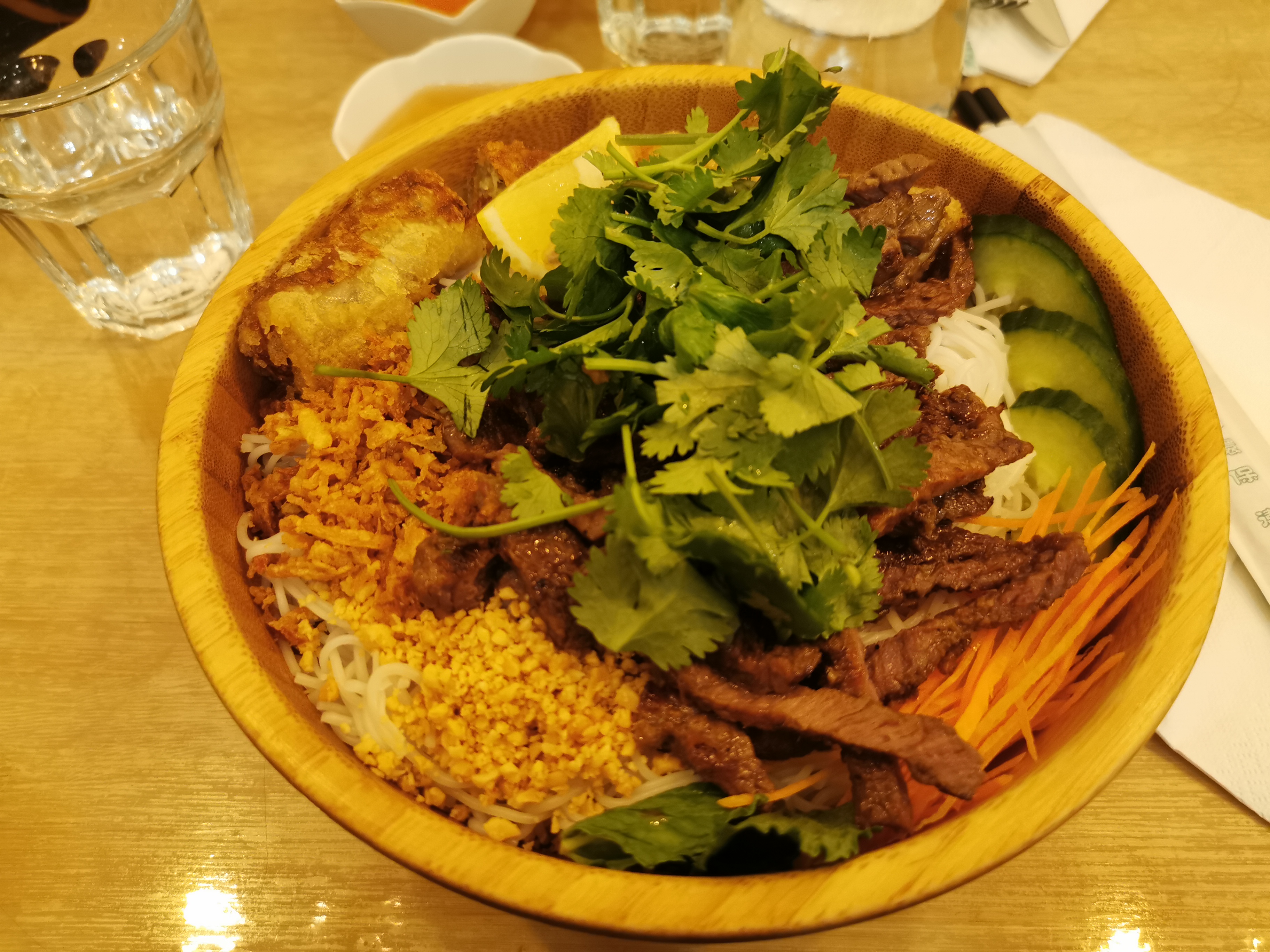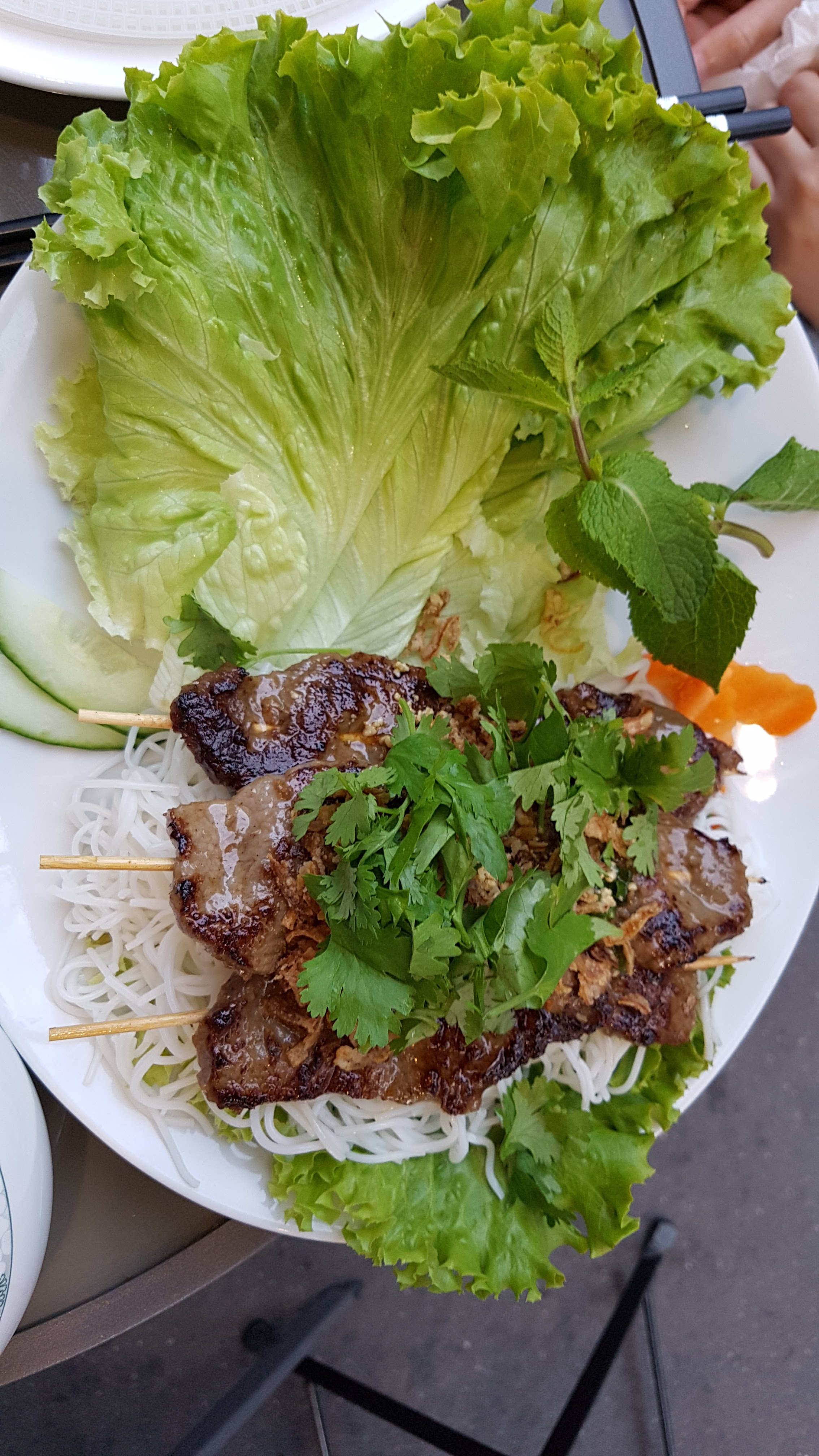 Nous avons mangé différents plats vietnamiens dans ce petit restaurant simple. Le Pho - la soupe typique - était servi avec des herbes fraîches et était très savoureux. Habituellement, vous obtenez quelques piments forts ou piments. Ils n'étaient pas inclus, mais j'en aurais certainement eu si je l'avais demandé.