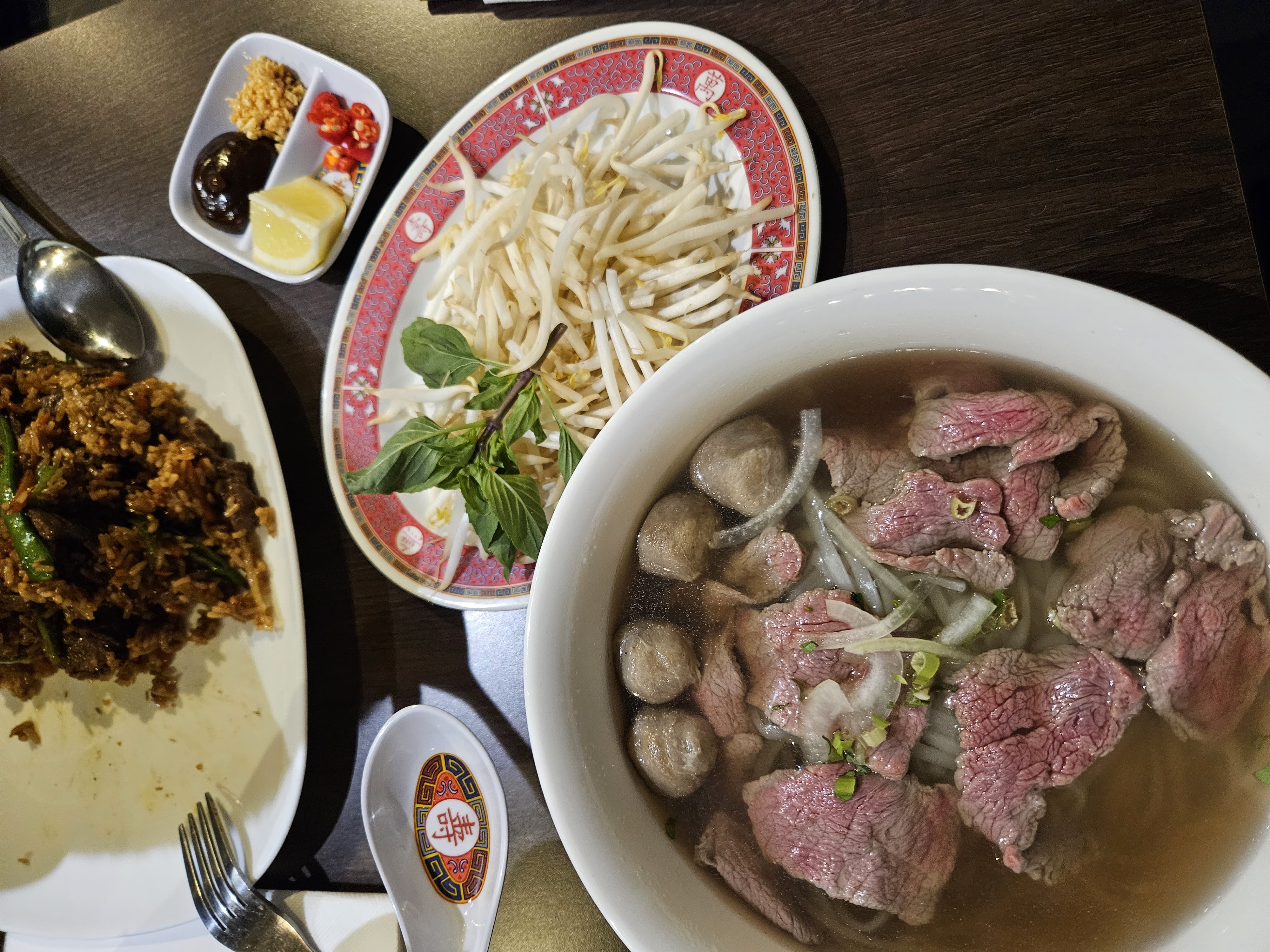 Bon Pho chaud un jour de pluie. Le riz frit au canard est également très bon.
