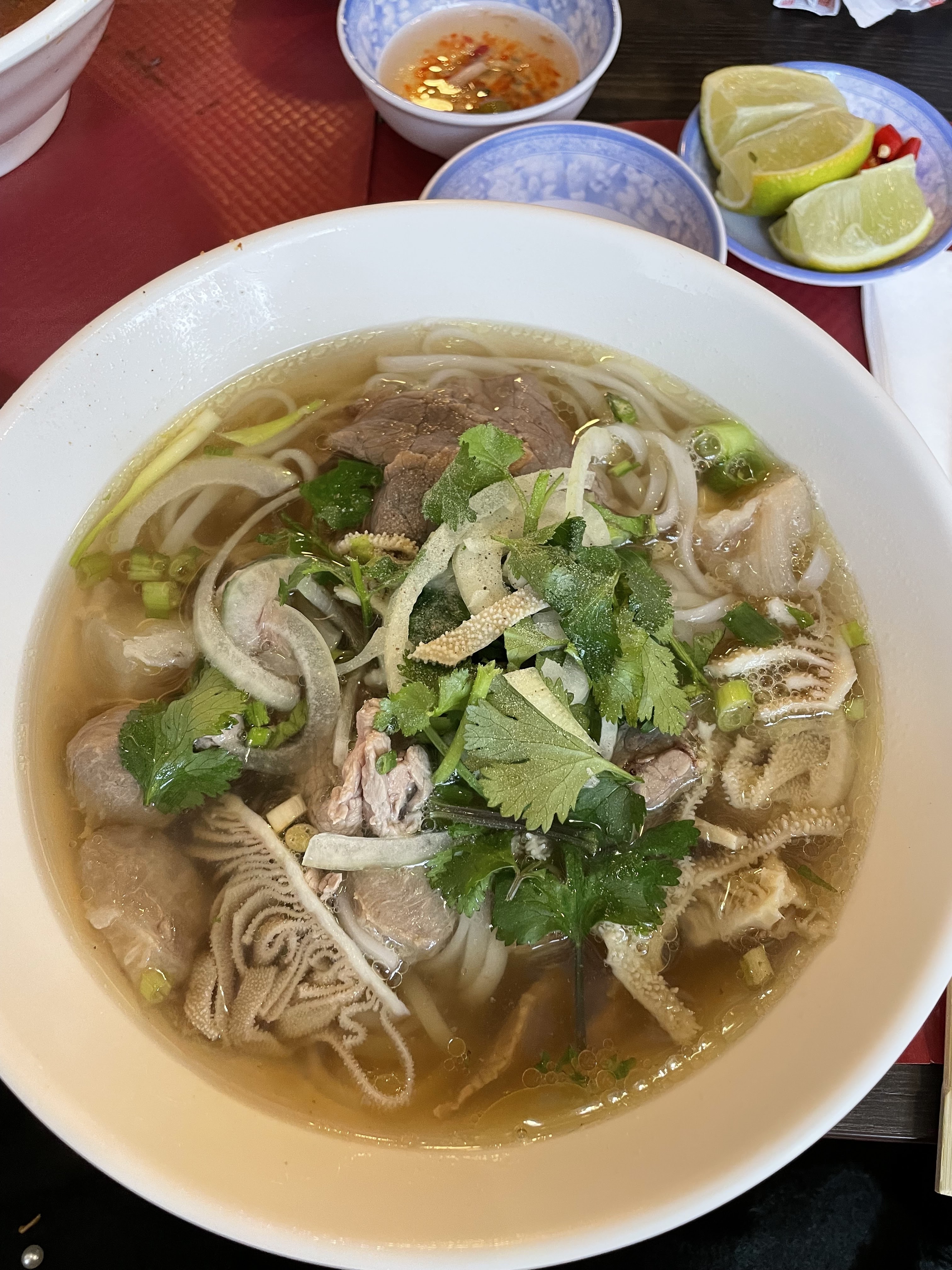 J'avais envie de pho après des jours de pâtes et d'aliments plus lourds. Ça y est ...! C'était authentique et délicieux. Nous avons commandé du pho avec du bœuf, des tendons, des tripes, etc. et du pain cha hanoi qui était une boulette de viande et du porc enveloppés dans de la laitue et de la menthe. Si bon! Aimer!