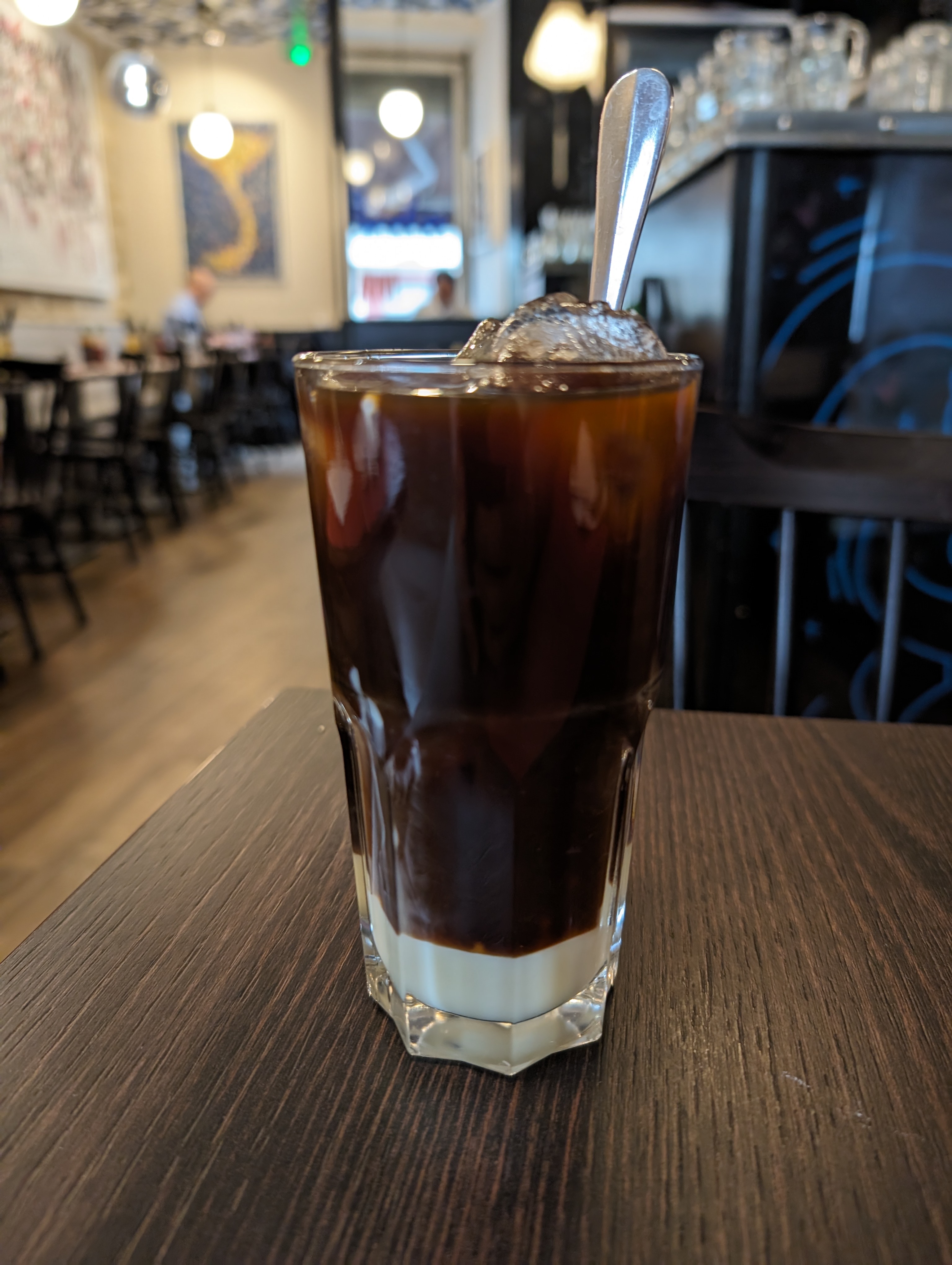 Nous avons eu le premier pho ainsi que le dernier, probablement le meilleur pho que j'ai eu à Paris mais la concurrence est rude donc c'est serré. J'adorerais essayer le bol de vermicelles aux crevettes la prochaine fois, il était superbe sur la table à côté de nous ! Le premier pho est un bouillon classique légèrement sucré, des nouilles de riz plates, tout va bien. Le bouillon est à tomber par terre, ce qui n'est pas si rare quand il s'agit de pho. Le dernier pho était un peu épicé et complexe, avec un gros morceau de cuisse de porc au fond donnant encore plus de saveur au bouillon. Encore une fois, c'est vraiment bien. Nous avons pris le thé glacé, très sucré, mais globalement bien équilibré et délicieux, ainsi qu'un milkshake au Coco, qui a été une autre agréable surprise. Avec de la glace épaisse et de la pulpe de noix de coco épaisse, c'était un excellent milk-shake rafraîchissant, peut-être un peu trop sucré, mais en tant qu'Américain, je pouvais l'apprécier. Je reviendrai certainement, même si nous sommes pleins et très occupés, nous n'avons dû attendre que 5 minutes environ pour avoir une table, donc ils sont efficaces et savent ce qu'ils font.