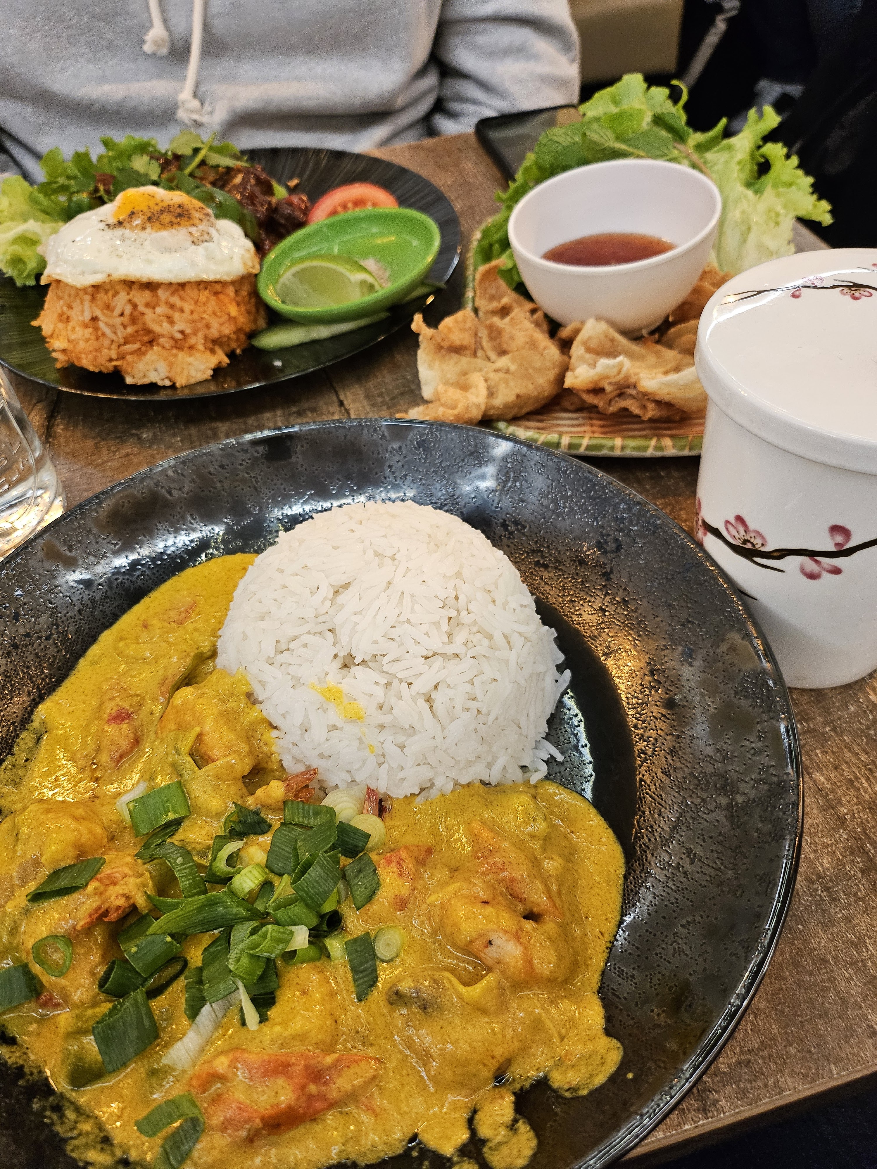 Un beau restaurant, belle décoration, personnel agréable, le midi un peu bruyant mais normal. Par contre, une carte qui promet de jolies choses et un peu déçue de la soupe citronnelle avec les bâtons durs et du mini morceau de poisson et du riz gluant qui était difficile à manger sans sauce avec le poisson.... Je retenterai l'expérience avec d' autres plats...
