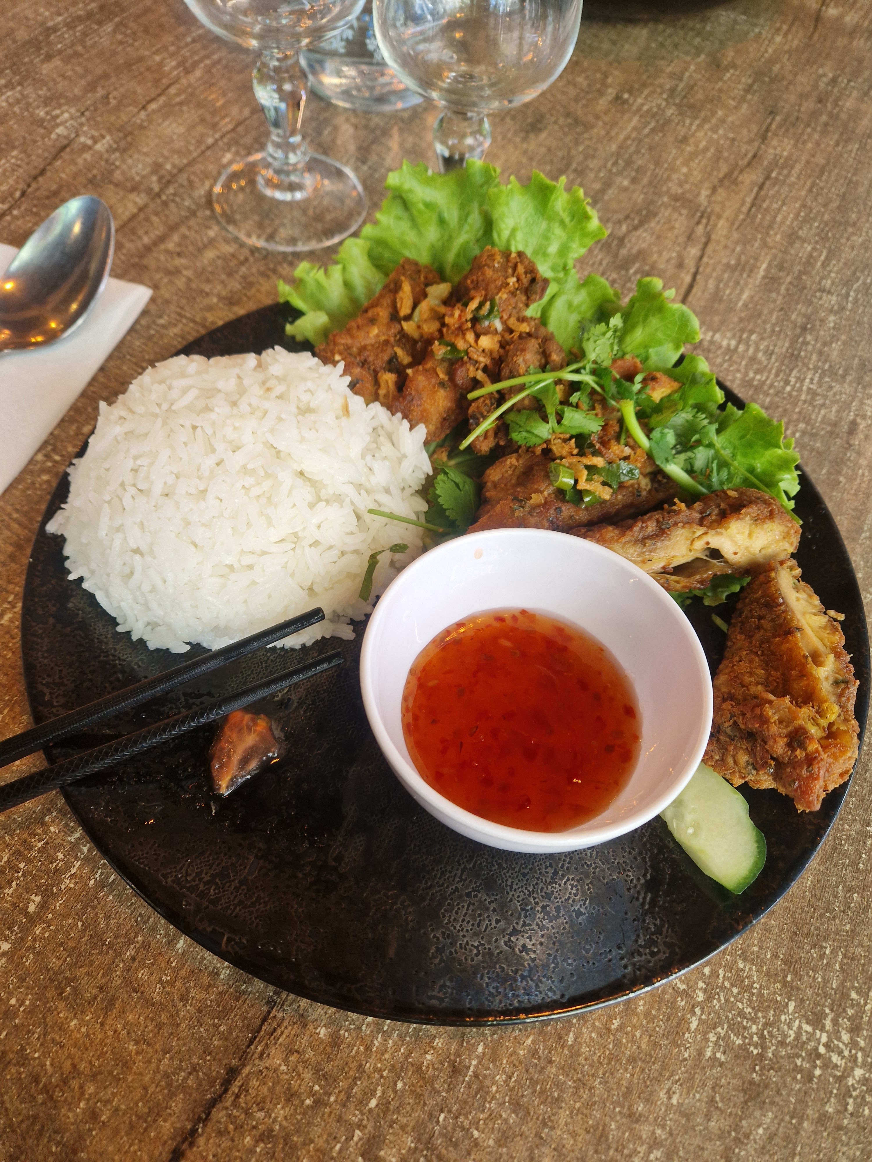 Un très bon restaurant (accessible fauteuil) avec des chaises confortables et un personnel sympa et serviable. J'ai beaucoup aimé la cuisine de la viande (parfois un peu trop grasse), attention si vous n'aimez pas la coriandre dites le. En revanche petite déception sur le riz, je n'ai pas trop aimé la cuisson. Globalement je recommande chaudement (surtout le poulet pané)