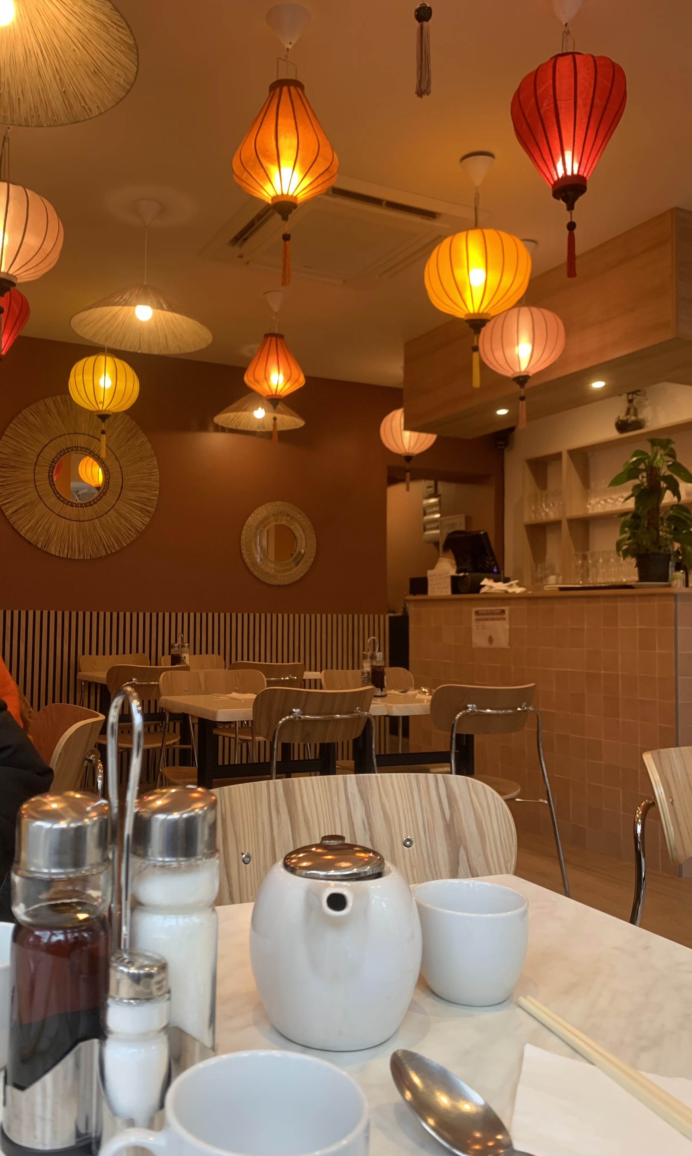 Je suis venu ici parce que l'endroit où je voulais aller était fermé et que c'était en route. Le serveur était très gentil, il ne parlait pas français mais anglais, ce qui m'a permis de me sentir plutôt en contact 😅😜 a partagé son mot de passe wifi avec moi La portion était très grande, je ne pouvais pas finir la soupe et je ne pouvais rien commander en plus, ce qui était dommage car ils avaient une belle sélection de petits pains d'été. La seule partie étrange était le manque de sauce piquante que les piments remplaçaient de toute façon. Il y avait une famille brésilienne qui parlait très fort dans le restaurant ce qui bloquait le tout dans une ambiance sympa, nous étions tous des étrangers à Paris réunis autour d'un intérêt commun : la cuisine vietnamienne, donc j'ai apprécié l'ambiance. Une chose que je n’ai pas aimé, c’est que la porte extérieure restait ouverte à tout moment, ce qui faisait entrer le bruit de la rue et était également assez froide.