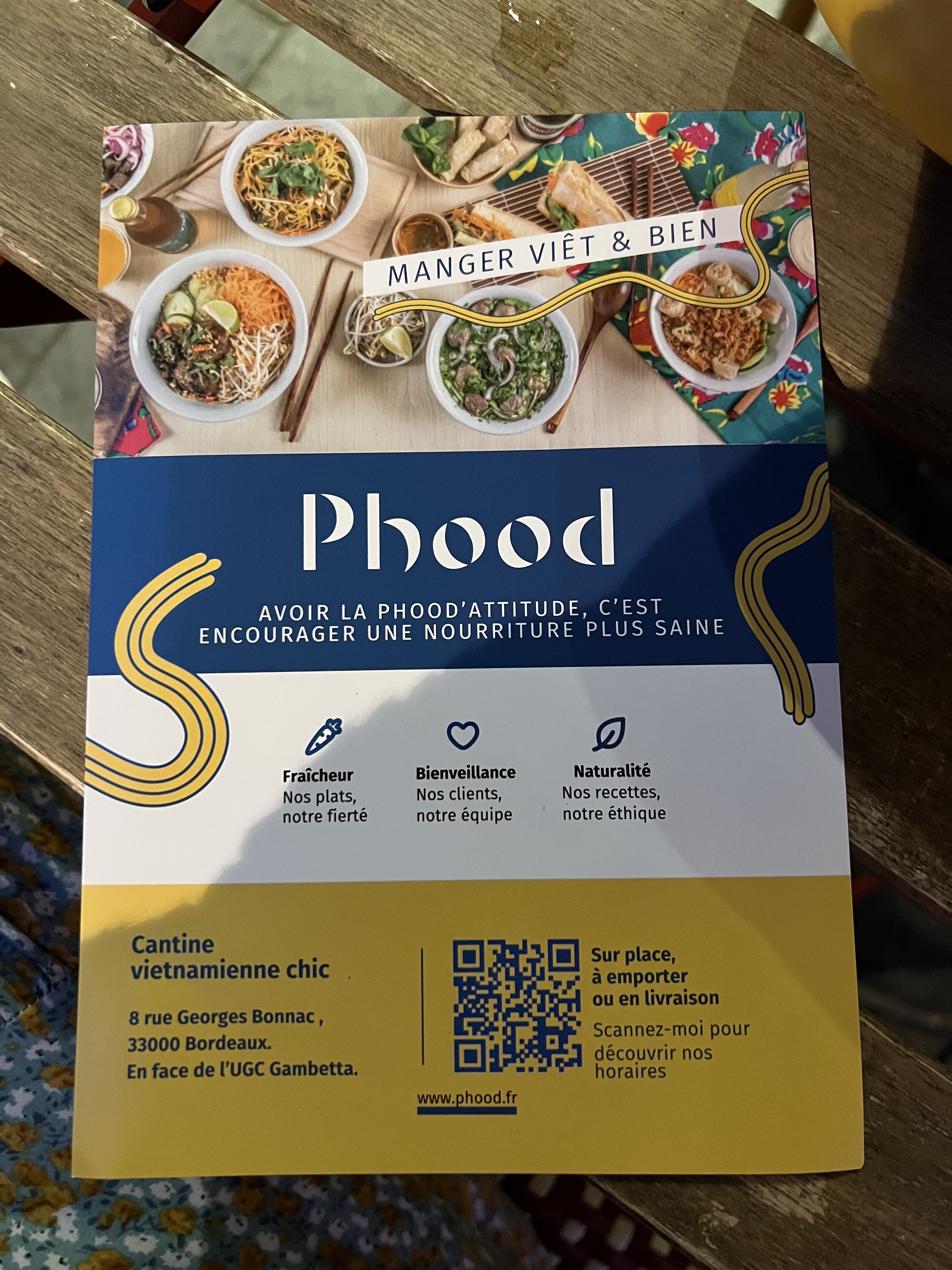 Un basique de la cuisine vietnamienne. Sans être exceptionnel, Phood s'illustre surtout par sa simplicité dans ce qu'il propose, ces prix raisonnables pour les quantités et rapide sans faire fast food. C'est un peu un restaurant confort pour moi quand je ne sais pas quoi manger et que je ne veux pas trop dépenser. A noter néanmoins que tout ces avantages s'accompagnent malheureusement d'un certain manque d'authenticité dans les plats a l'inverse d'un vietnamien traditionnel comme on peut en trouver à Bordeaux.