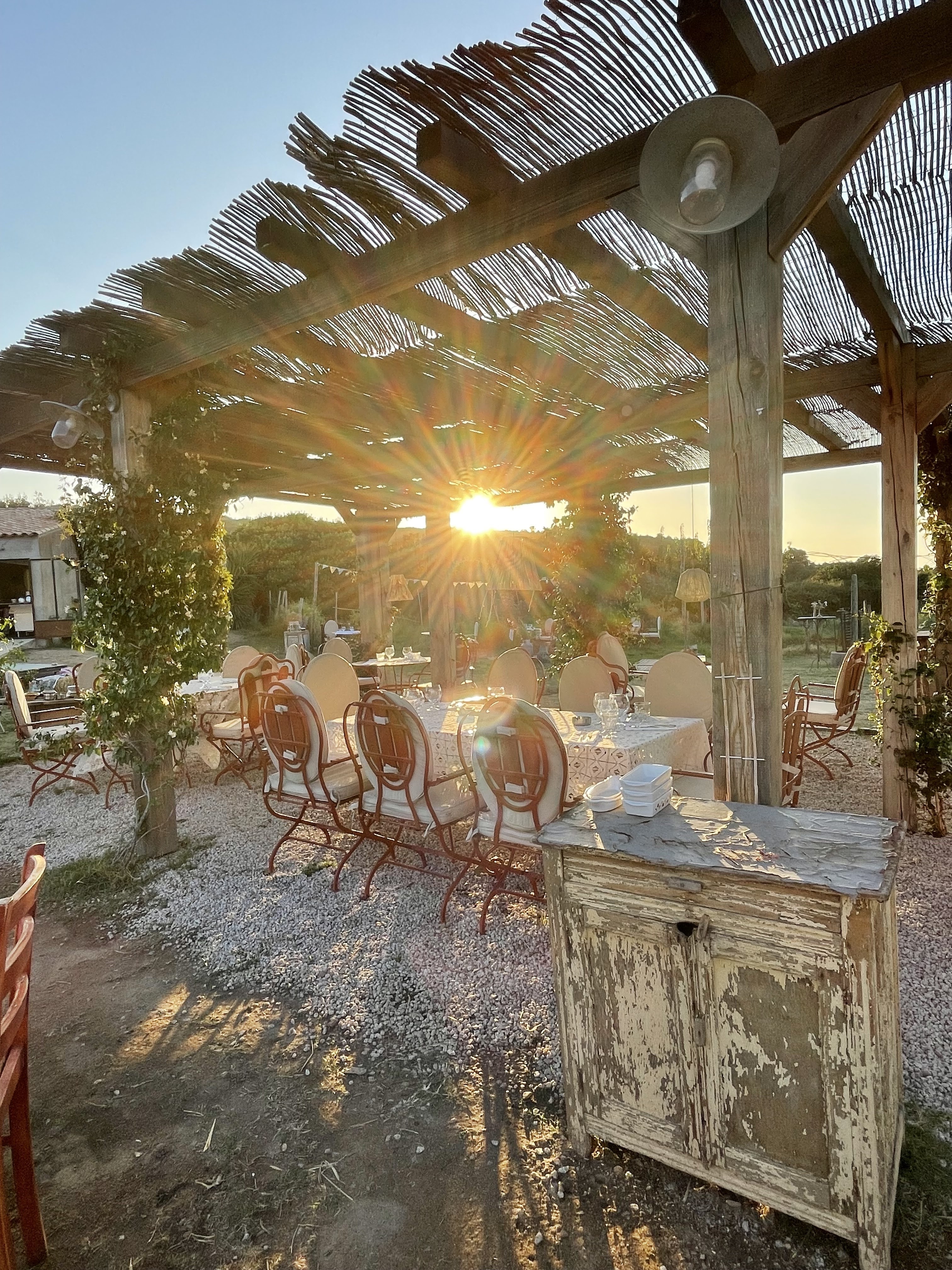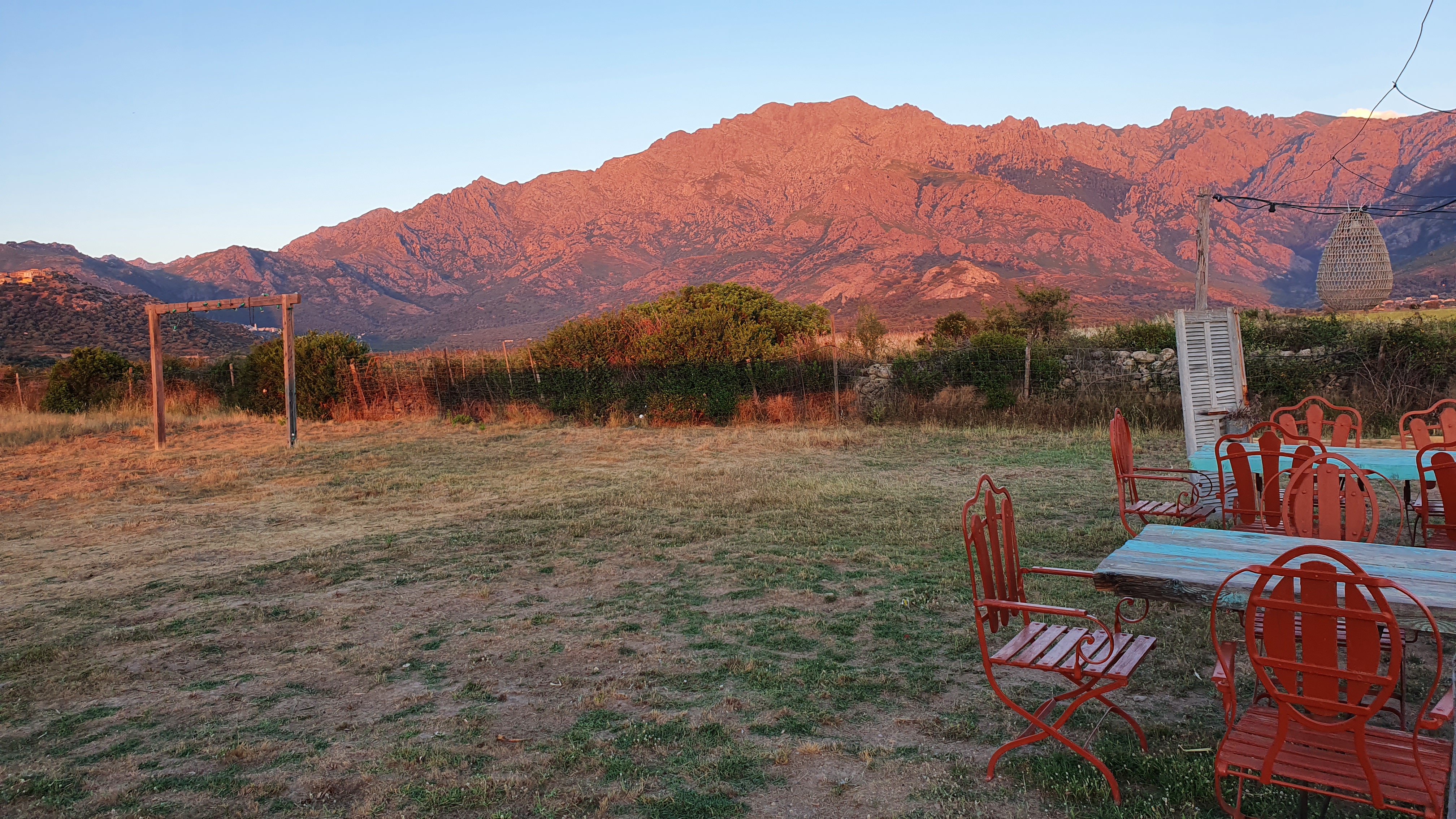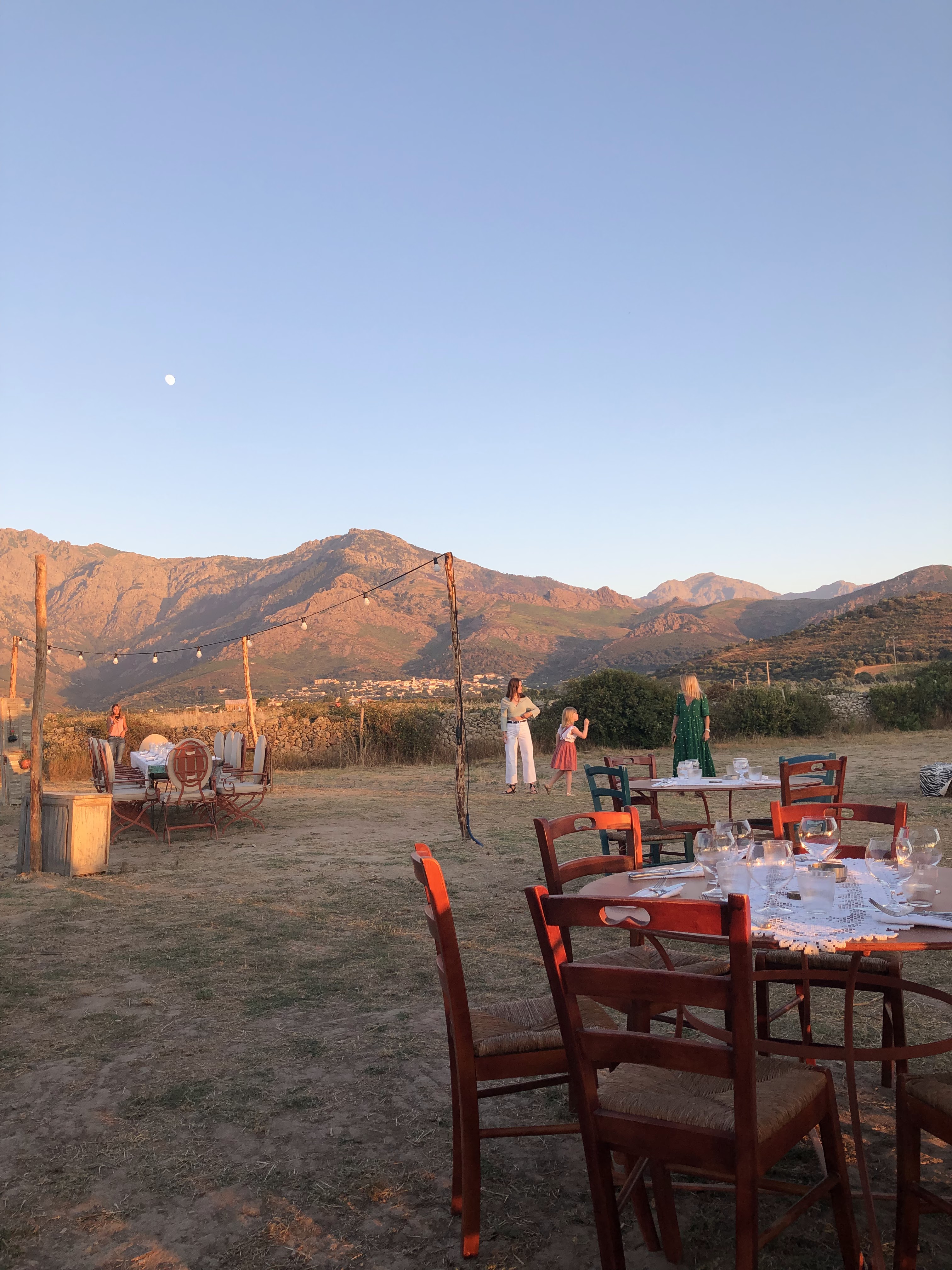 Le jour va bientôt se coucher sur la baie de calvi... 40 degrés et pas un seul souffle d'air. La saison touristique est à son maximum... tensions sur la route, dans le maquis, les incendies se déclenchent... Nous décidons donc d'aller dîner dans ce nouveau restaurant créé par Nathalie dans la plaine de Calenzana. Après un kilomètre de piste nous découvrons ce lieu enchanteur, paisible et authentique. Au loin, le soleil tombe à l'horizon. La plaine se teinte d'une douceur orangée. Le Montegrosso devient rose. On se sent à la maison, dans son jardin. Une délicieuse infusion glacée au romarin est servie pour nous rafraîchir. Nathalie nous raconte sa carte typiquement corse... ses madeleines de Proust. Le terrain de ses ancêtres, ses recettes d'inspiration familiale... Tout est calme et serein. Le crépuscule s'installe. Montegrosso, Lumio, Cassano, Zilia, Calenzana s'illuminent peu à peu dans les montagnes qui règnent magistralement sur la plaine. Les lampions scintillent discrètement. La magie s'installe. L'assiette est parfaite, le service chaleureux et professionnel. Au menu : beignets de fromage, œufs mimosa en hommage à Sainte Restitude, agneau juste délicieux, veau tendre aux olives, crème brûlée au thym... Nos papilles salivent. Le temps s'est arrêté. La lune se lève. Une douce brise berce cette splendide soirée. Bravo pour ce lieu hors du temps !!!