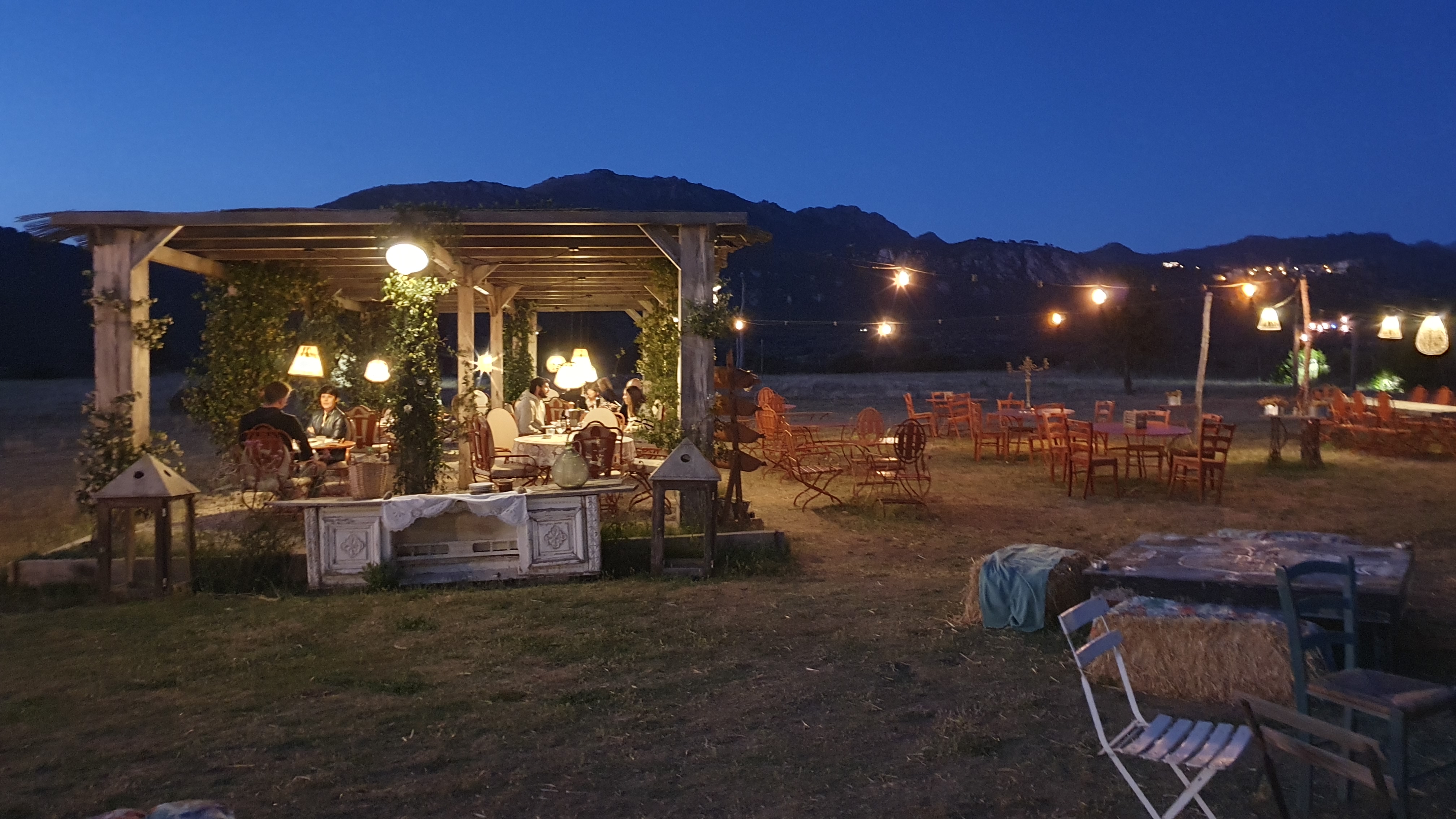 Restaurant au beau milieu des montagnes, dans le bas de la vallée, juste avant Calvi, loin de la torpeur des cafés tapageurs, de la foule. Vous serez au calme dans un cadre champêtre, au rustique assumé (bottes de foin en guise de fauteuil apéritif). Il est possible qu'à la réservation on vous dise de prévoir un petit pull du fait du couloir de vent plus frais qu'en bord de mer. Ce soir-là nous avons débuté par un apéritif assis sur une botte de foin, très sympathique, malheureusement hâté par le dîner, nous avons dû quitter notre table basse sans finir nos verres, à la demande du personnel. Nous avons choisi le fameux plat d'agneau, qui semble être un incontournable, par chance le plat est servi avec des cannellonis, ce qui a permis de compenser le manque total de viande. Nous avons donc mangé des cannellonis avec des os d'agneau. En les suçant vous aurez une bonne idée du goût que cela peut avoir. Au final, 2 apéritifs, 2 plats d'os et 1 bouteille de vin de la région pour 98 Euros. En fait le total aurait dû être, après recalcule le lendemain, de 94 Euros, nous dirons que le pourboire , 4 euros tout de même, est directement inclus ! La prochaine fois, s'il y en a une, nous essayerons un autre plat qui je suis certain saura largement compenser le ratage précédent, qui n'en était pas complètement un du fait du cadre assez exceptionnel de l'endroit. Pour le coup, idéal pour un mariage, en privatisant l'endroit, vous serez à même d'accueillir de nombreuses personnes pour festoyer. A vous de jouer.