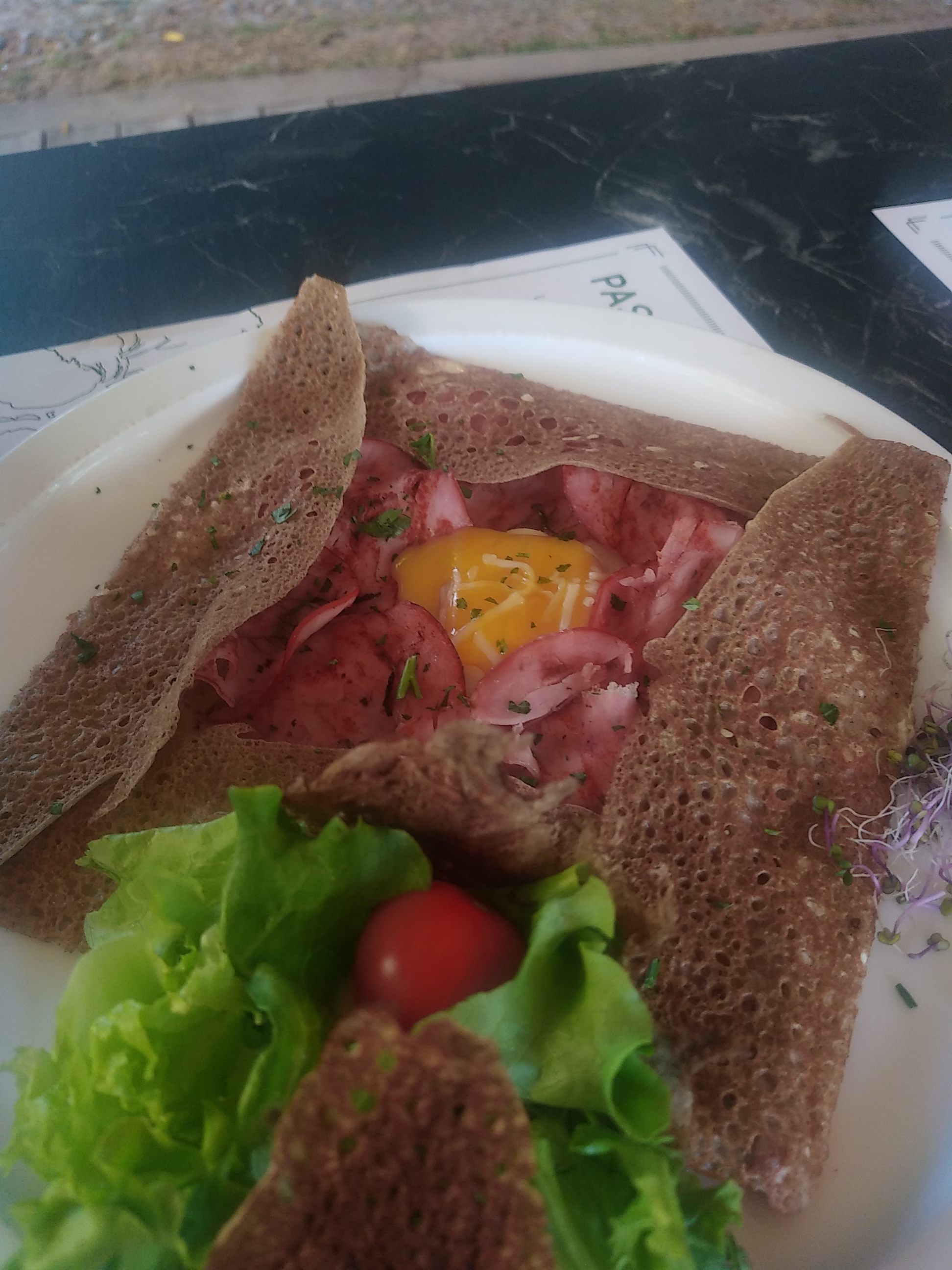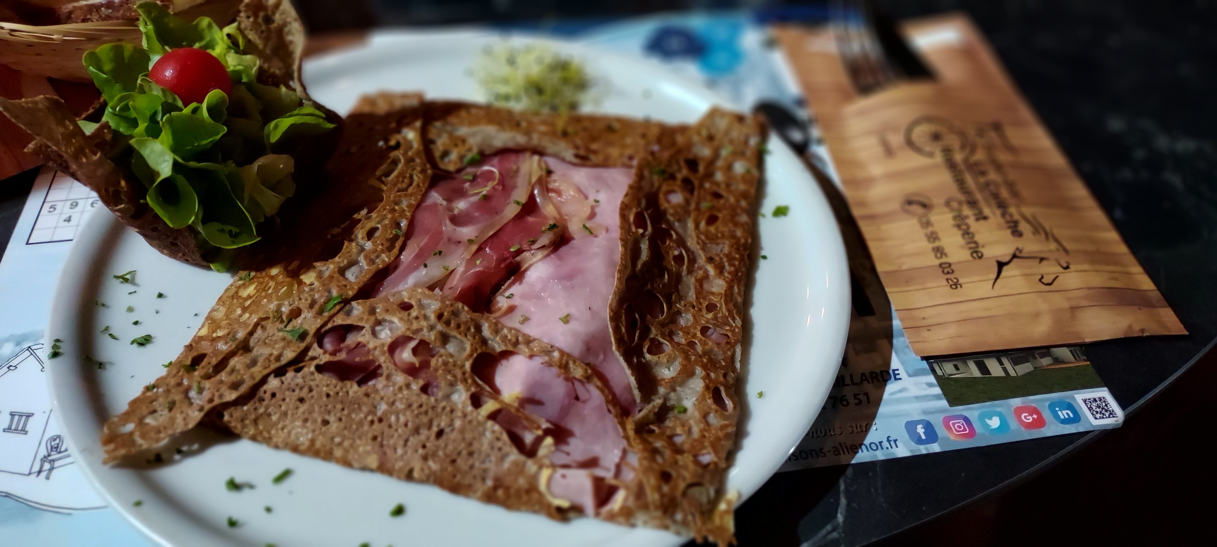 Personnel présent très proche et attentif au client je reconnais que tout est très bon et copieux surtout en salade hélas il n y a pas de prix en dessous de 12€pour une galette garnie d un oeuf jambon fromage ce que nous avons mangé était bon je peux dire que l'on peut y aller manger même à 21 heure