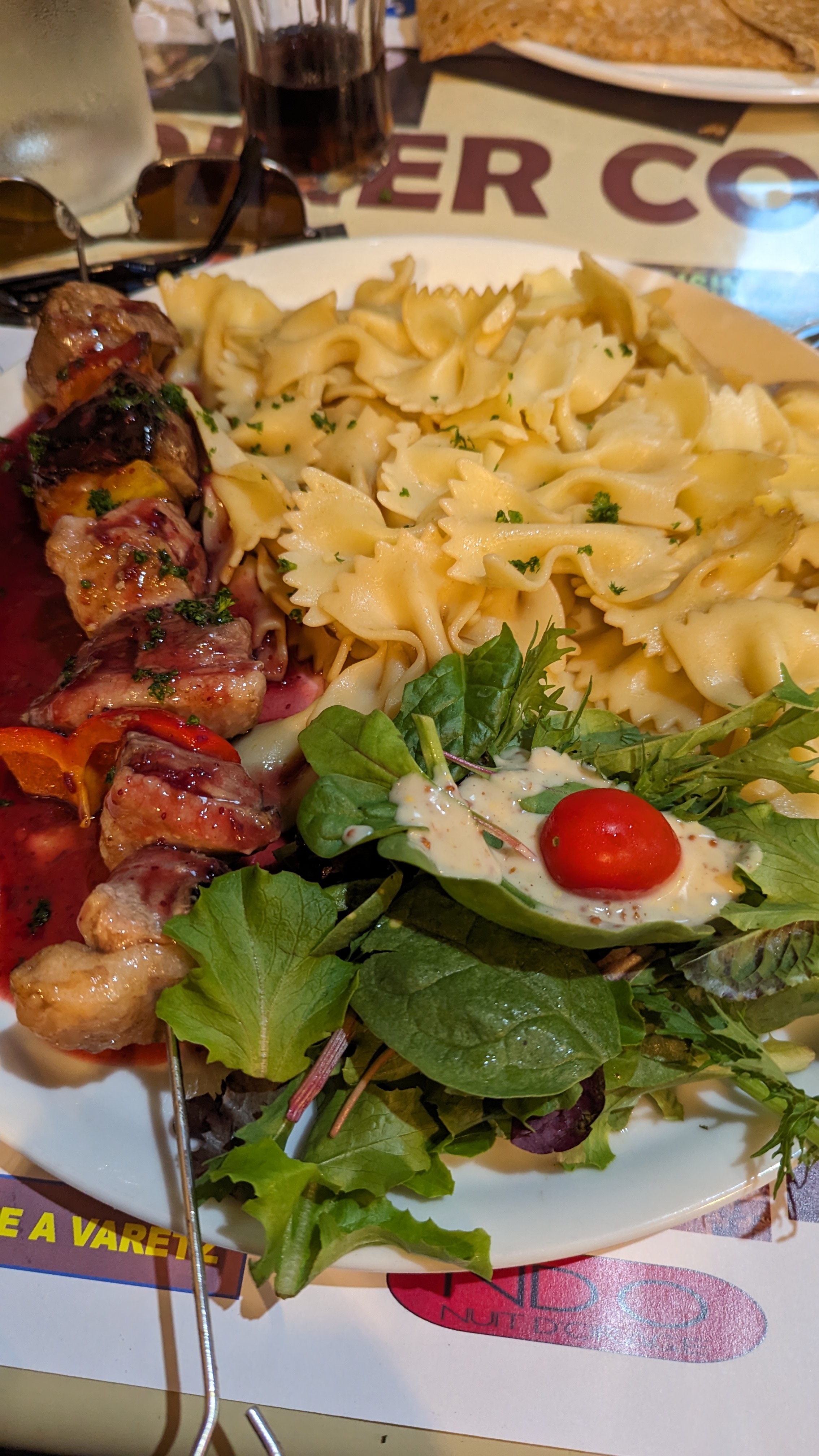 Salade trop chère pour le contenu. Trop pauvre en viande et légumes. Tomates cerises ridicules même pas coupées en deux, présentation désolante. Service à revoir pour certains. Attendue le pain et la boisson, donner à la fin du repas en réclamant. Point positif : cadre agréable.