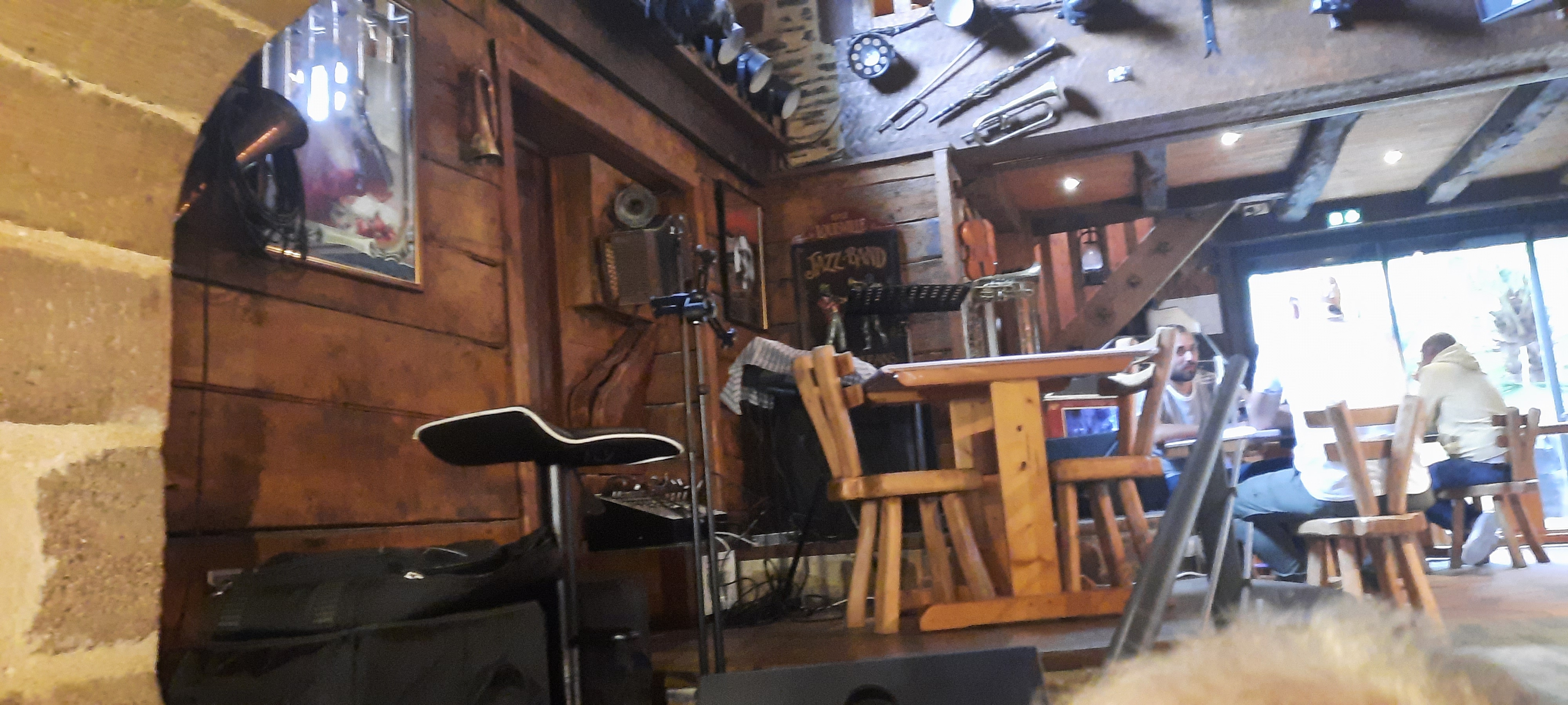 Nous avons quitté l'autoroute pour trouver un restaurant sympa pour terminer les vacances. Nous ne regrettons pas ! Le détour en valait la peine et on y retournera, pas par hasard ! Un cadre chaleureux, mobilier en bois, de magnifiques sculptures ( la moto,), décoration sur le thème de la musique bien évidemment ! Un menu servi relativement vite alors qu'il nous avait été dit qu'il y aurait de l'attente et savoureux.