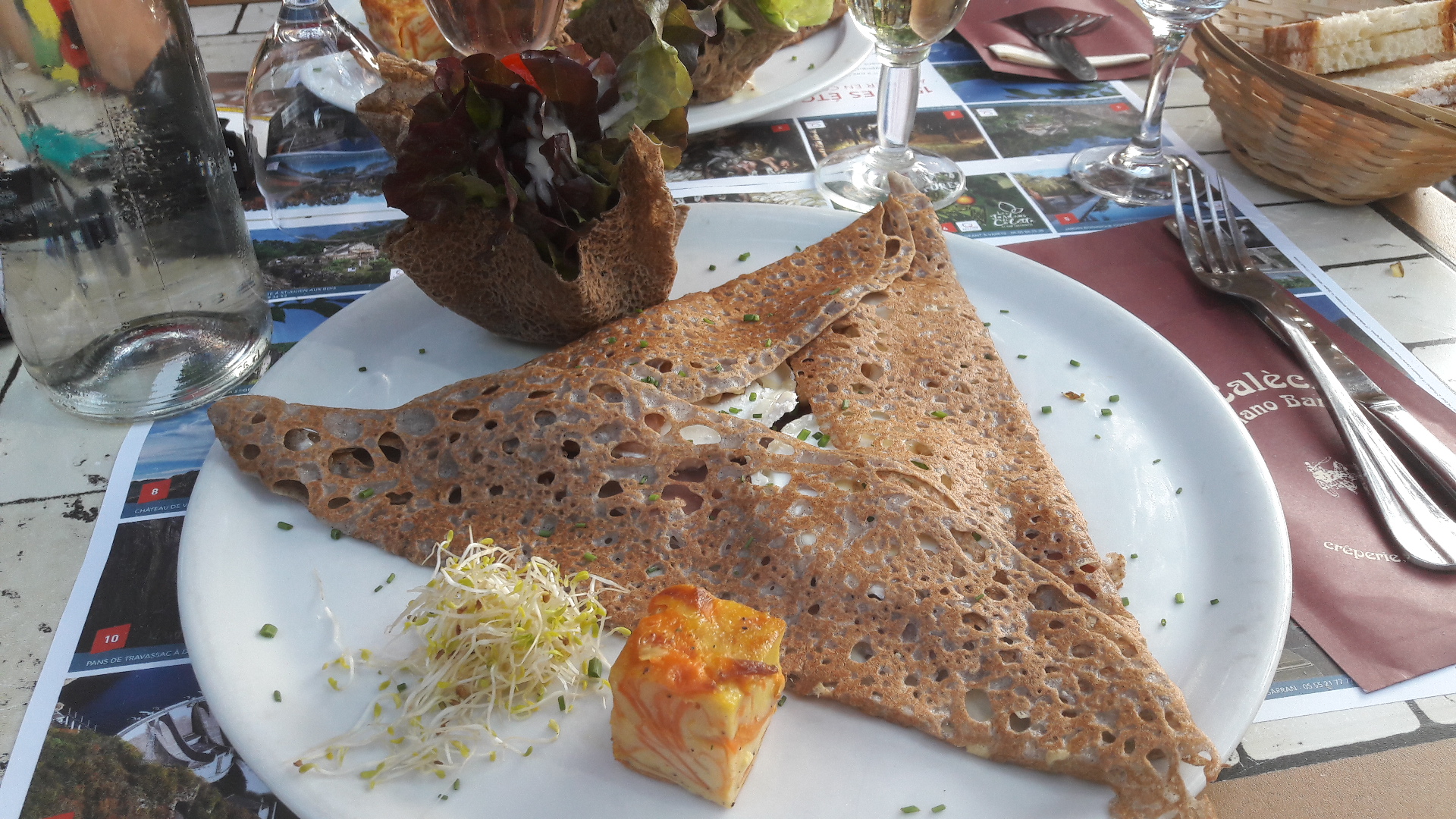 Quelque peu déçue. Nous avons pris des salades composées (une avec des croquettes de camembert et l'autre au chèvre) et pour 17€ beaucoup de salade verte et peu d'accompagnement... Par contre le dessert excellent. La terrasse ombragée très sympa, joli cadre. Les serveuses étaient au top, bravo mesdemoiselles ! Est ce que je conseille ? Oui mais pas les salades... Je pense que les galettes ou la viande sont des meilleurs choix...