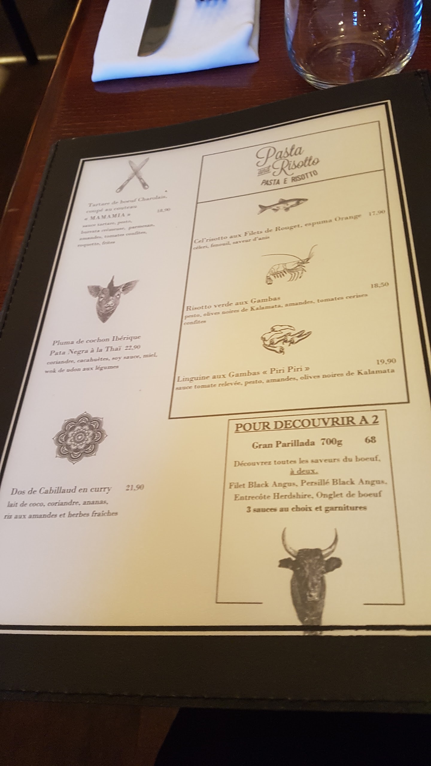 Principalement pour amateurs de viande (beaux morceaux de viande bien accompagnés), mais également des burgers et quelques plats autour des produits de la mer. Un menu change chaque semaine pour varier les envies. Nous y passons toujours un très bon moment : bel accueil, belle présentation des plats, prix corrects.