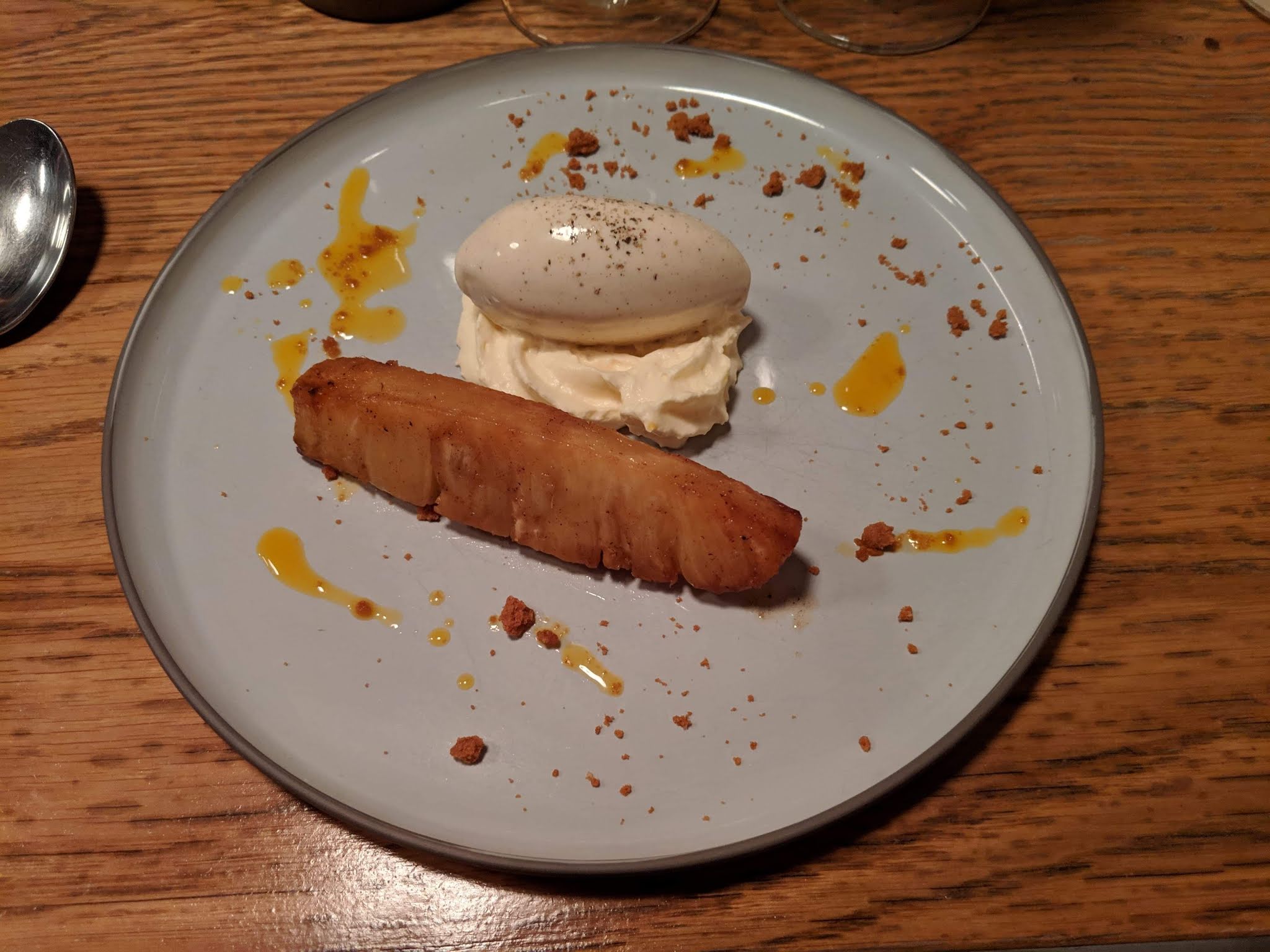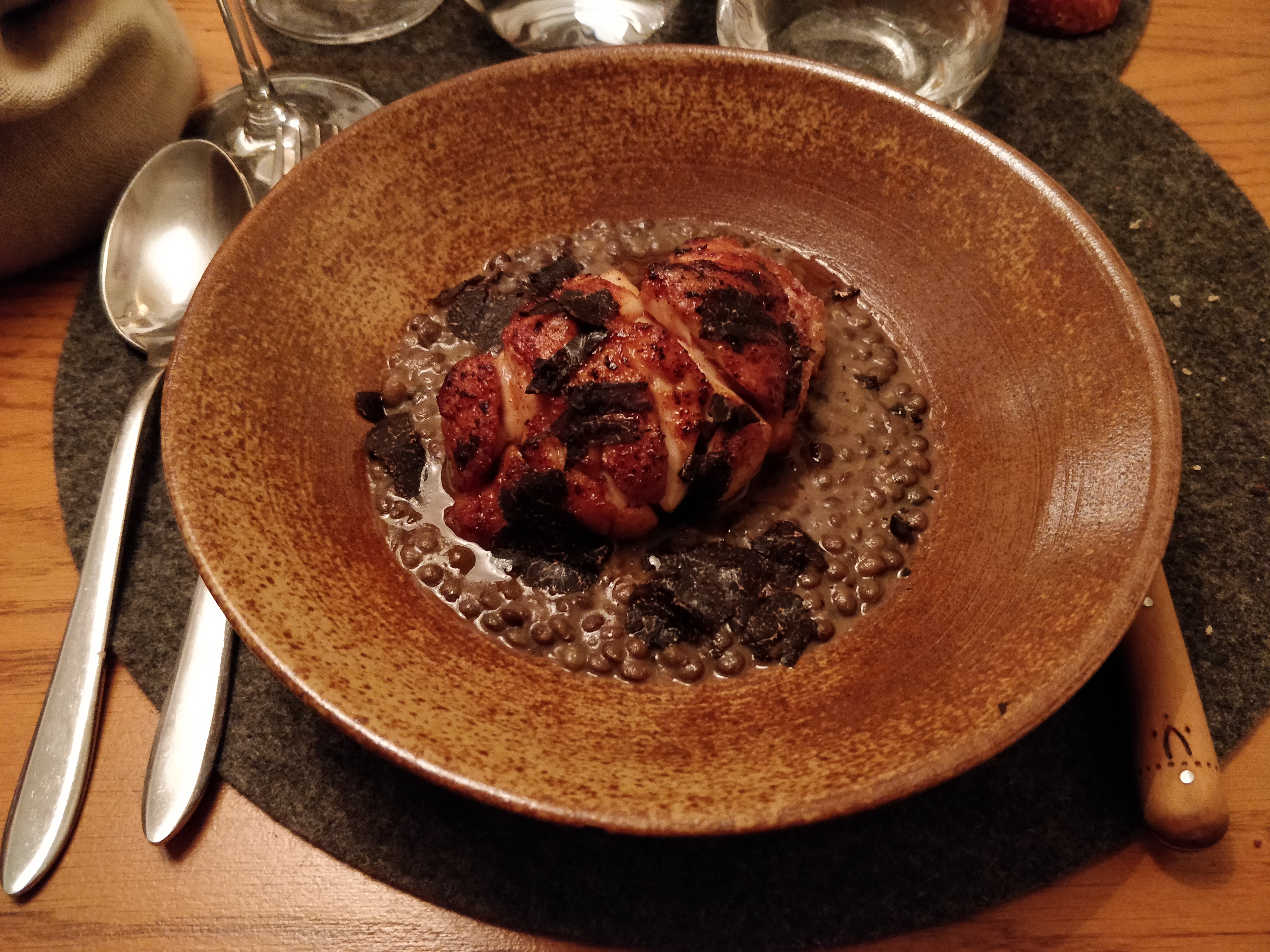 Au dîner, menu découverte cohérent. Une belle maîtrise sur les cuissons, pas de temps faible, les plats se suivent de manière fluide. Un lieu jaune dans des saveurs automnales très réussi, des desserts assez régressifs mais particulièrement efficaces, tout fonctionne. Deux gros points forts sur le service, chaleureux sans en faire trop ; et le choix des vins, original avec des mariages parfaits.