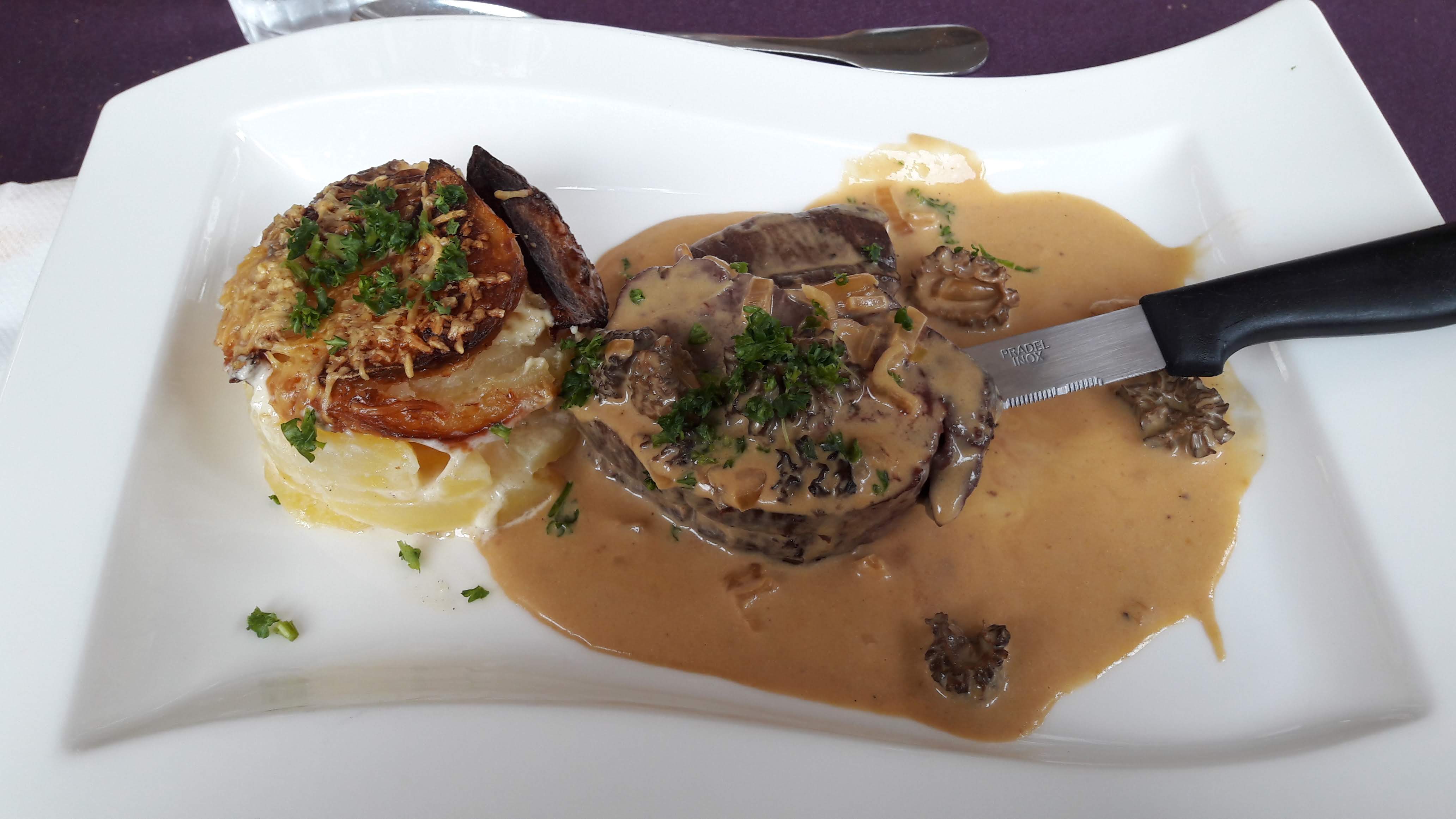 Excellent restaurant qui malgré l'affluence arrive à bien gérer les délais. Équipe à l'écoute car pour ma part le veau et le poisson ne m'allaient pas. J'ai donc eu droit à un très bon morceau de faux filet. Pas de souci d stationnement car très grand parking gratuit en face.