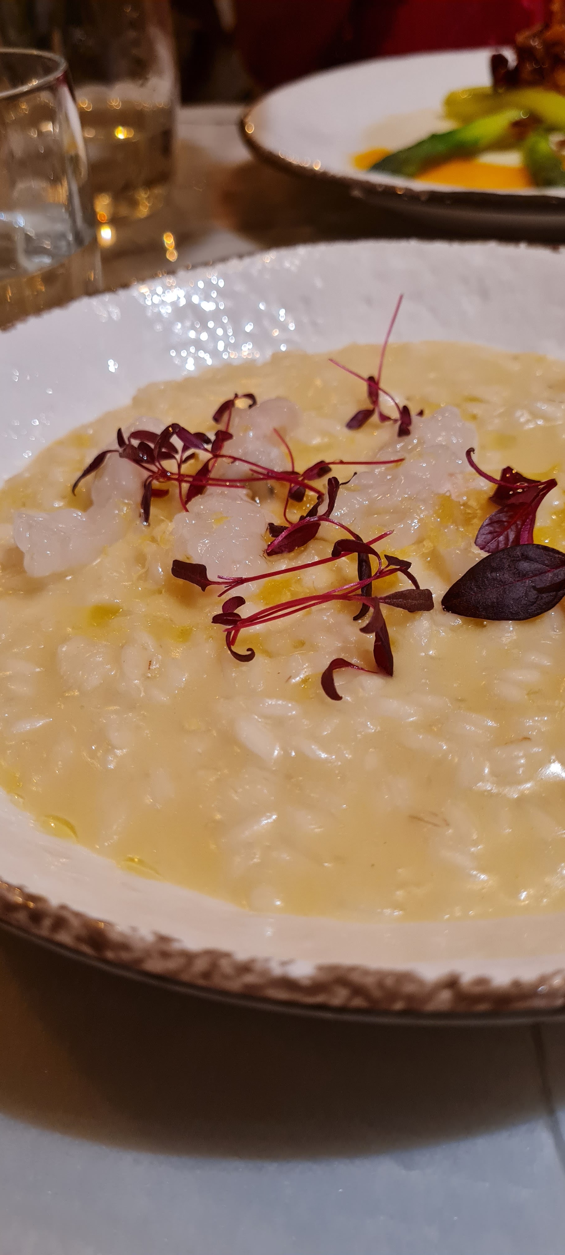 Très délicieux risotto et apéritif amusant au pain focaccia. Terminé avec un dessert pana cotta à la pistache.