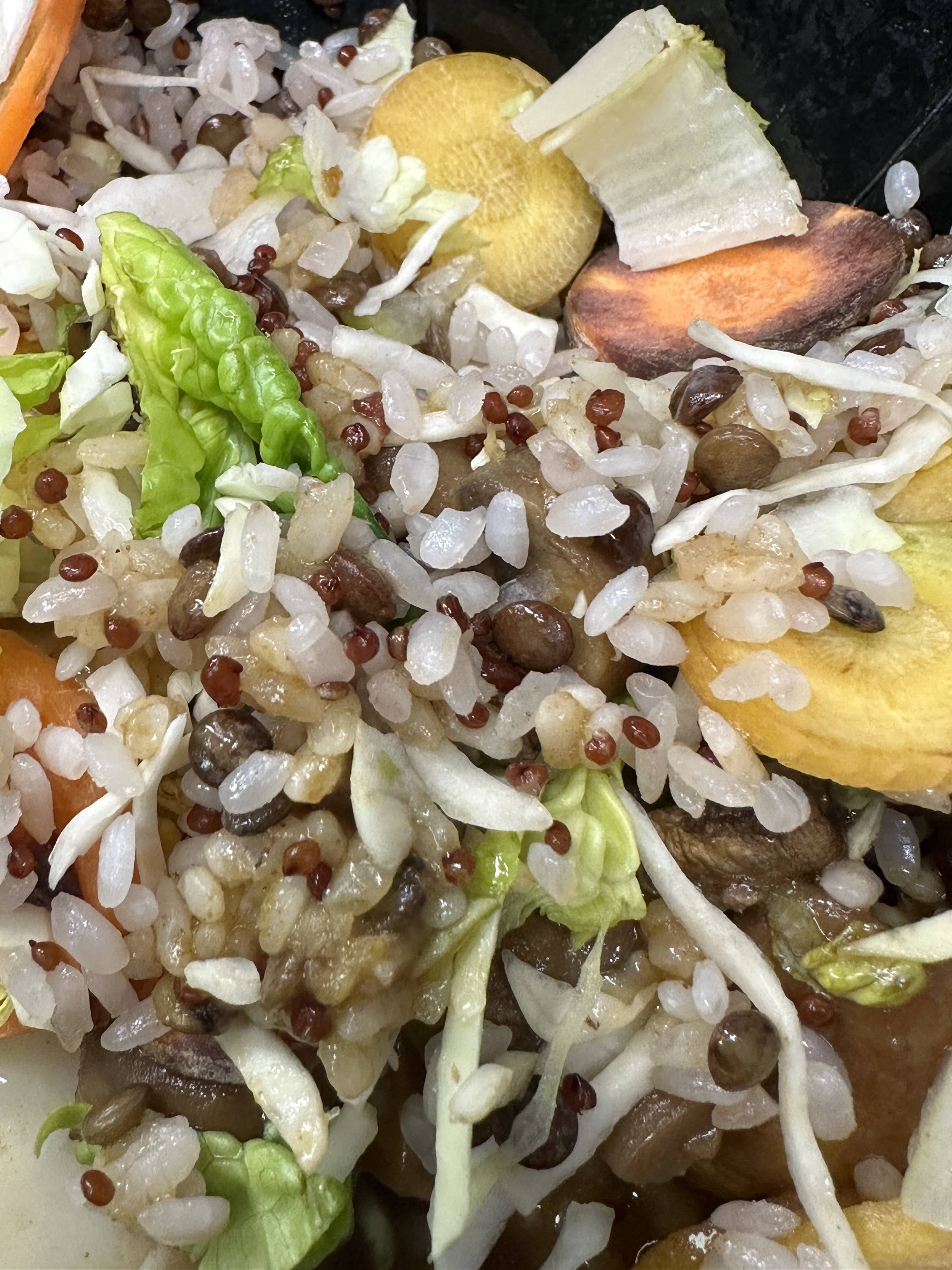 Bimbimbap éclaté avec des légumes durs à s'en briser les dents. En plus je paye 1 euro pour des couverts en bois recyclés, et au final j'en ai pas dans ma commande et je dois manger avec les mains.