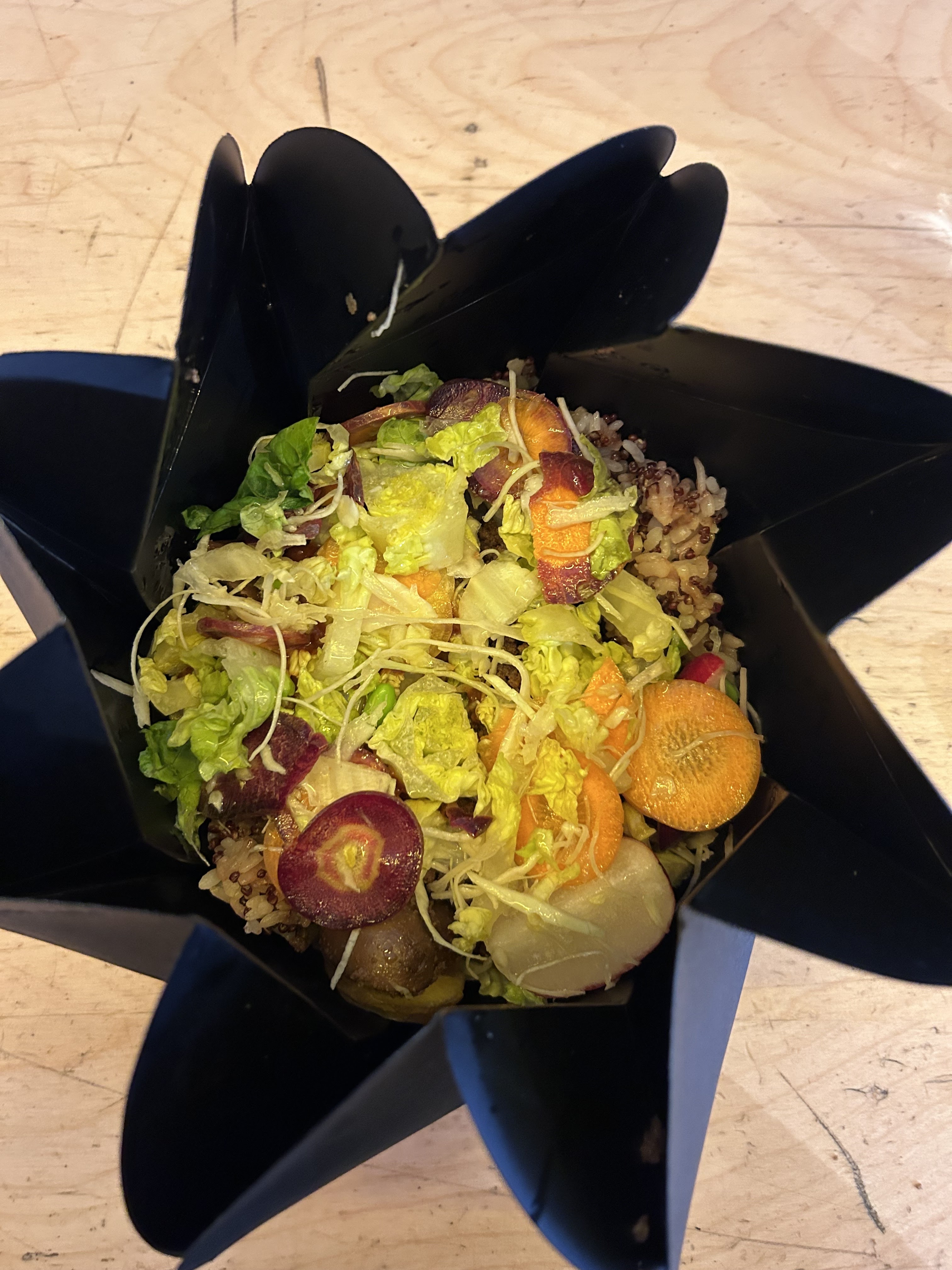 Très déçue... Servi complètement froid... même pas tiède... (On m'a répondu que ça se mangeait ainsi 😕) Le crumble était glacé. Je trouve le concept de l'emballage top pour le take away mais quand vous mangez sur place c'est un peu dommage même si celui-ci est plutôt joli. Manque de chaleur dans le lieu.