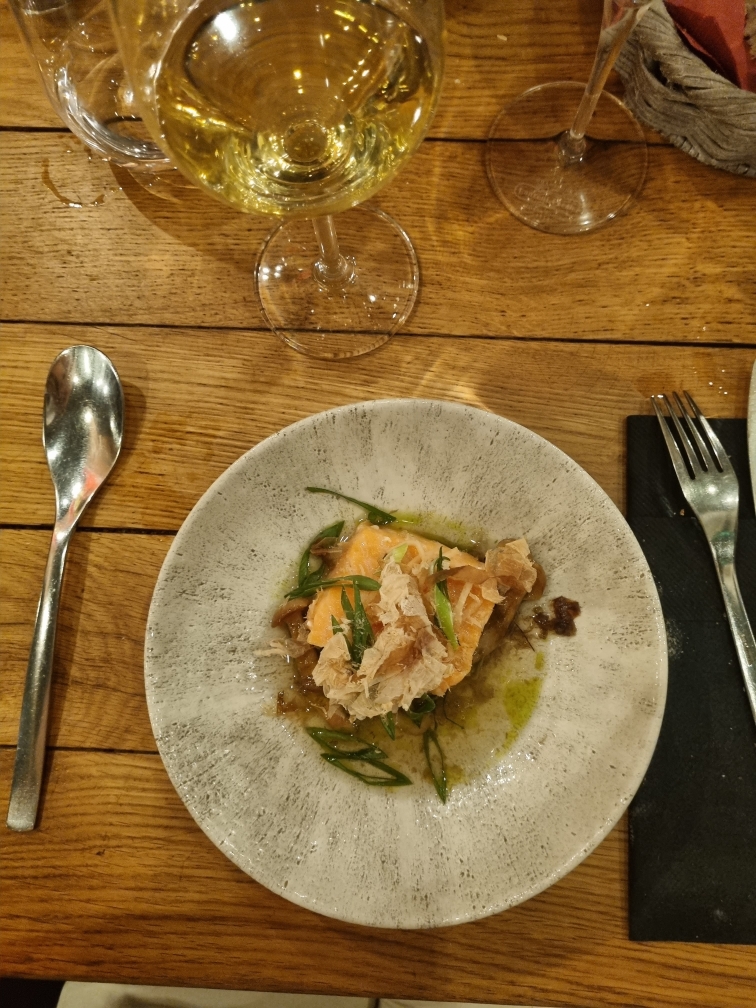 Il y a 7 plats au total. Chacun d’eux est incroyablement parfait !! Et ils suggèrent de bons accords mets et vins, assez chers mais inestimables avec ces plats bien équilibrés. Surtout, l'entrée qui est du poisson cuit était extrêmement délicieuse. Je n'ai jamais mangé de poisson parfaitement bien cuit et j'ai peur de ne plus jamais en manger :'( Si votre budget est suffisant ou tendu, je le recommanderais à 100 ! Attention, le cours complet dure environ 3h !