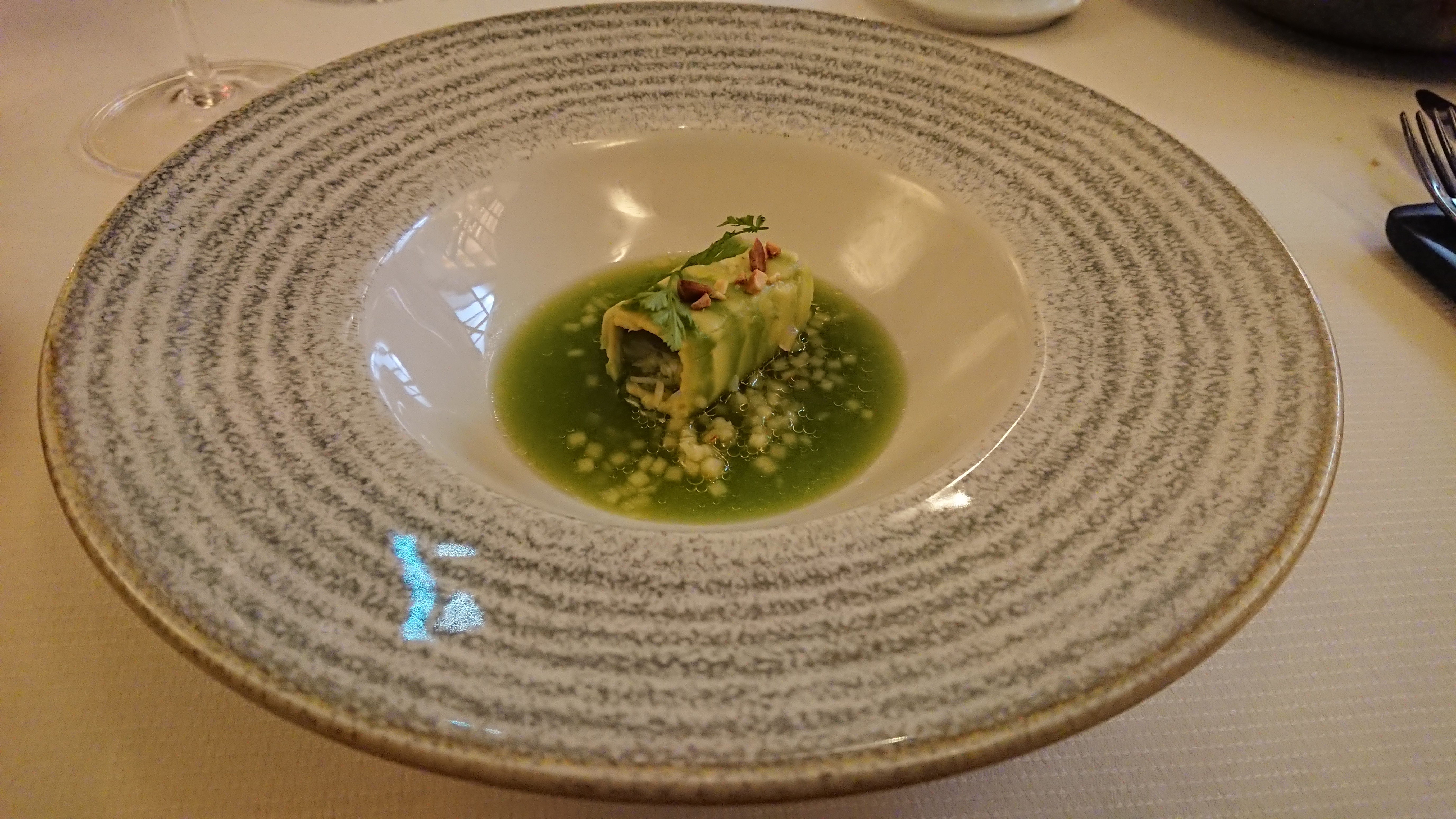 Beau, bon, mais quelques remarques. Les plats sont bons, très bien présentés mais cela manque du petit effet de surprise que l'on d'un chef de ce niveau. Un service brouillon : - La plupart des plats nous ont été présentés deux fois de suite lors de leur service, et aussi ensuite lorsque nous étions débarrassés, ce qui fait que nous étions sans cesse interrompu lors de nos conversations. - La personne responsable de l'accord mets et vins nous décrit le vin à venir afin de savoir si cela nous convient et finalement nous en sert un autre sans explication. Un repas servi trop rapidement : - Seulement 2 créneaux de réservation 19h45 et 21h45, et attention sur celui de 21h45 les 6 plats vous sont servis à la chaine ce qui ne permet pas de déguster tranquillement ces derniers ainsi que les vins allant avec. Dommage que tous ces petits grains de sable gâchent l'expérience.