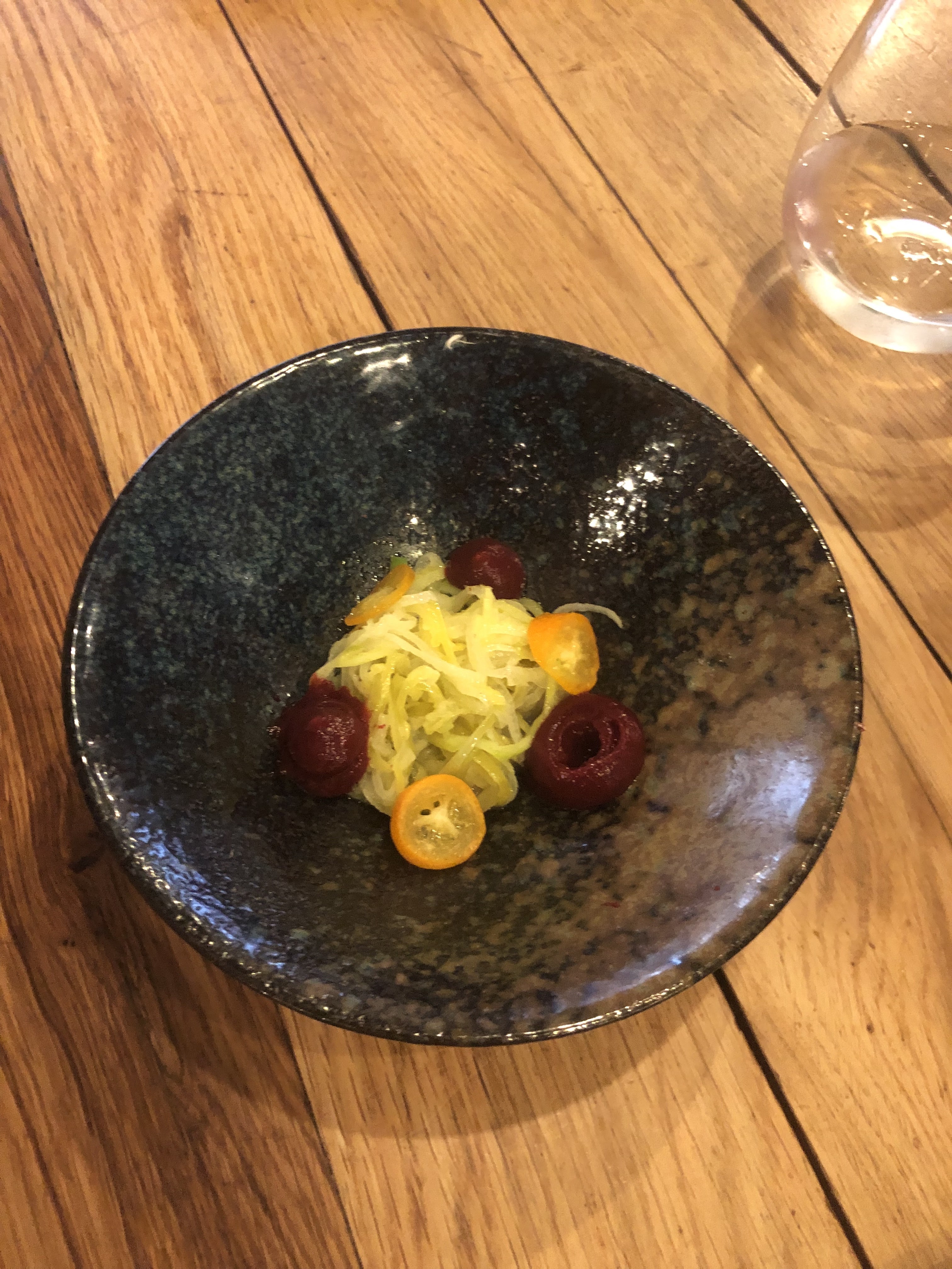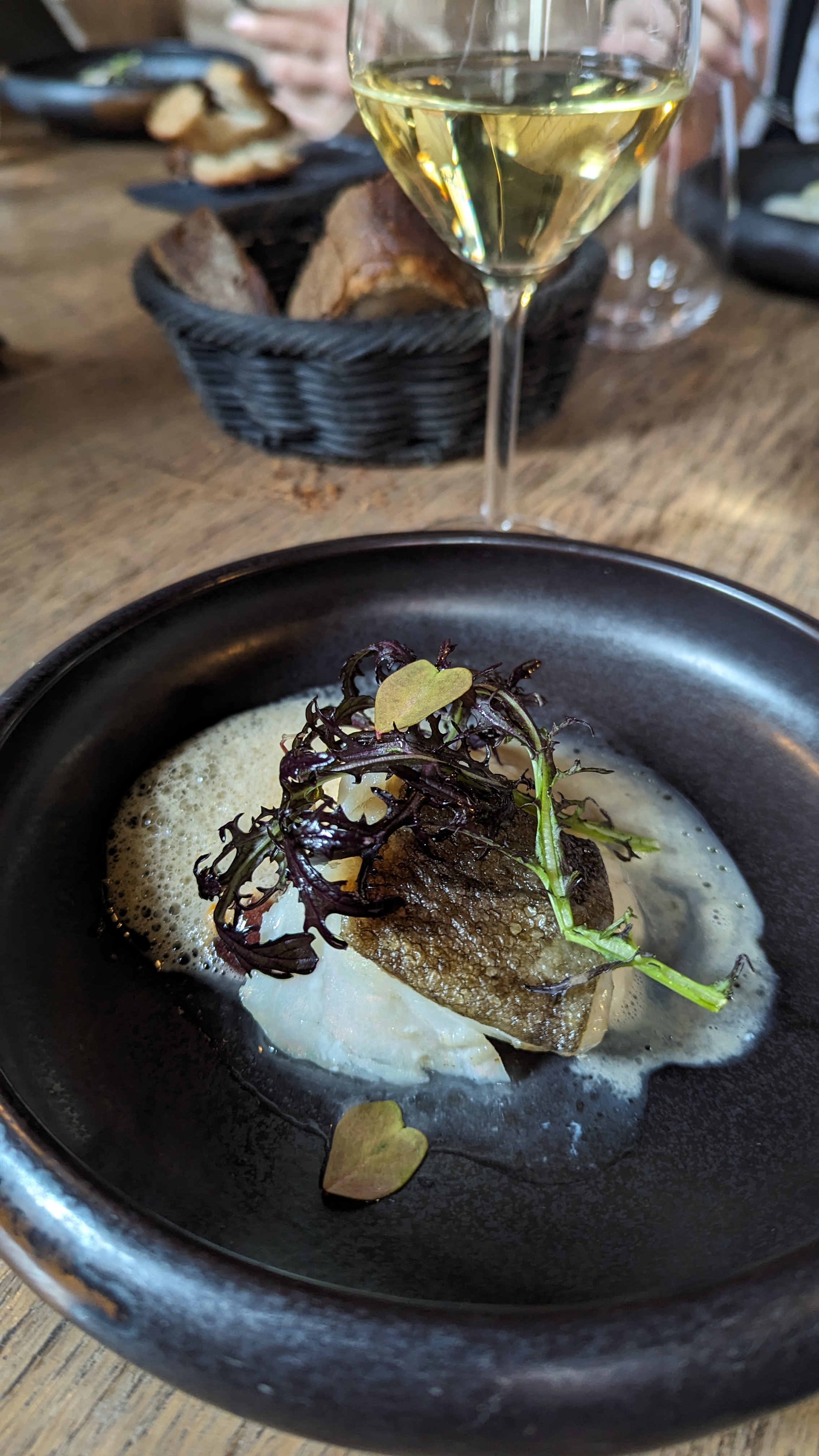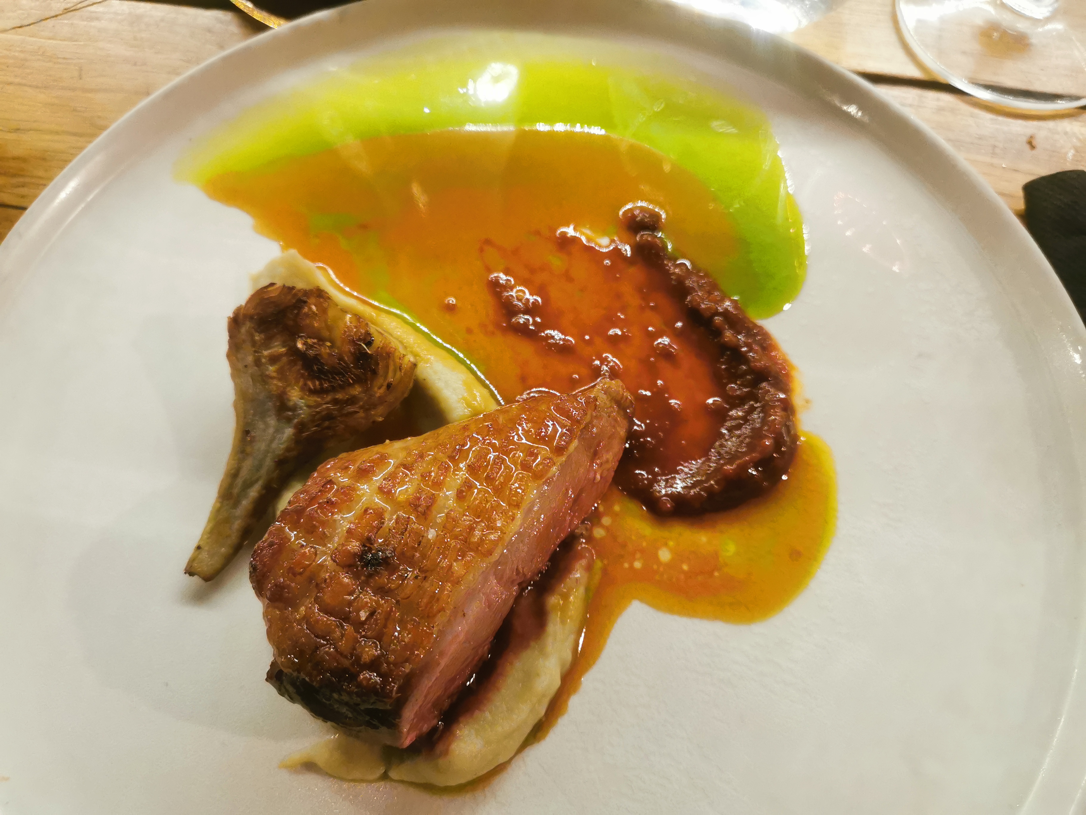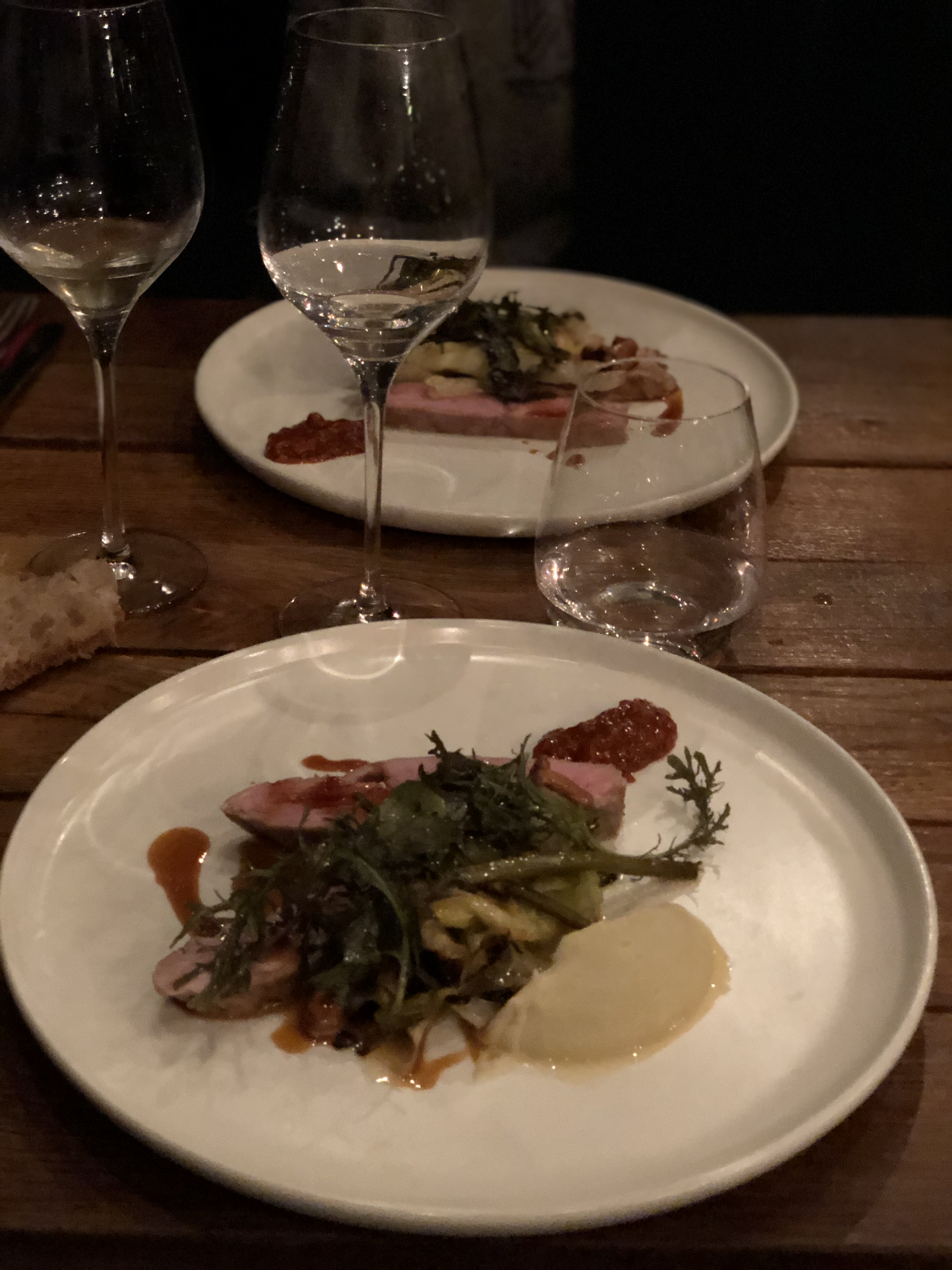 Expérience assez décevante dans l'ensemble, cela a commencé avec le restaurant en rénovation et ils ont donc déménagé dans un autre endroit, sauf que cela était mal indiqué et nous a amené à faire 3 fois le tour du pâté de maisons avant de finalement trouver le bon endroit. L’avantage de cet espace temporaire est qu’il est assez grand, il ne semble donc pas bondé comme certains autres endroits. Mais la ventilation était assez mauvaise et la cuisine était également très bruyante, ce qui rendait assez difficile la conversation à notre table. Je plains le couple qui était assis le plus près de l’îlot de cuisine, je ne sais pas comment ils ont tenu le coup ! Quant à la nourriture, elle était intéressante, bien préparée et savoureuse dans l'ensemble. Mais ce n’était pas aussi spectaculaire que je l’aurais imaginé. Le plat de viande principal était le magret de canard et j'ai vraiment eu du mal à le couper car la viande était très dure. Nous voulions du vin avec le nouveau mais la carte des vins est complètement exagérée, le prix moyen des bouteilles était probablement de 100 à 200 euros avec des extrêmes de 4K. Bien sûr, je comprends qu'avoir une cave bien remplie est une bonne chose, mais quand le repas est au prix de 50 euros/personne, payer 80 euros pour une des bouteilles de vins les moins chères semble un peu extrême. Cela aurait été bien s'ils avaient plus d'options à un prix plus raisonnable, disons 40 à 50 euros.