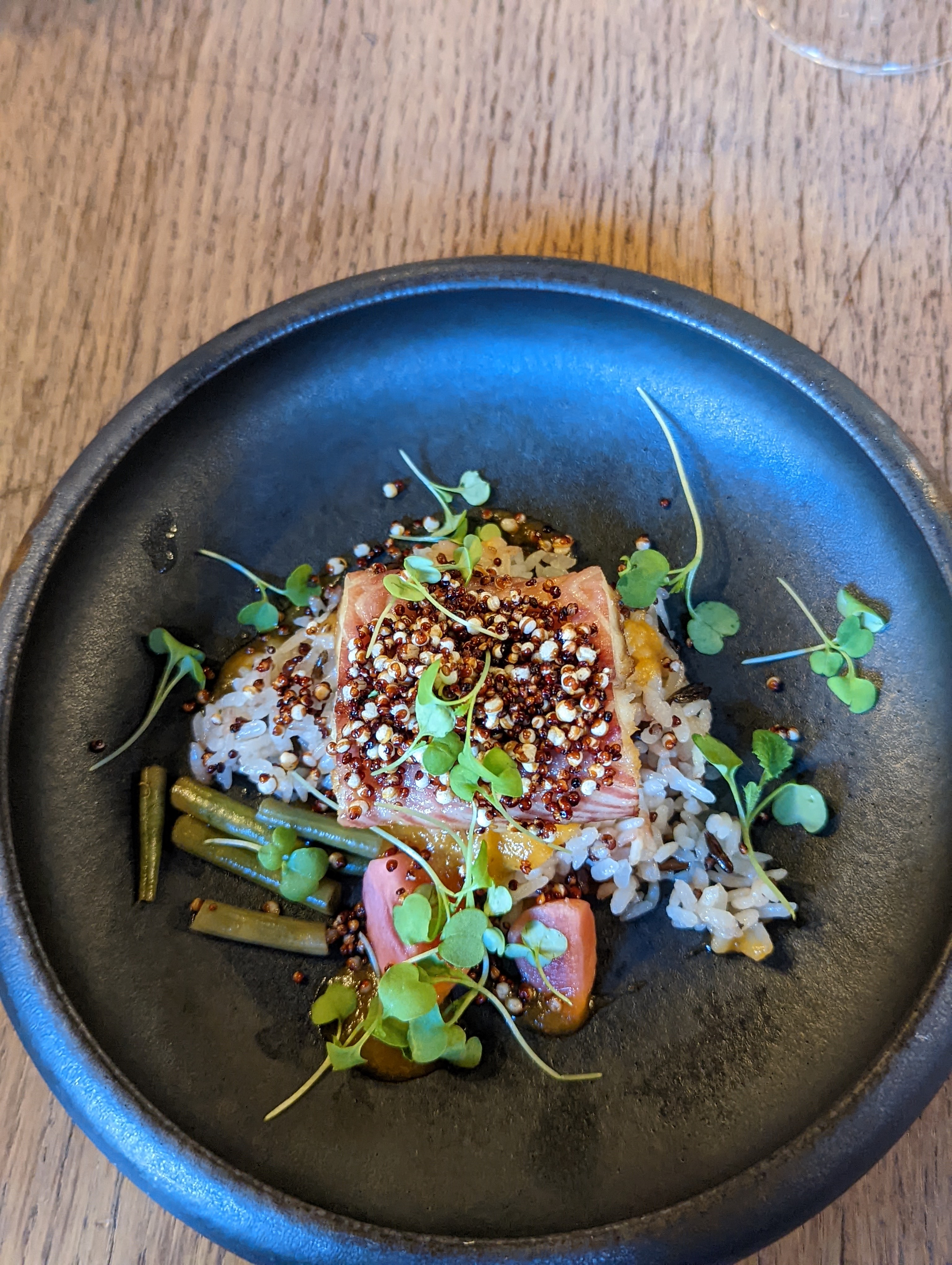 Soirée très agréable, l'échange avec les cuisiniers sur les saveurs, avec le sommelier sur le vin, avec si l'envie vous en dit vos voisins qui cherchent en même temps que vous les goûts dans l'assiette (menu à l'aveugle) et des plats super justes, gros coup de cœur pour le thon rouge, quinoa soufflé pâte miso pimentée, les plats sont originaux et différents de ce qu'on peut voir ailleurs. Moins de 60 euros le menu en 5 service et amuse bouche c'est franchement chouette.