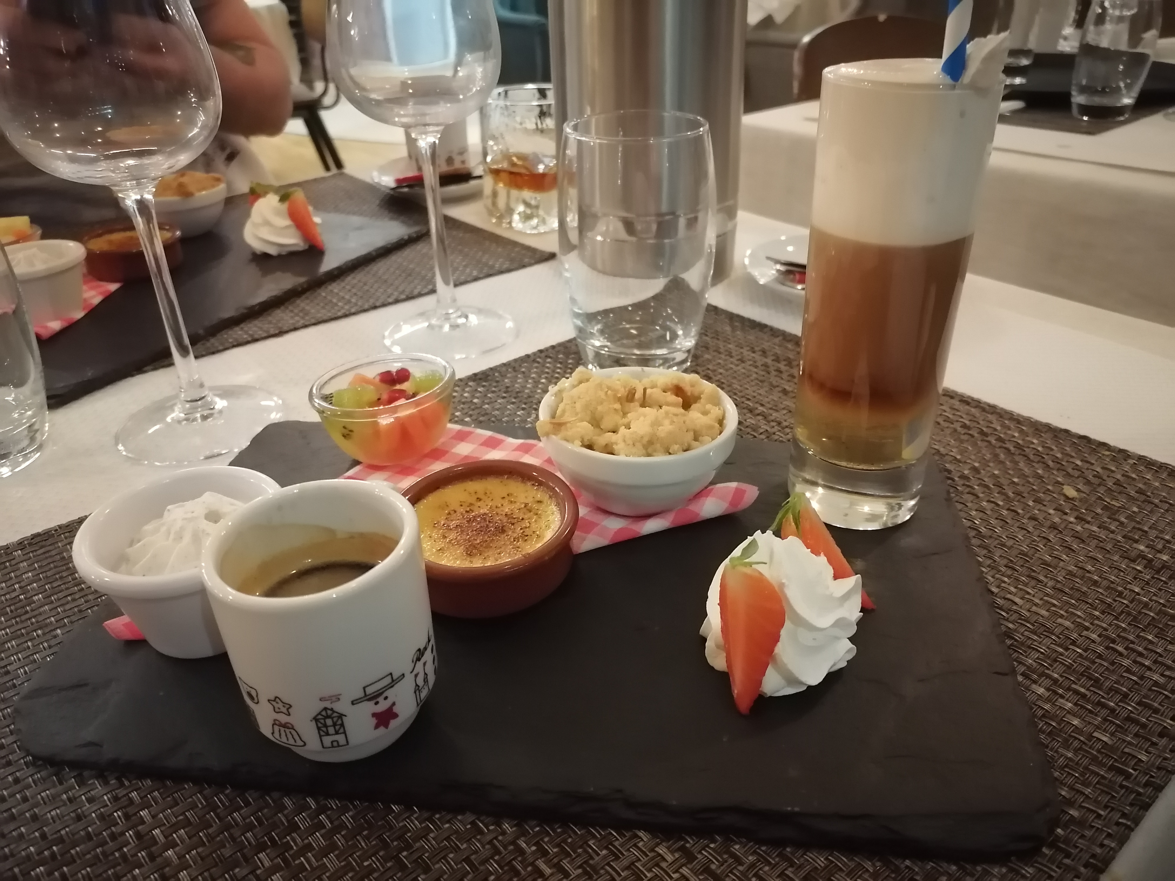 La décoration est très sympa. L’accueil l’est tout autant, et les plats sont excellents ! Pièce de bœuf en pierrade à volonté avec ces frites maison et crème brûlée à la pistache