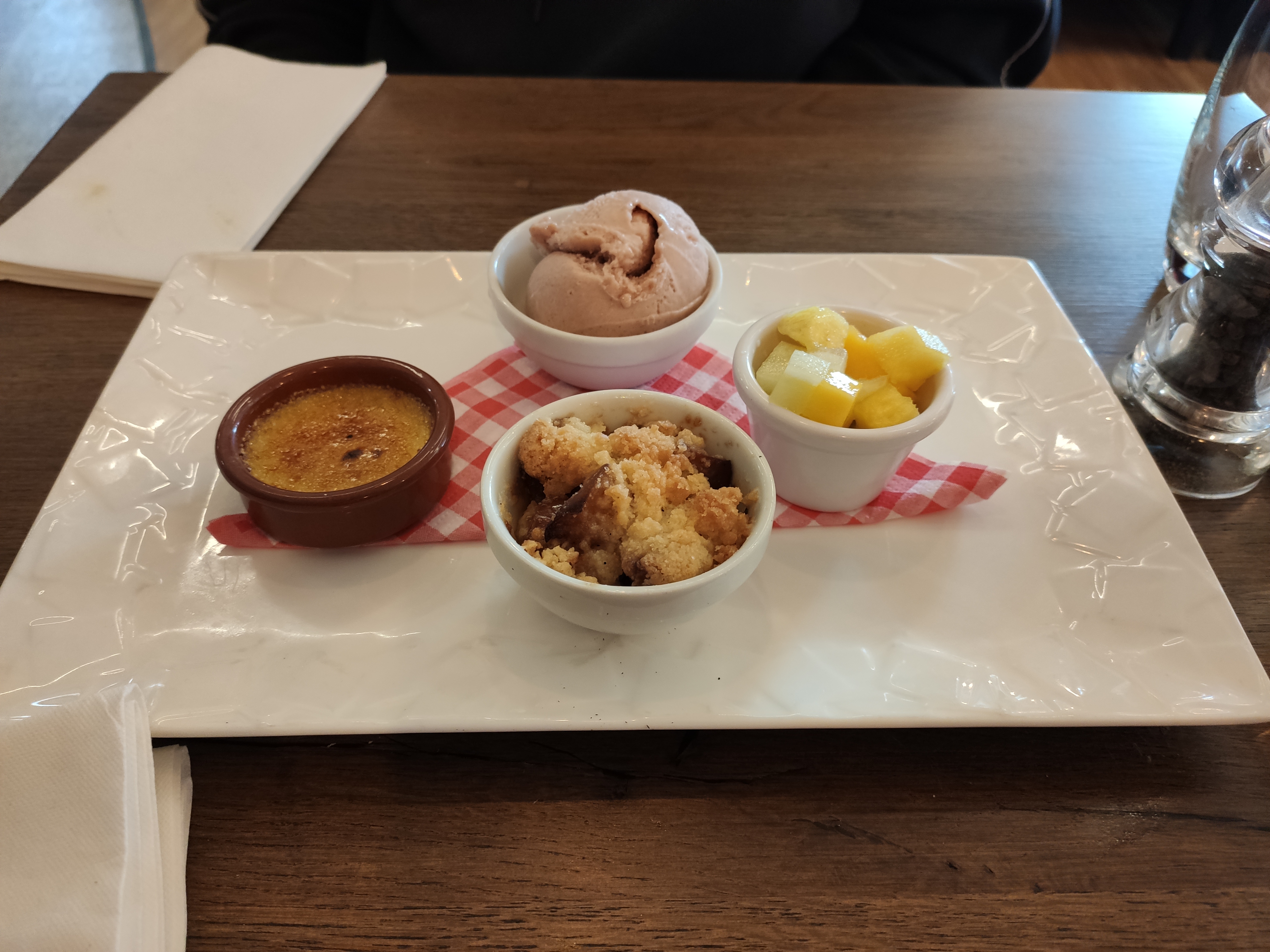 L' entrée saumon et betteraves bien préparé mais les rillettes de sardines surchargées en graines de moutarde dénaturatant le goût de l'ingrédient de base, dommage. L'ensemble des plats à base de viande sont excellent qualitativement comme en quantité avec des accompagnements également bon. Par contre la crème brûlée est à oublier