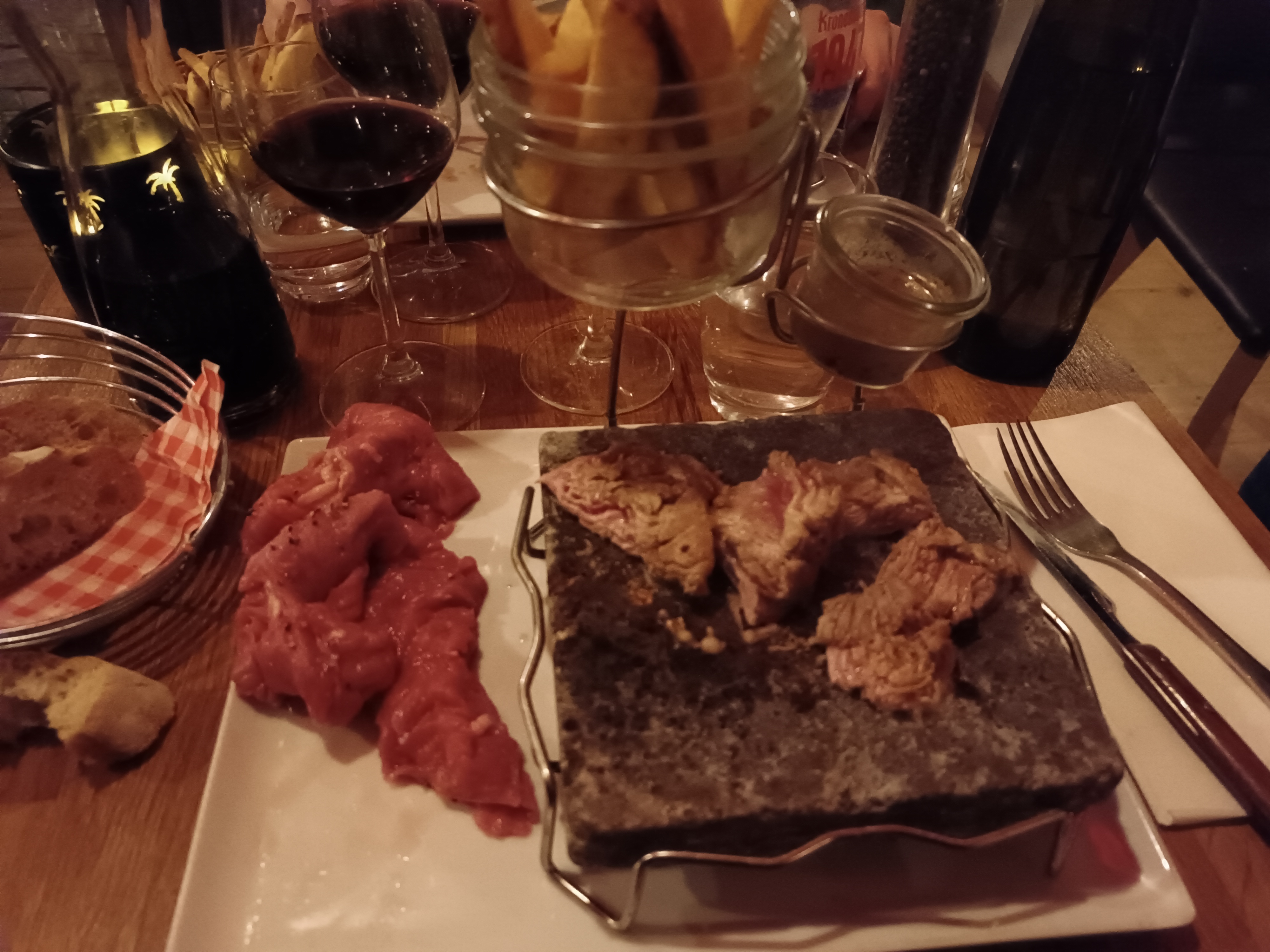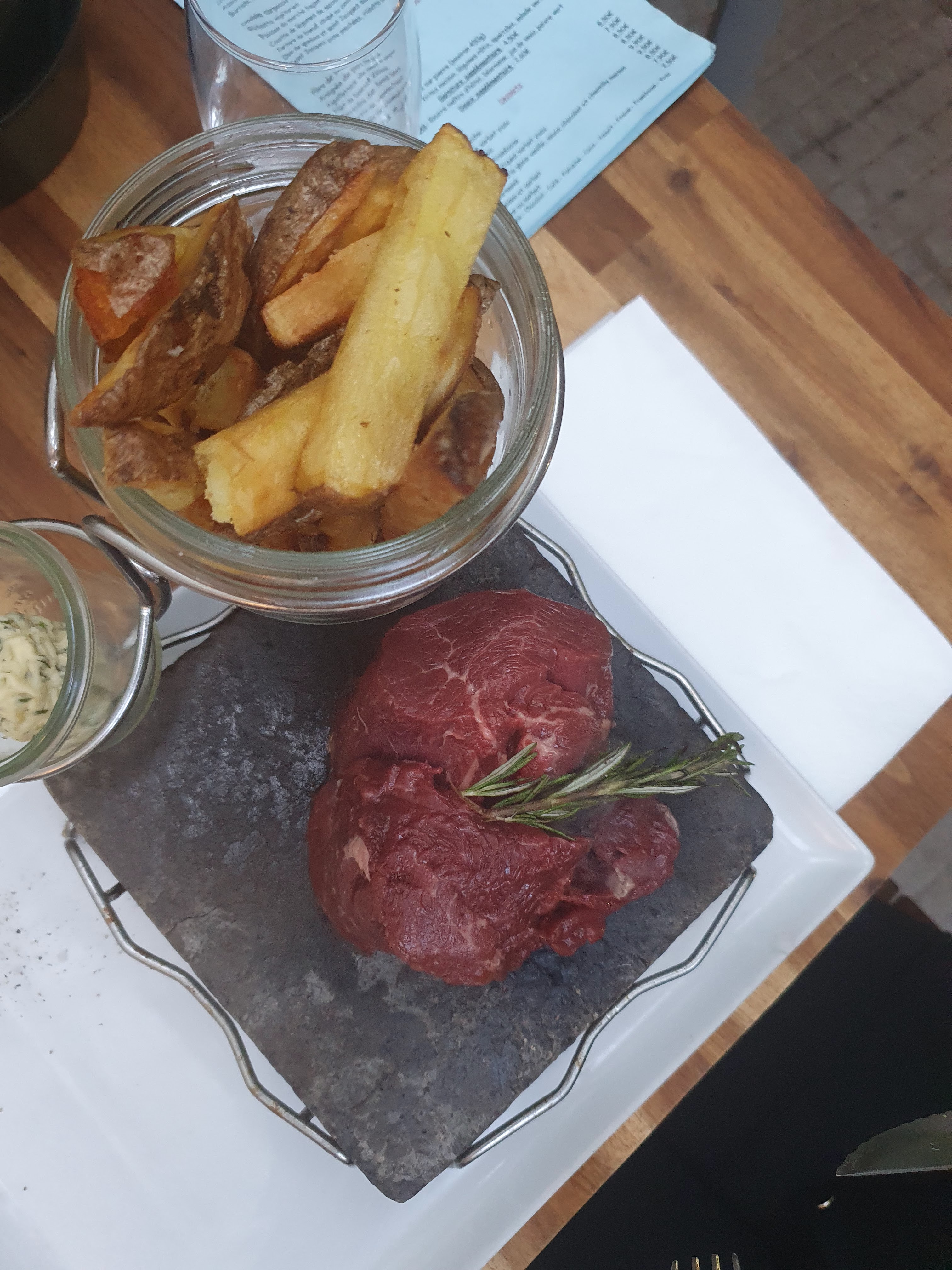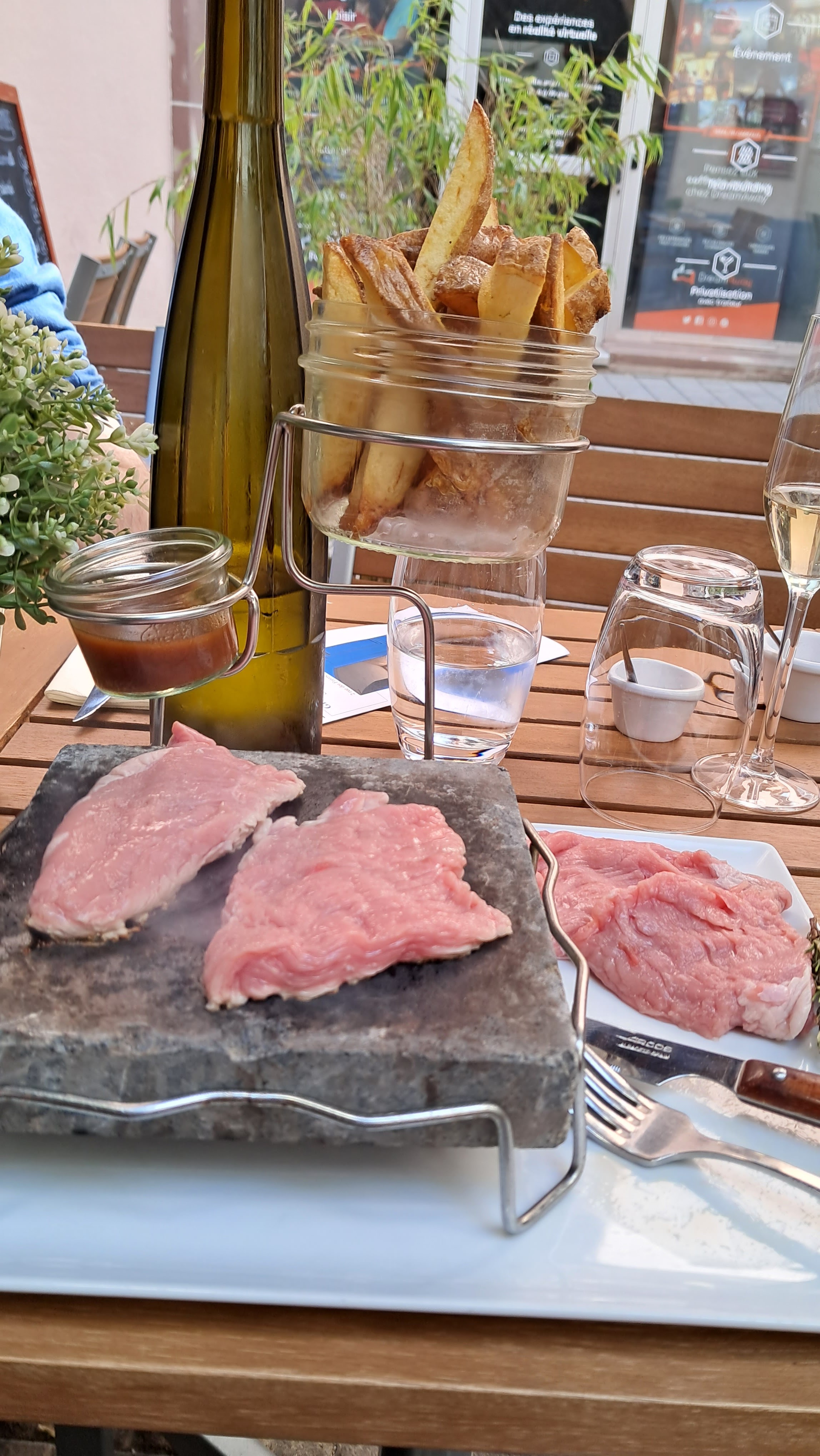 Très bonne viande servi avec des frites maisons (des vrais, pas des surgelés trempées dans l'huile, que la loi autorise à appeler frite maison). La cuisson à la pierre est originale et cela cuit rapidement la viande. Par contre l'attente est plutôt longue pour être servi et notre table était coincé entre deux autres tables et un pied de parasol. On est allé un samedi soir, donc ça n'aide pas non plus, il y avait du monde.