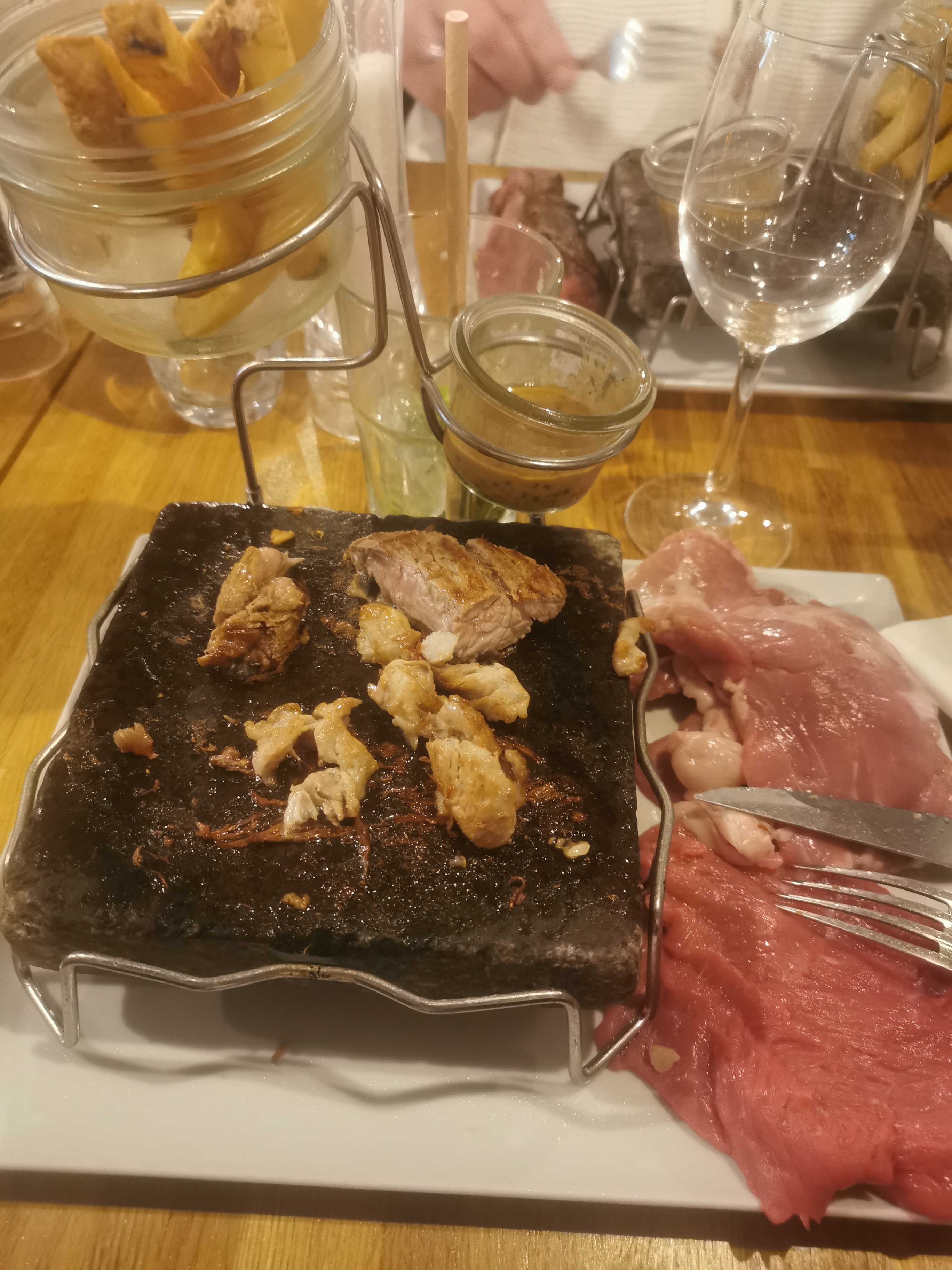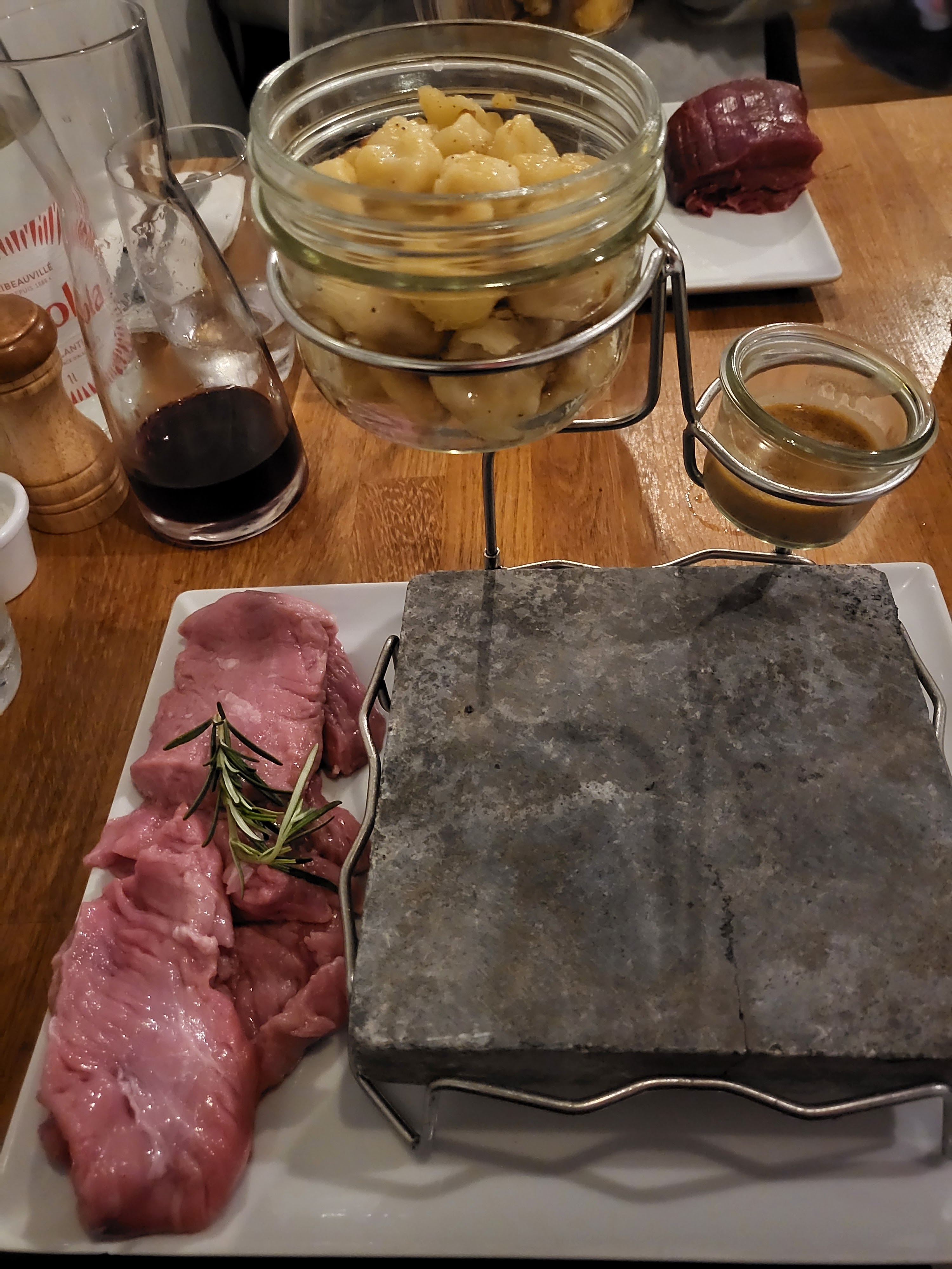 En passant par hasard devant ce restaurant notre curiosité avait été éveillée par le concept de la cuisson sur pierre. Nous avons très bien mangé : un risotto aux Saint-Jacques et un filet de bœuf. Le défaut de la cuisson sur pierre à table : une fumée était présente dans tout le restaurant avec l’odeur de cuisson qui va avec et ce malgré la présence de bouches d’aspiration au niveau des tables. Le service semblait fébrile mais était correct dans l’ensemble pour nous.