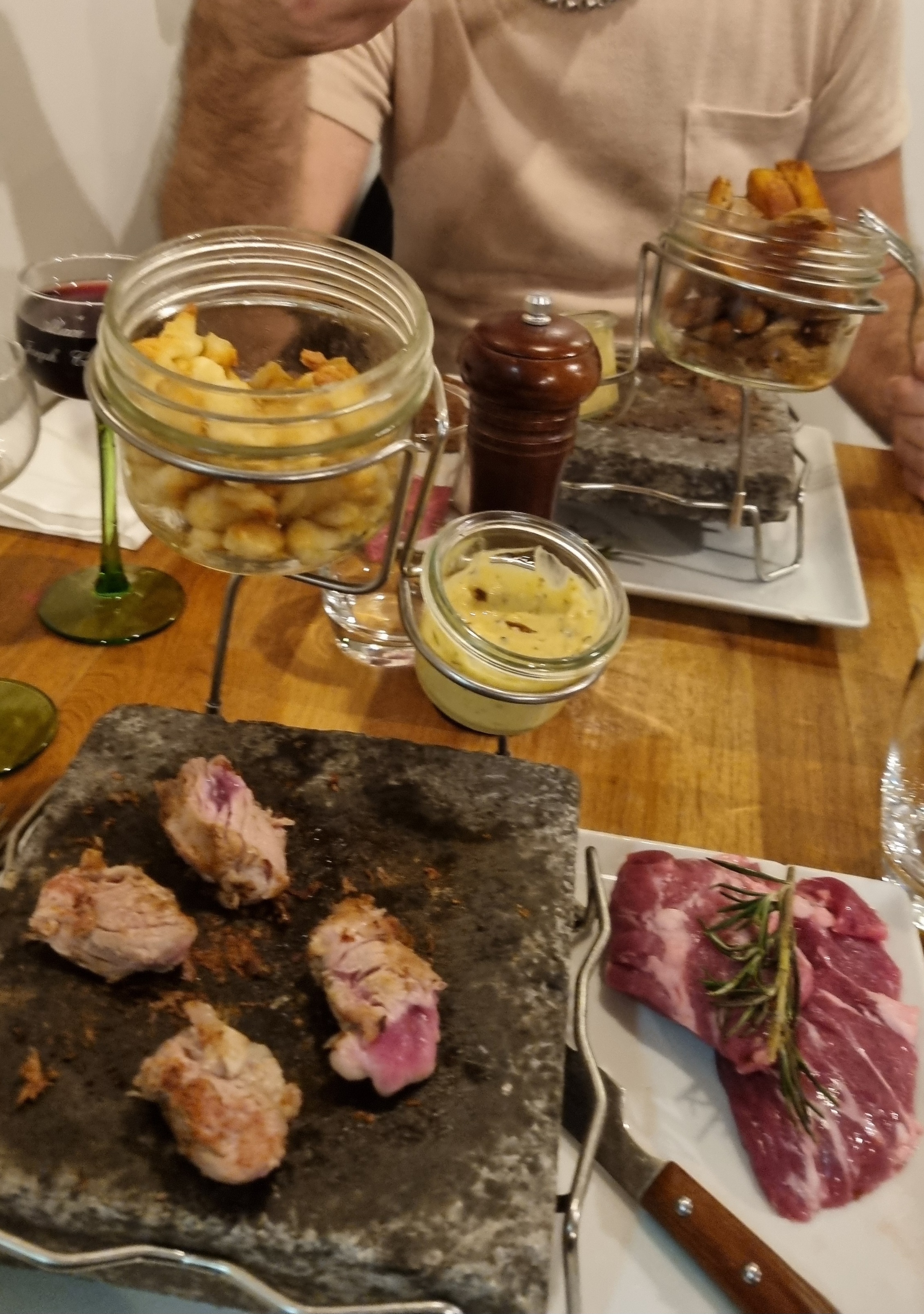 Lieu où on se sent bien - agréable- décor original - il y a de la vie, personnel très accueillant et avenant. A recommander aux grands mangeurs de bonne viande qui pourront cuire sur une pierre très chaude selon leur envie le morceau choisi, choix des accompagnements et sauces. Rillettes de sardines une tuerie, les entrées, les plats, pleins de saveurs - Bravo. ❤ Merci à toute l'équipe
