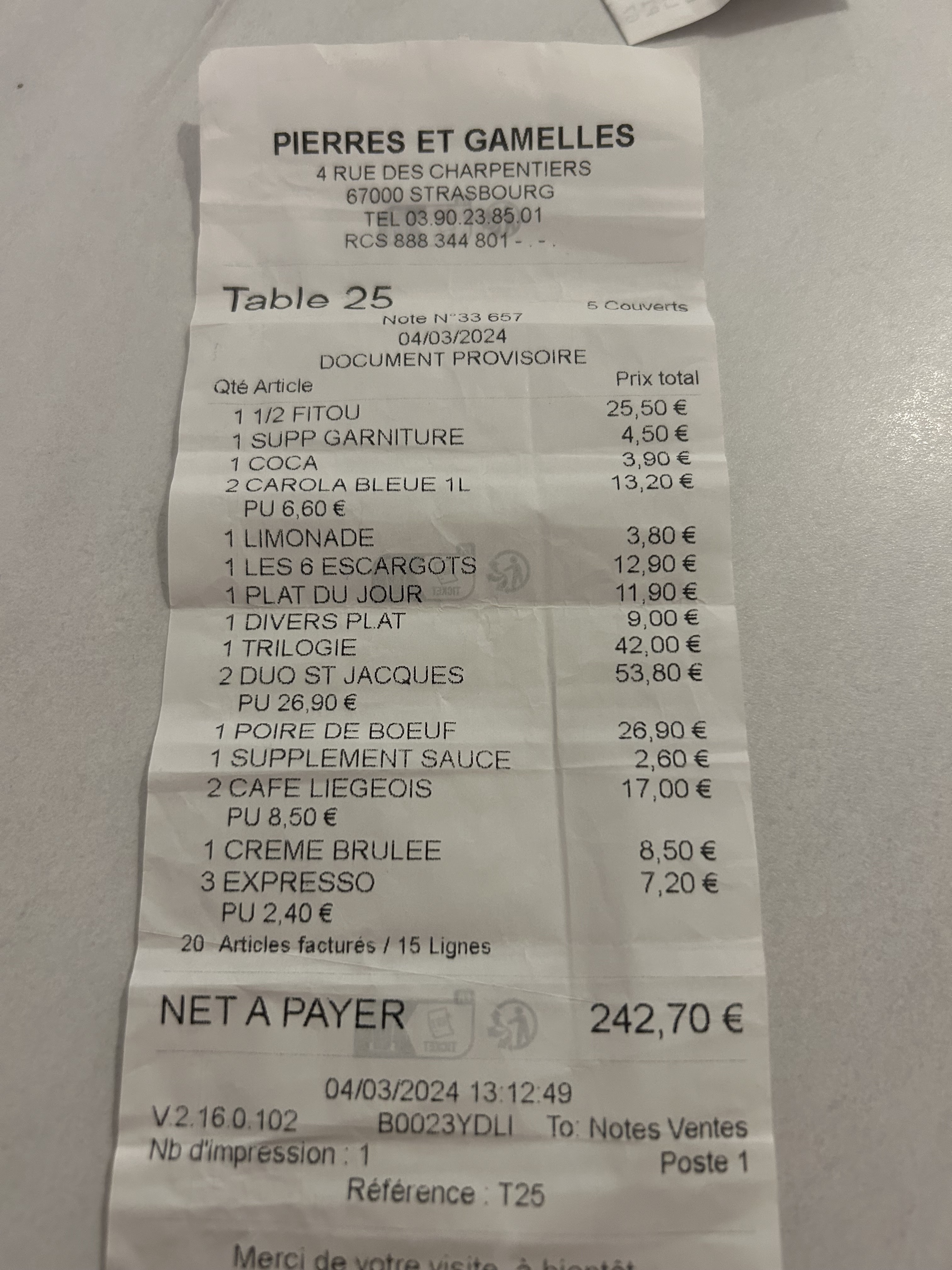 Concept génial mes beaucoup trop cher 😡ATTRAPE TOURISTES !!!! ATTENTION ⛔️ ATTENTION ⚠️ VOUS ÊTES LAMENTABLE 👎 JE NE SUIS PAS UN CLIENT FANTÔME VOILÀ LA FACTURE VOUS ÊTES dans LE FAUX ON peut manger correctement et qualitativement à Strasbourg sans pour étant DÉPENSER autant