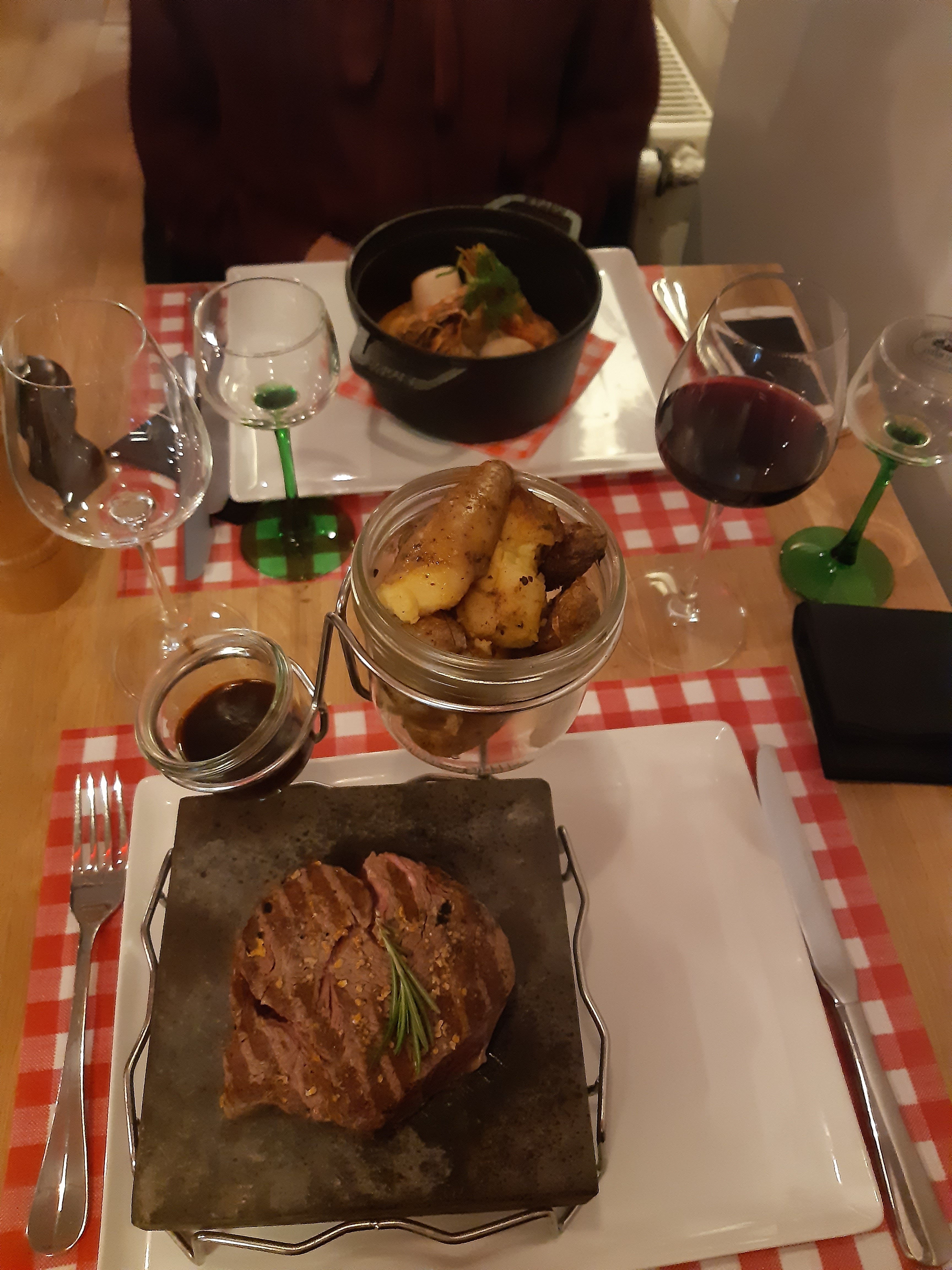 Nous étions plusieurs à table : gambas et lotte sur lit de choucroute fumée excellent ! Seulement 2 gambas pour le prix domage. Entrecôte et aiguilles de canard sur pierre chaude, idem excellent et original. On y mange très bien . Les desserts sont très bons aussi. Le cadre est original, sympa et convivial. Malgré les prix un peu élevé à mon goût, tout est tellement bon que j'y retournerai avec grand plaisir. N'hésitez pas !