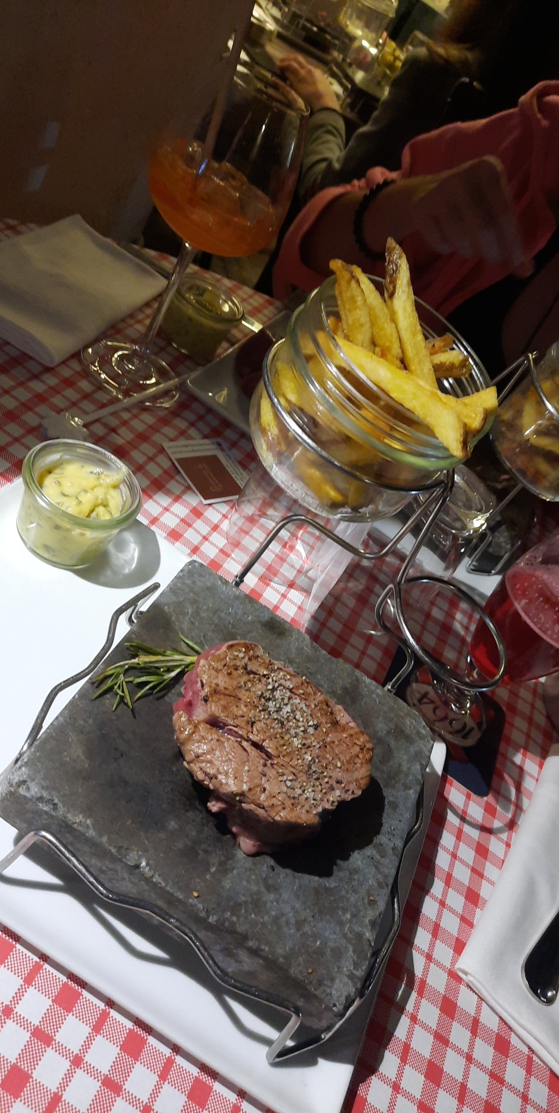 Un gros bout de viande avec du beurre chaud fondu et des frites. Ok on peut laisser la cuisson se poursuivre a note convenance mais attention aux brûlures et pas de place dans l'assiette par la suite. Une terrasse en deux temps, côté cosy et typique et côté rue piétonne/véhicules. Serveurs rapides mais manque d'échange avec les clients. Dommage lieu et cuisine au fort potentiel.