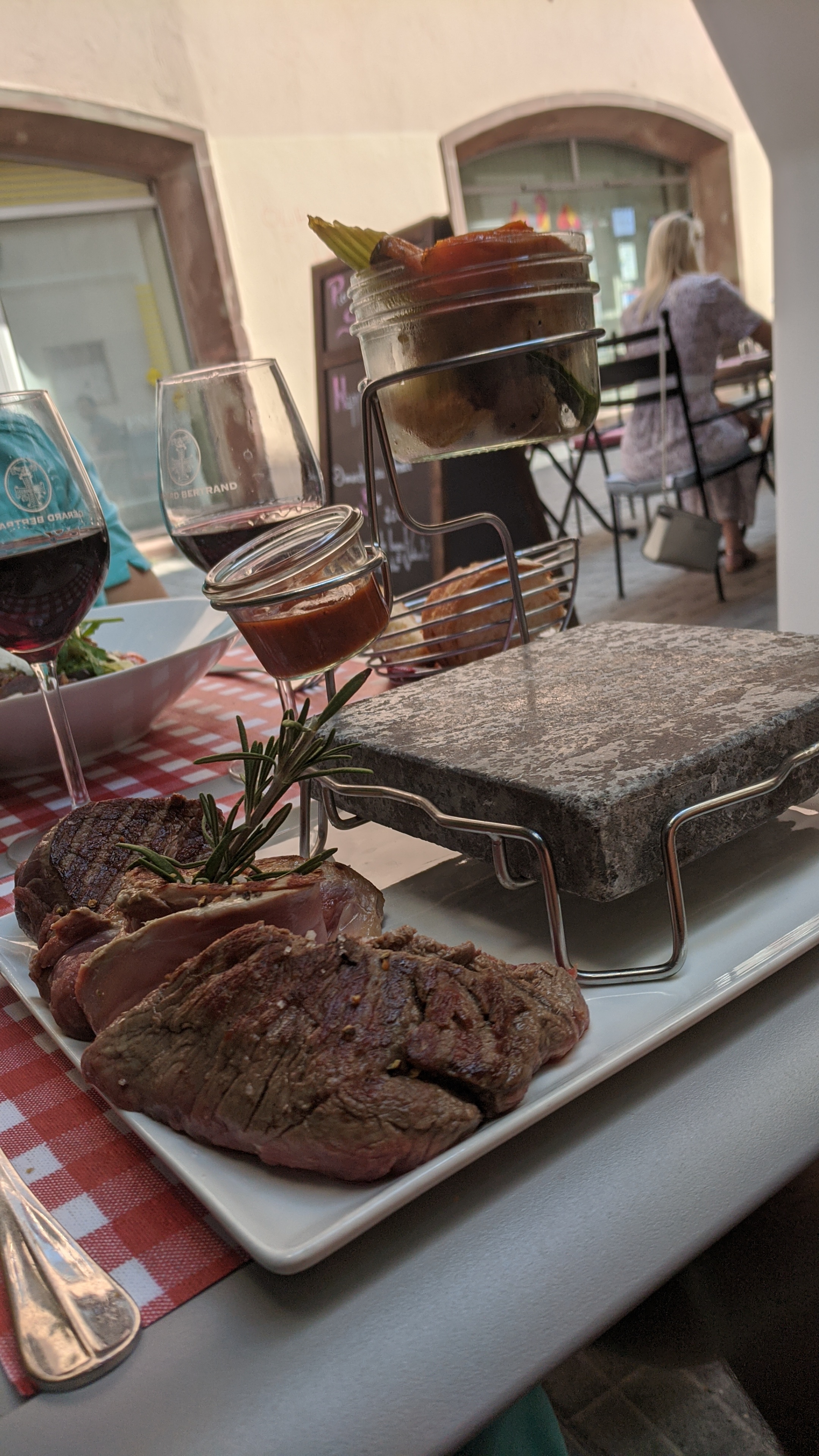 Très belle découverte avec le passeport gourmand. Avec la pierre on peut gérer à sa guise la cuisson , pièce de boeuf très généreuse. La cour intérieure ombragée vous offre calme et tranquillité. Accueil chaleureux. Equipe dynamique et souriante. Nous avons passé un excellent moment.