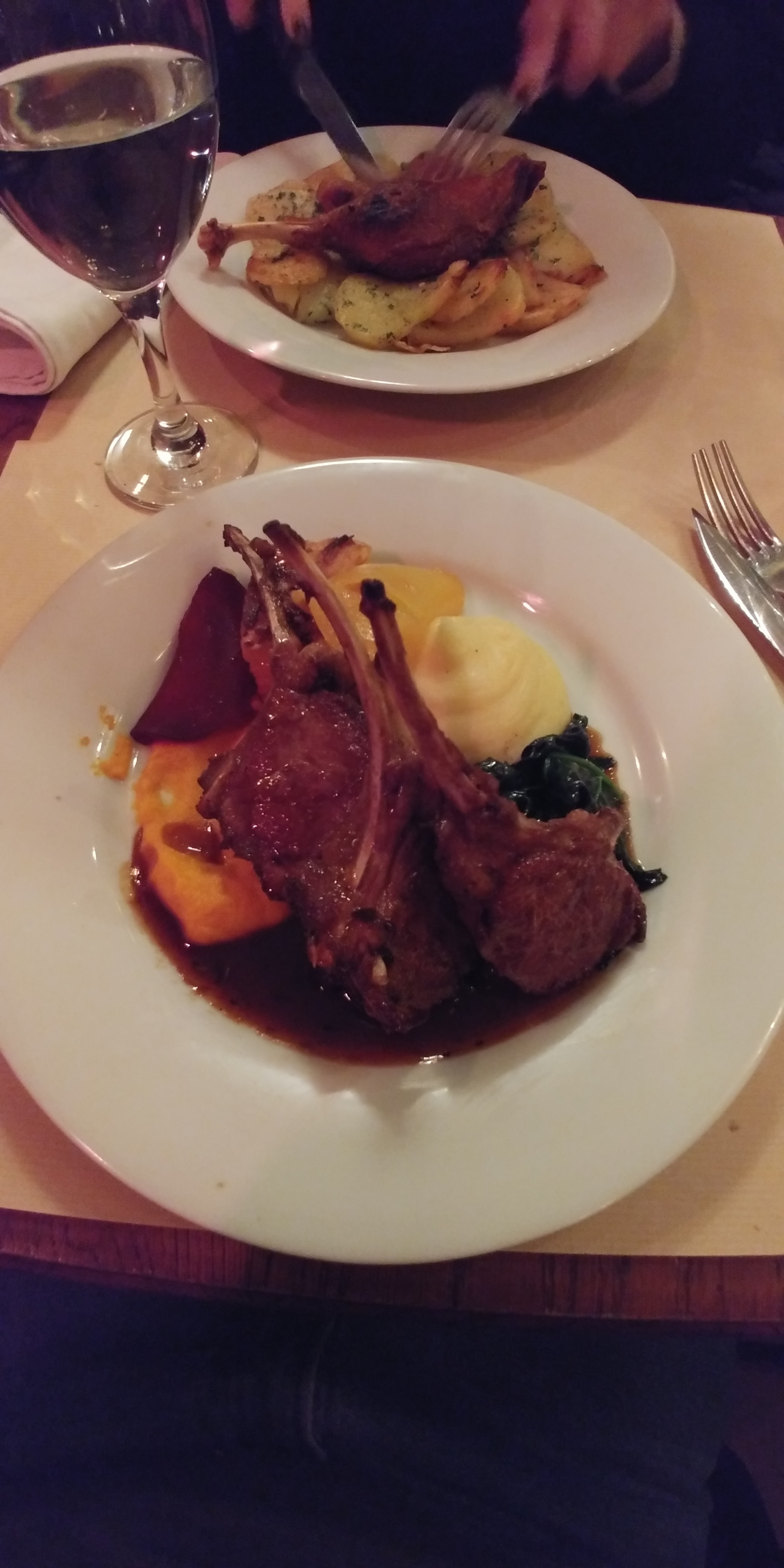 Excellente nourriture. Ma femme et moi avons pris le magret de canard et le carré d'agneau. La viande était parfaitement préparée et servie avec de délicieuses pommes de terre rôties et des haricots verts. Je recommande vivement ce restaurant à mes amis et à ma famille !